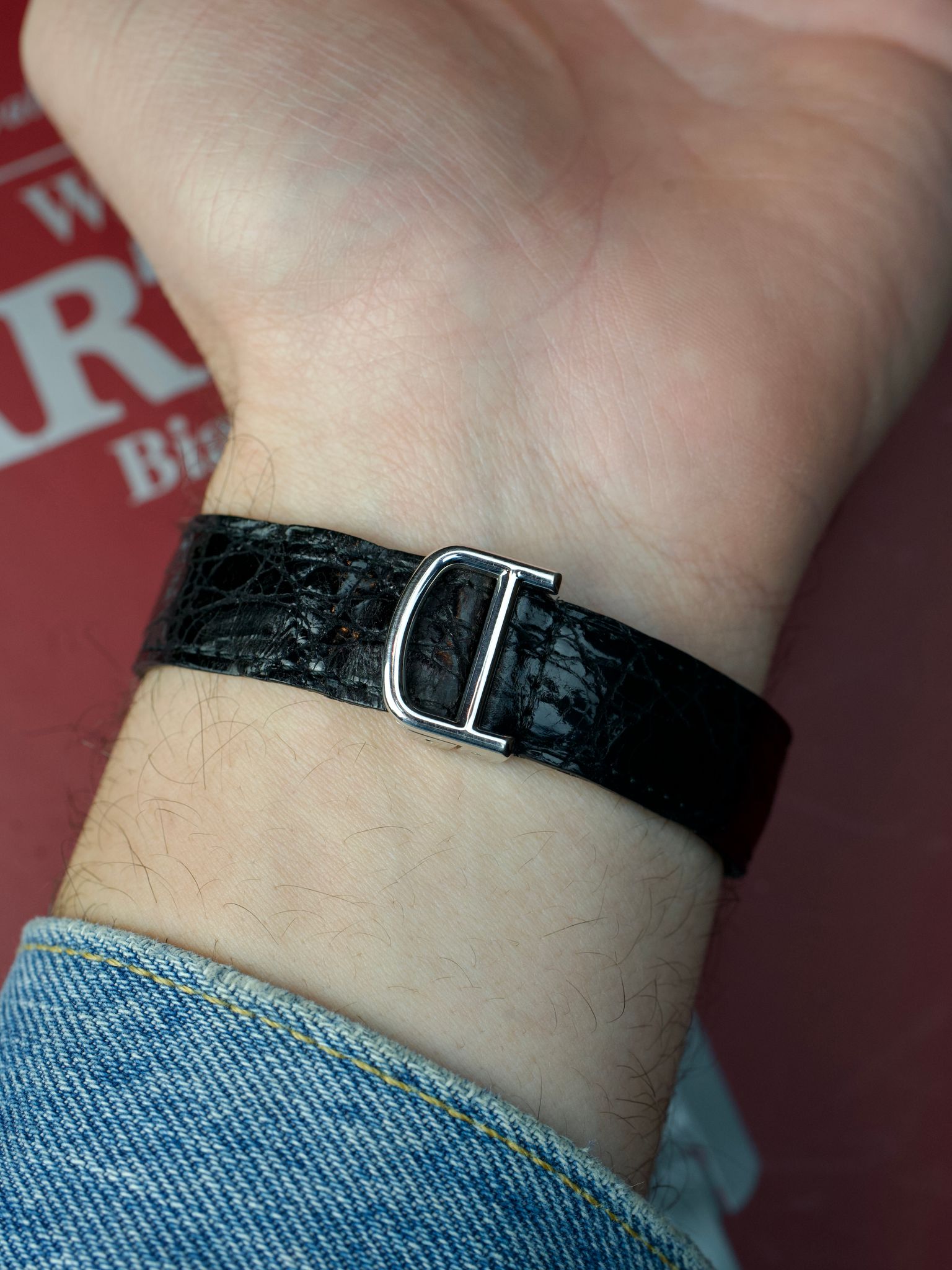 The vintage watch comes with the period correct 18 carat white gold deployant folding clasp on original Cartier leather strap. Showing the case back sticker, the watch indicates almost unworn condition.