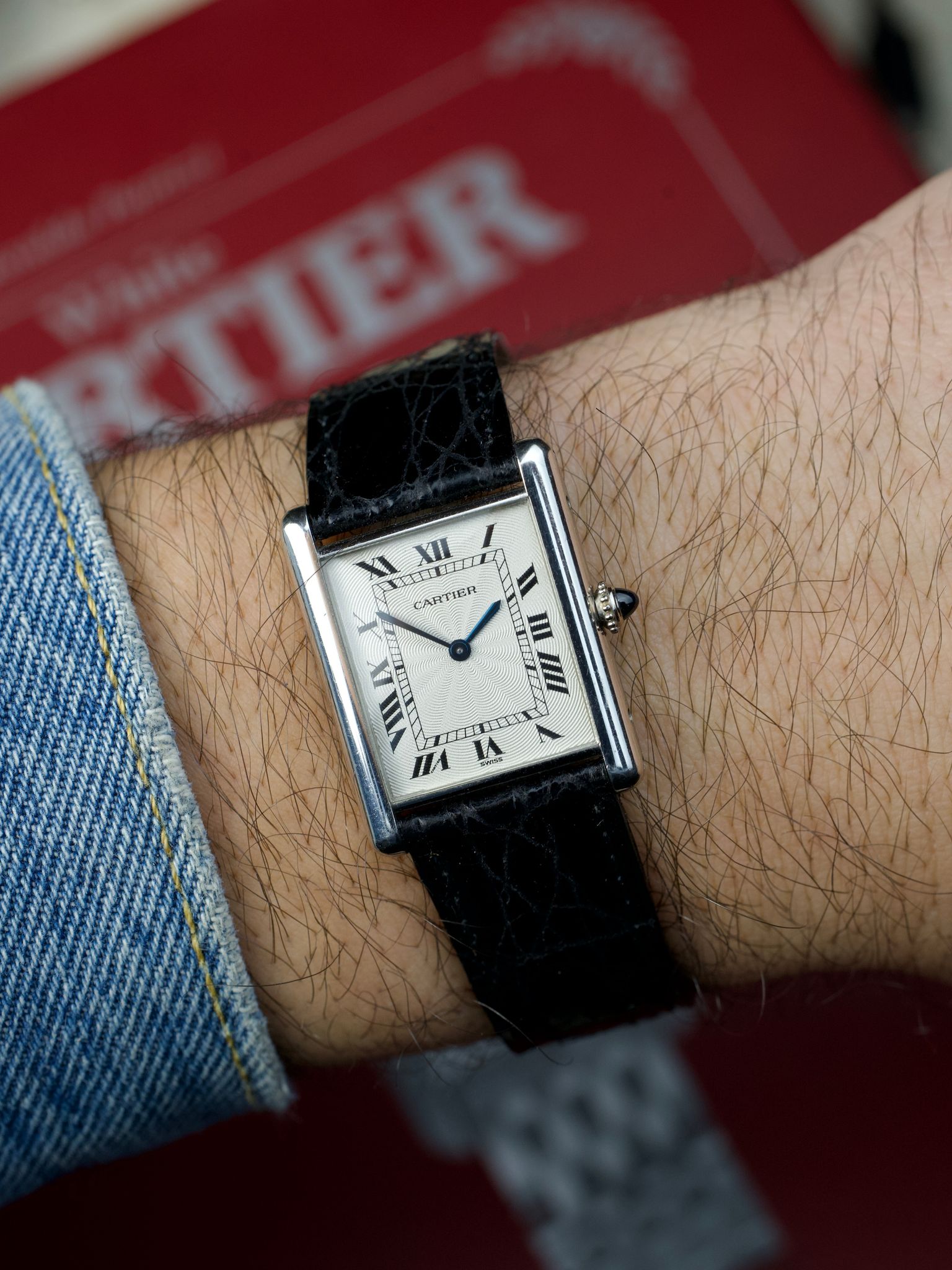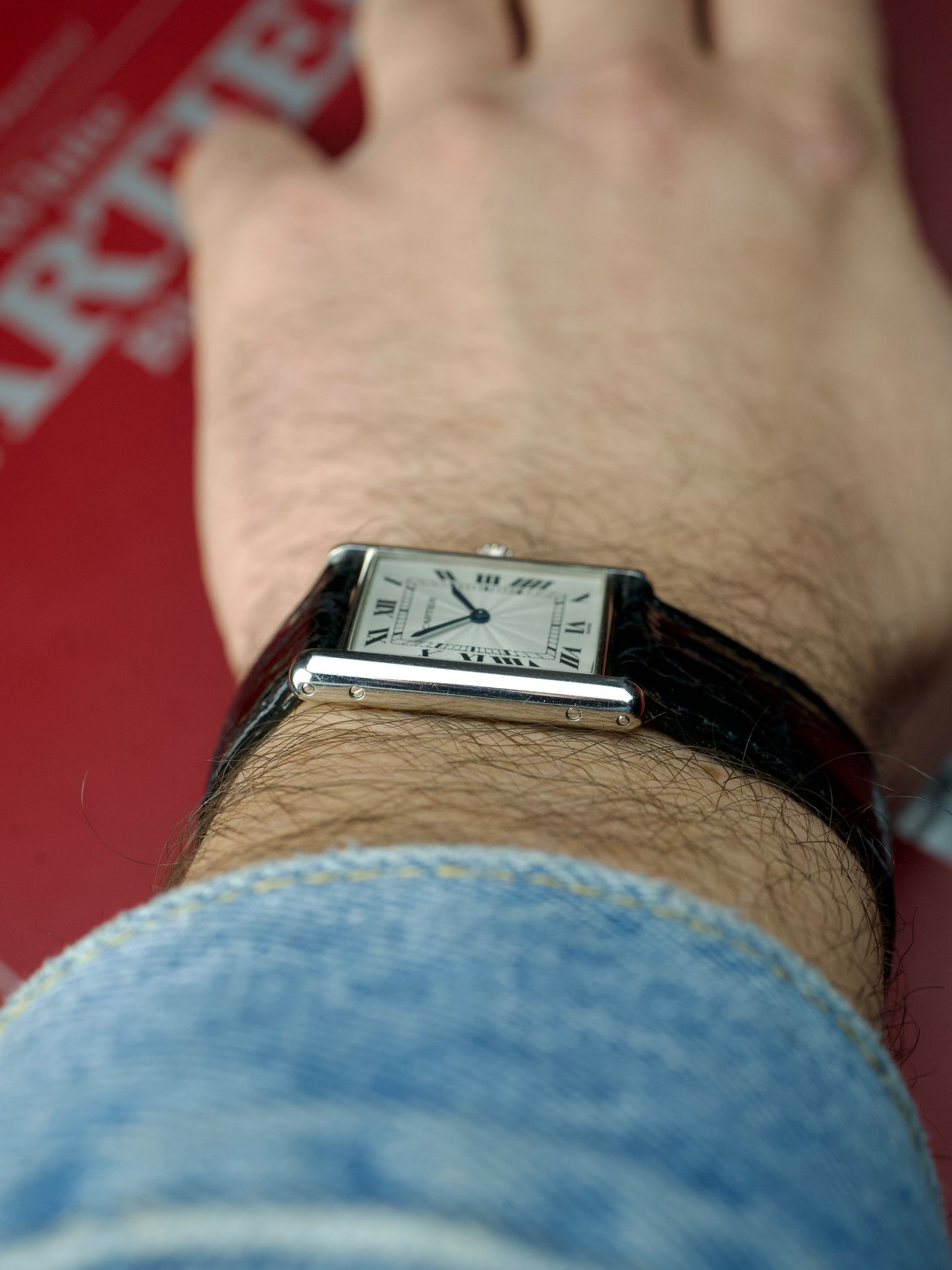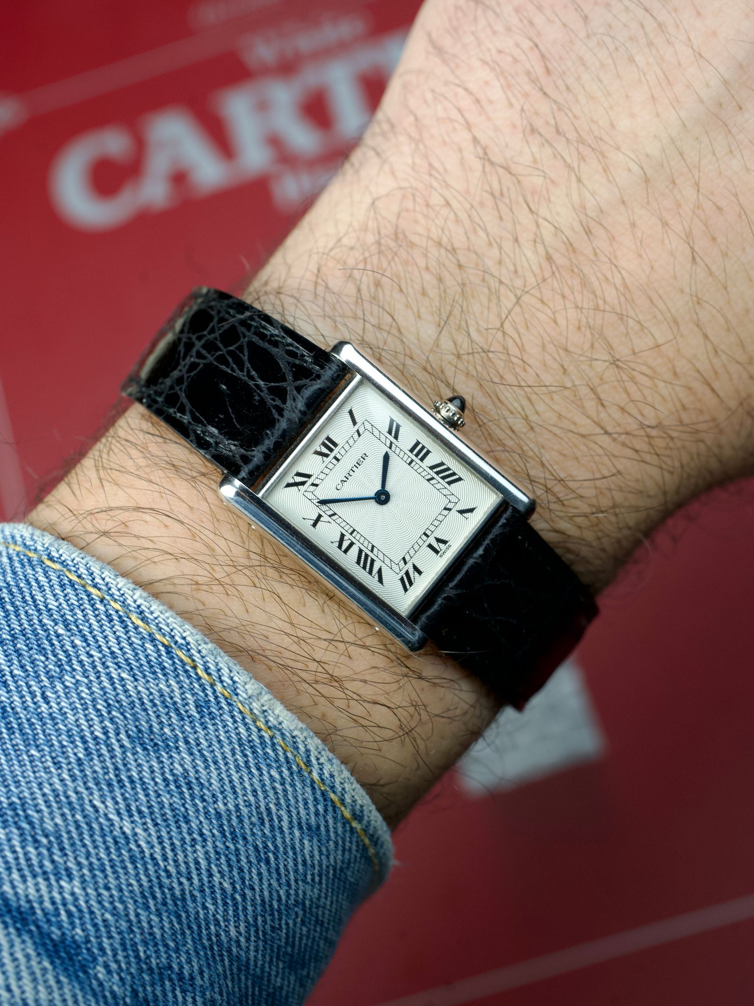 The platinum case measures 23mm x 30mm, a modern and sensible size. The mechanical hand-wound movement is powered by the legendary Frederique Piguet caliber 21, which makes the case just 5mm thin. Overall, this Tank Louis is in excellent condition.