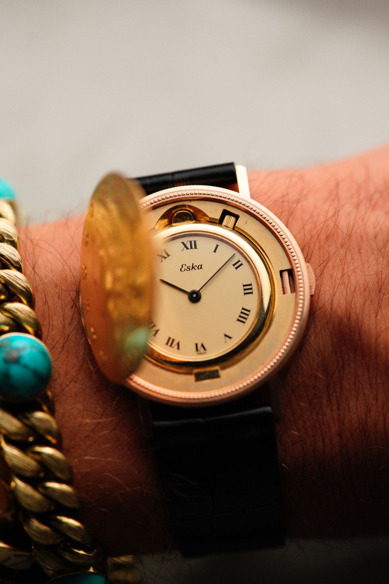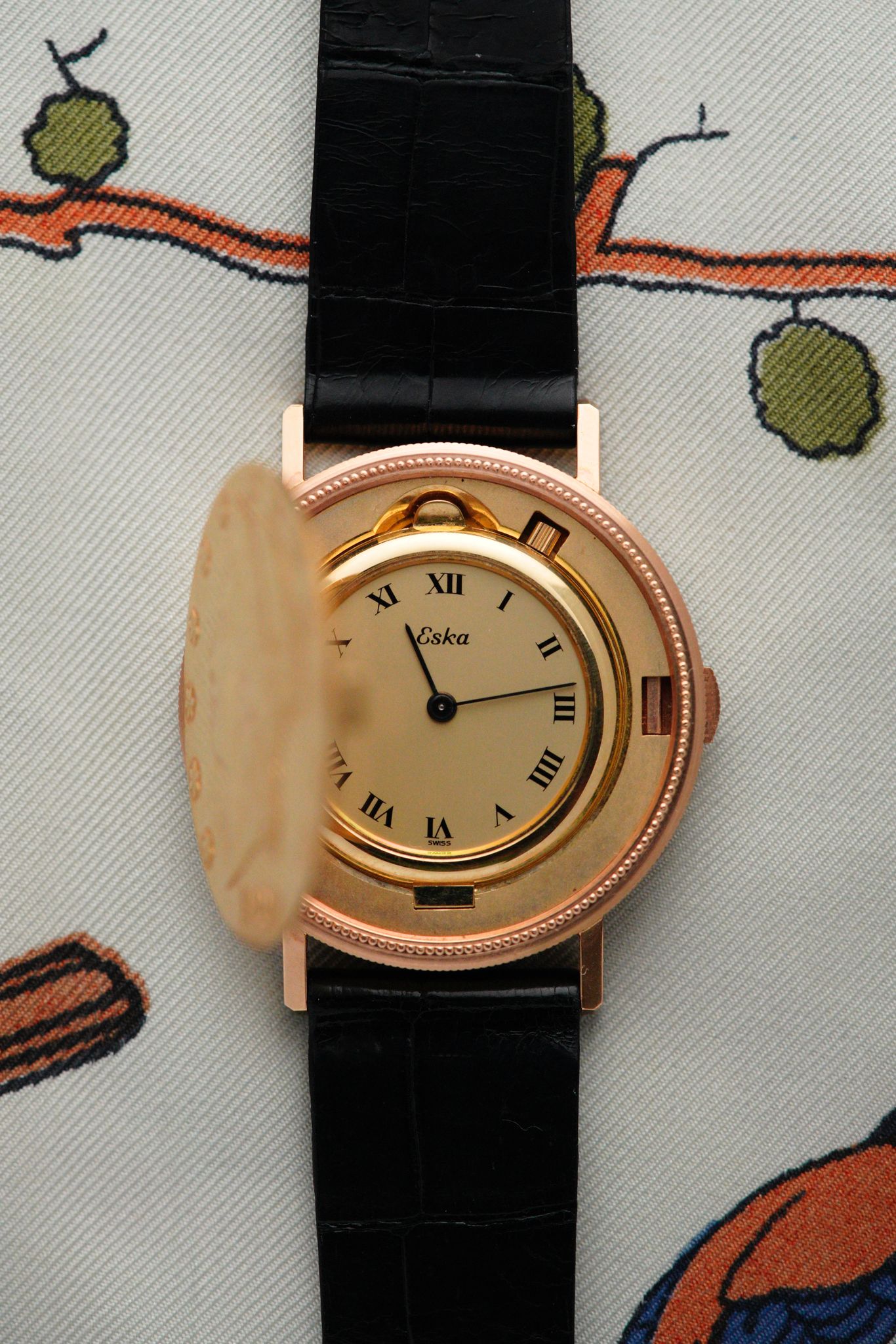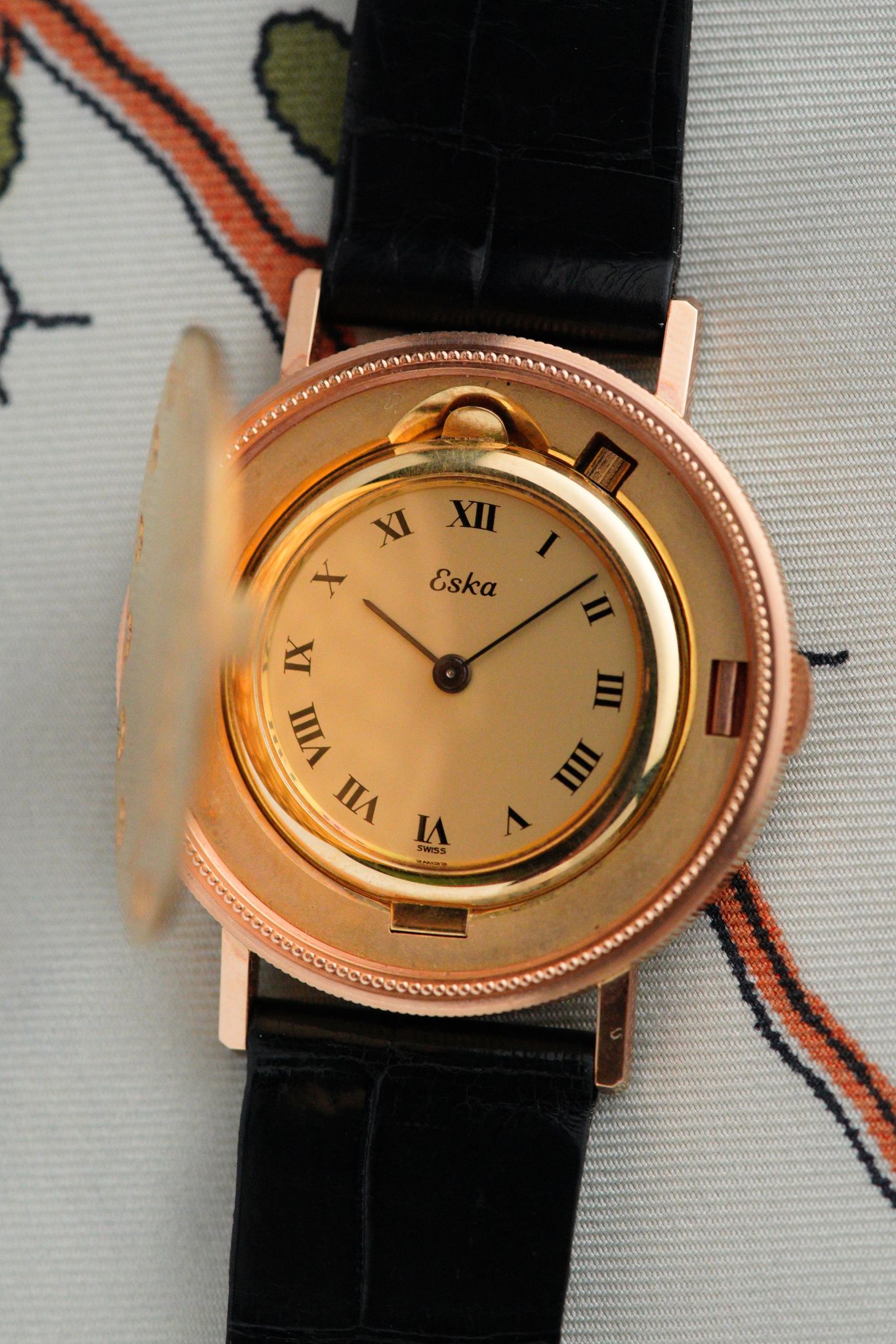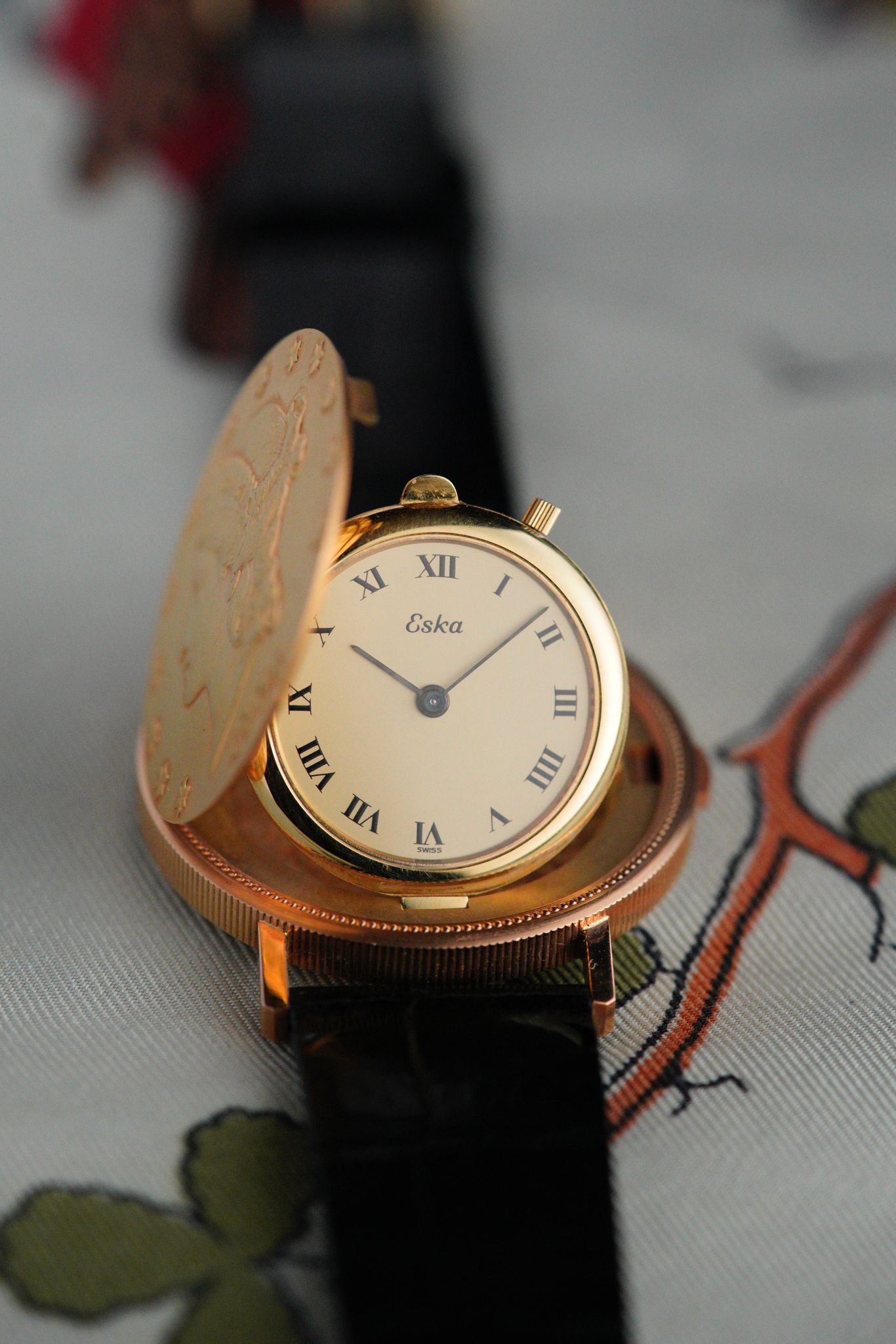 Imagine a solid gold coin. Now cut it in half, hollow it out, build hinges, a hidden opening system and to top it up, add a fully operating watch inside. These coin watches were popular in the 1970s and 80s and were produced only for a small period of time.