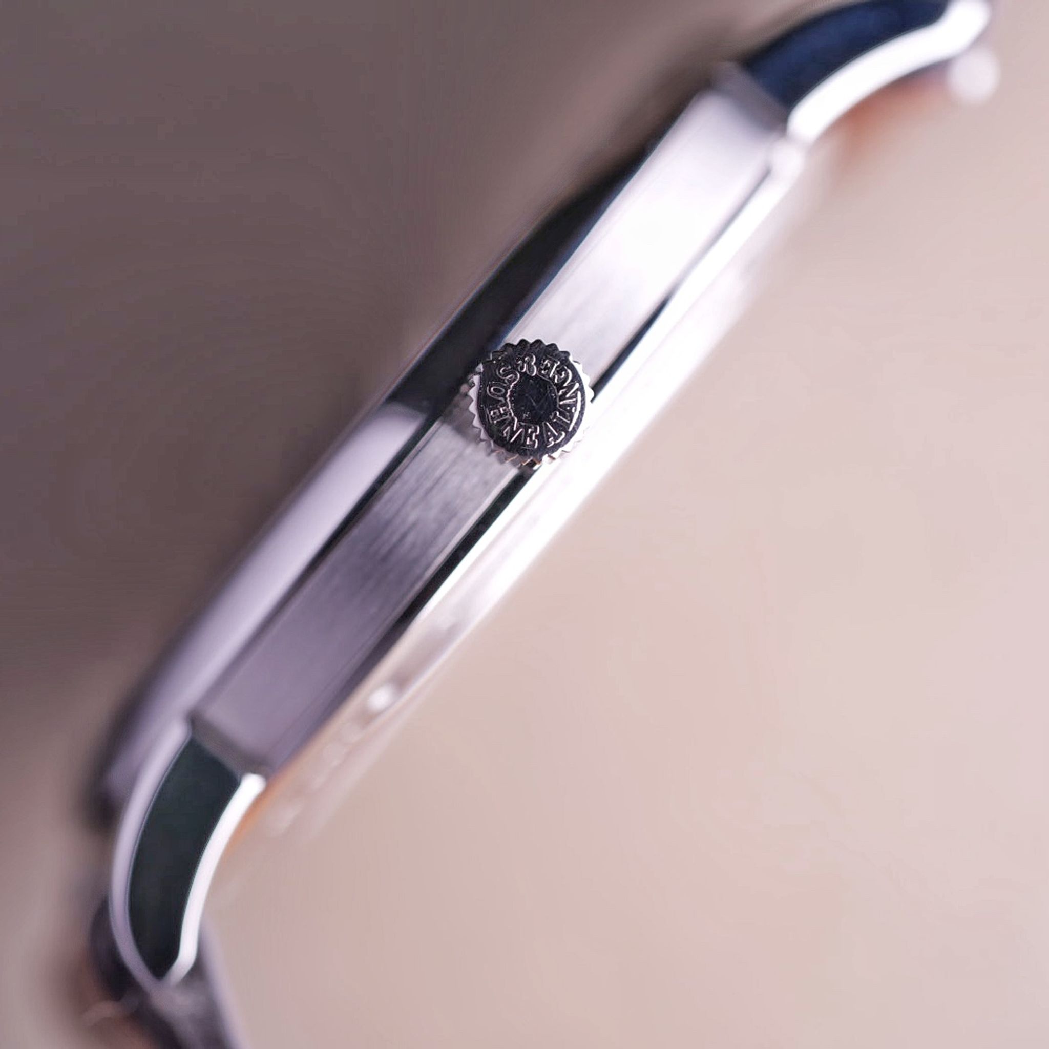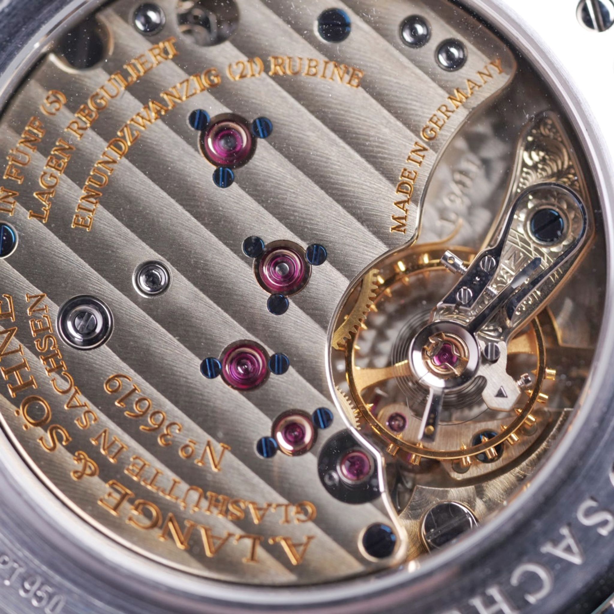 36mm platinum case, silver dial, blued hands — powered by the stunning hand-wound Caliber L941.1, with German silver plates, blued screws, hand-engraved balance cock fully visible through a sapphire caseback.