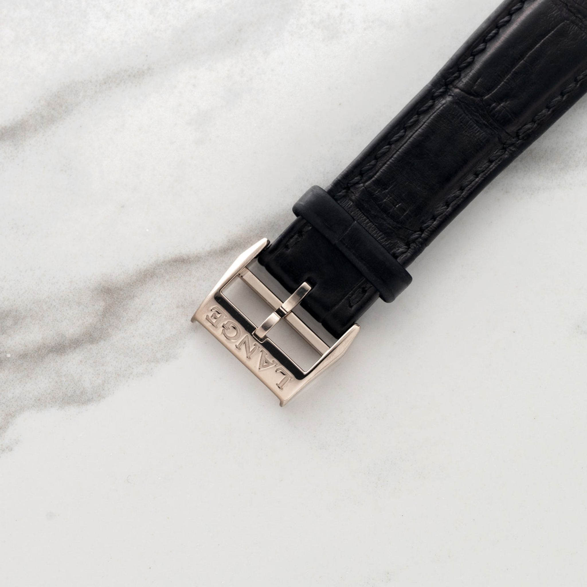 Bracelet: Two piece gator strap in black and correct Lange pin buckle in 18k white gold. Crystal: Clear.