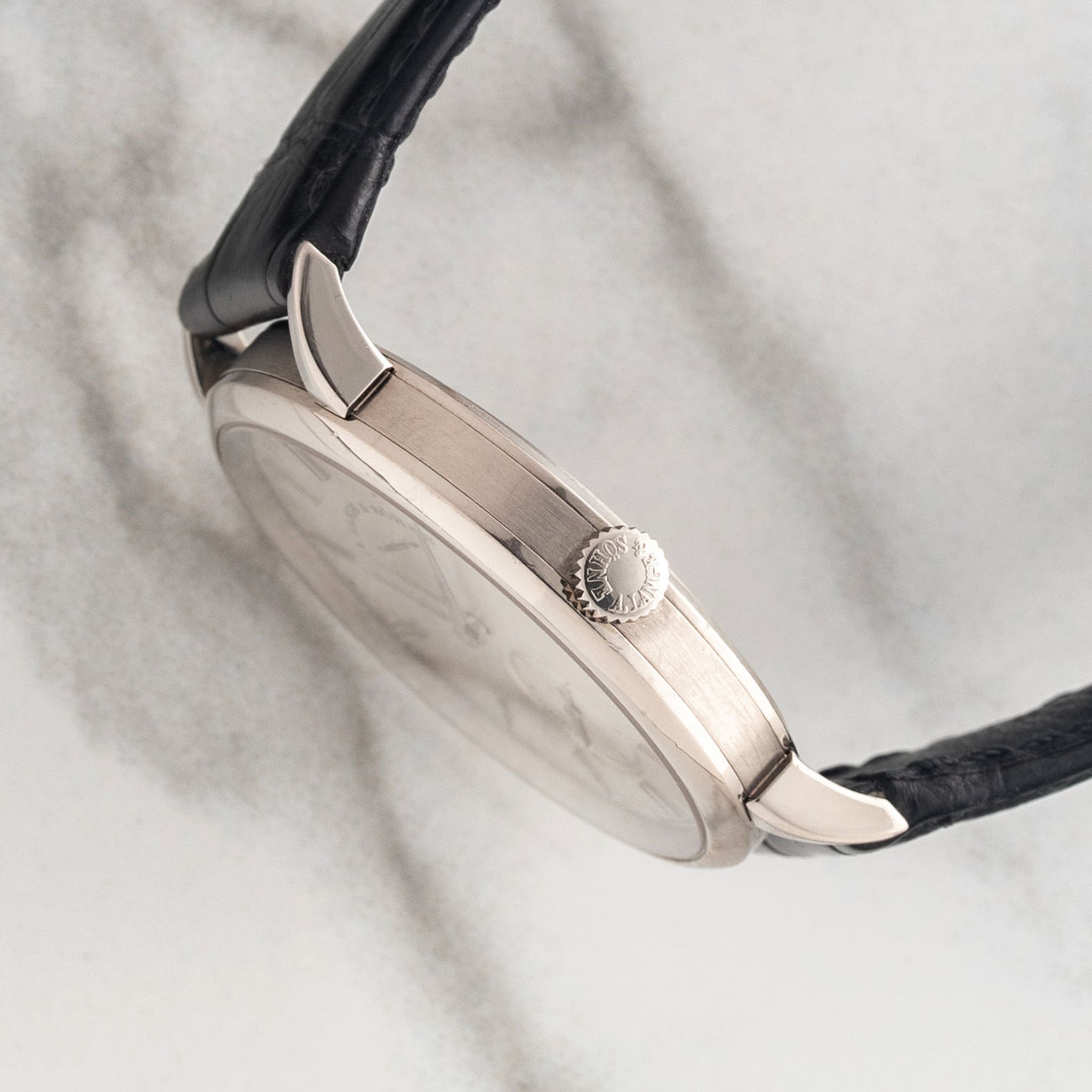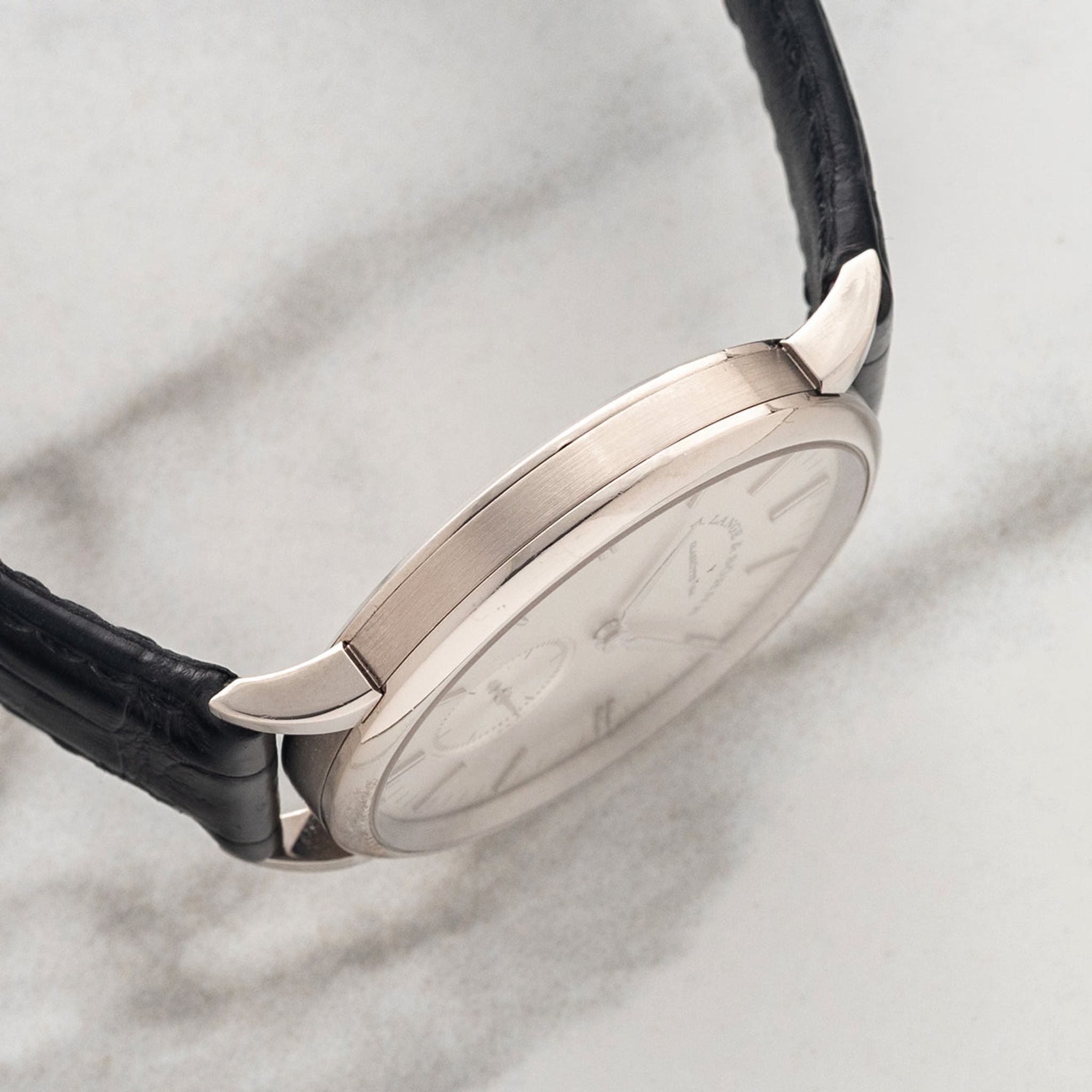 The Saxonia was first released in 1994 and today is appreciated for its prototypical design and impressive build quality on the level of the "Holy Trinity." This "time-only" is a modern example housed in 18k white gold with display back to show its high-grade manual winding movement which features manual winding and a 45 hour power reserve. At 35mm it is one of the most elegant feeling Lange pieces on the average sized wrist. We love the monochromatic look of this piece is understated and can be paired with a myriad of strap options. The example has remained in very nice shape with a mint dial/hands and a strong case with deep and crisp markings. It includes its 18k Lange signed pink buckle.