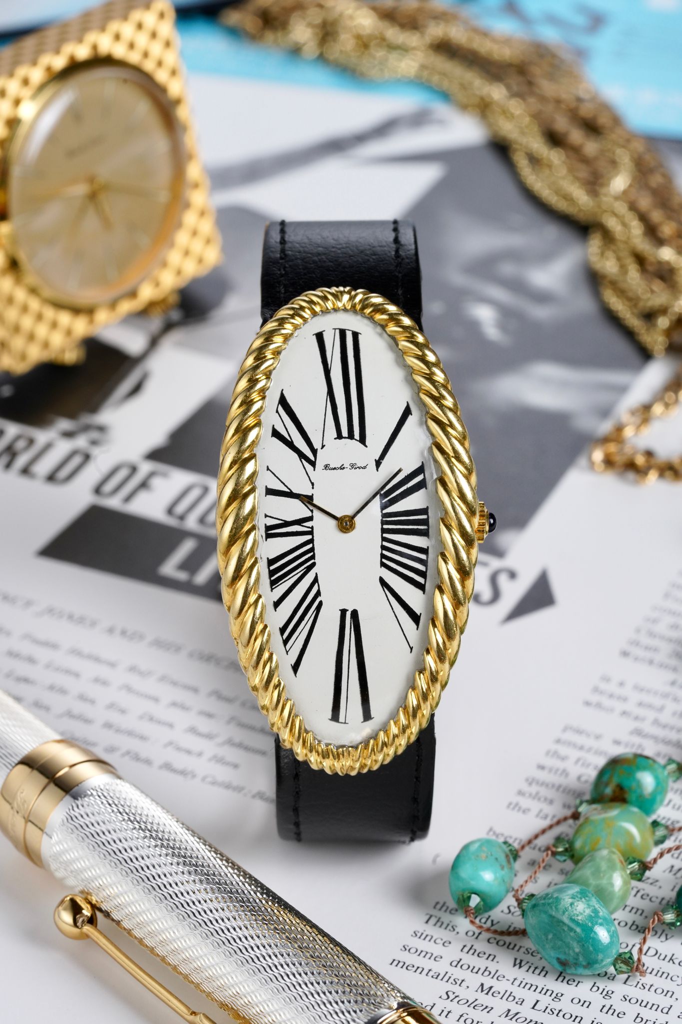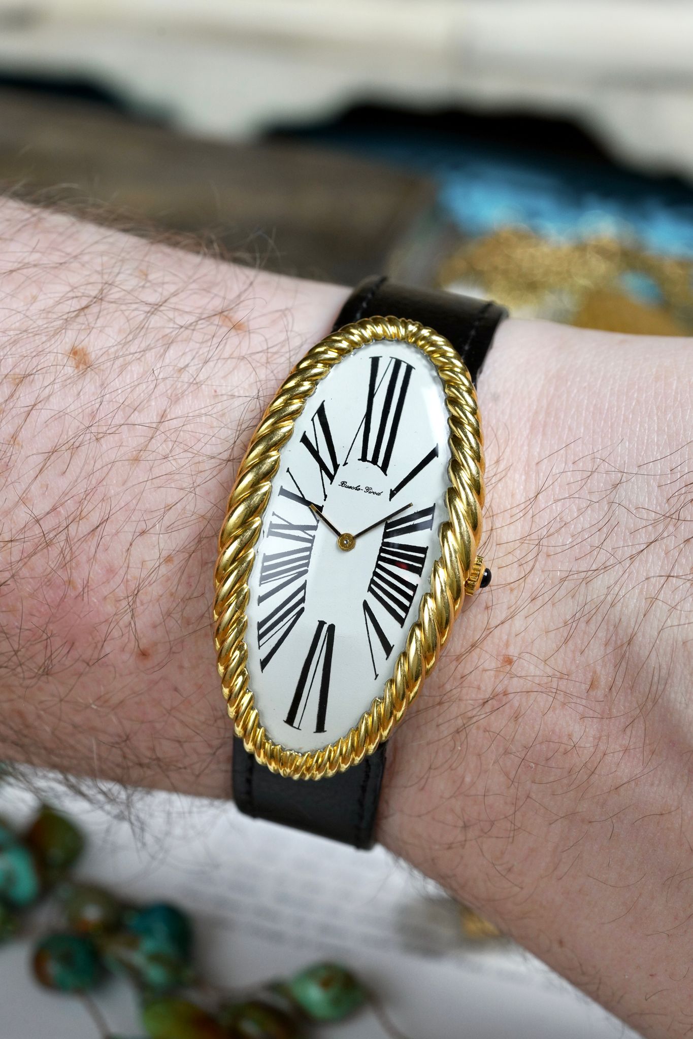 A rare and exceptional Maxi Oval by Bueche Girod, an absolute grail, with its 18K yellow gold ribbed 55mm long curved case, exploded Roman numeral dial and manual wind caliber.