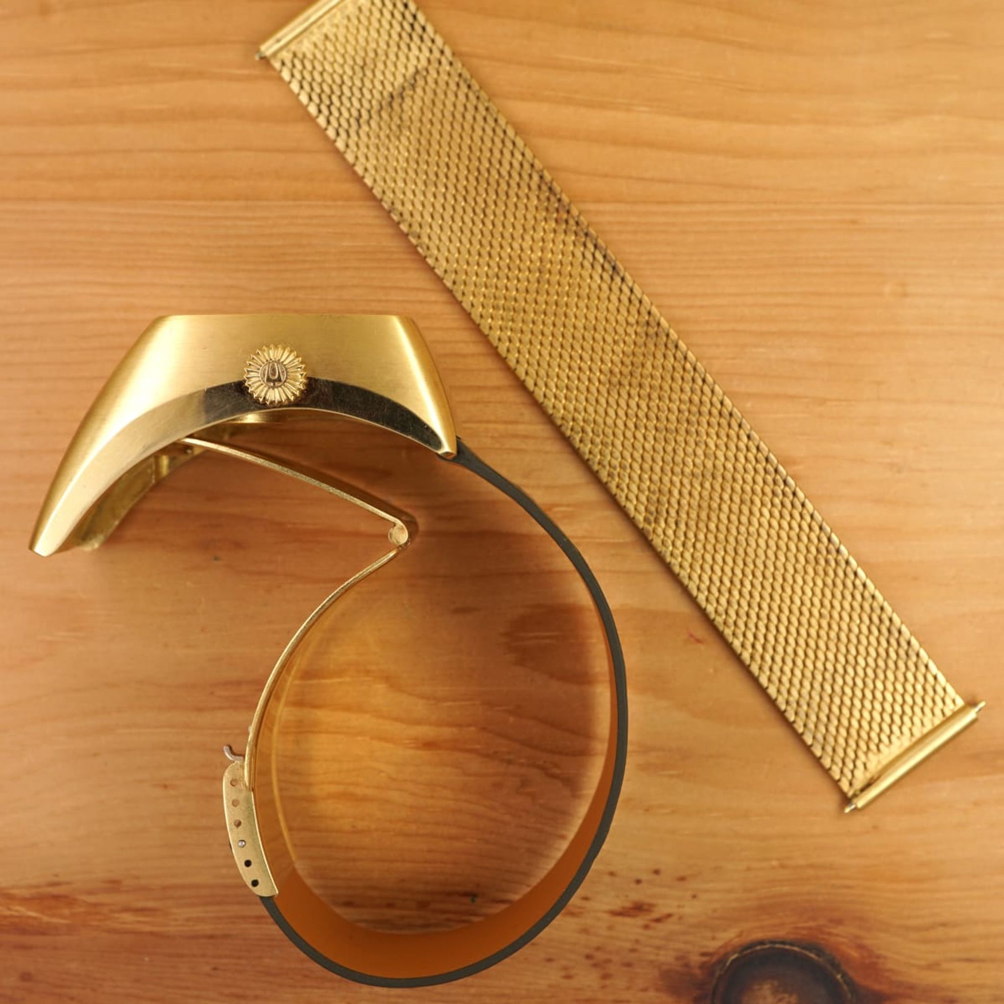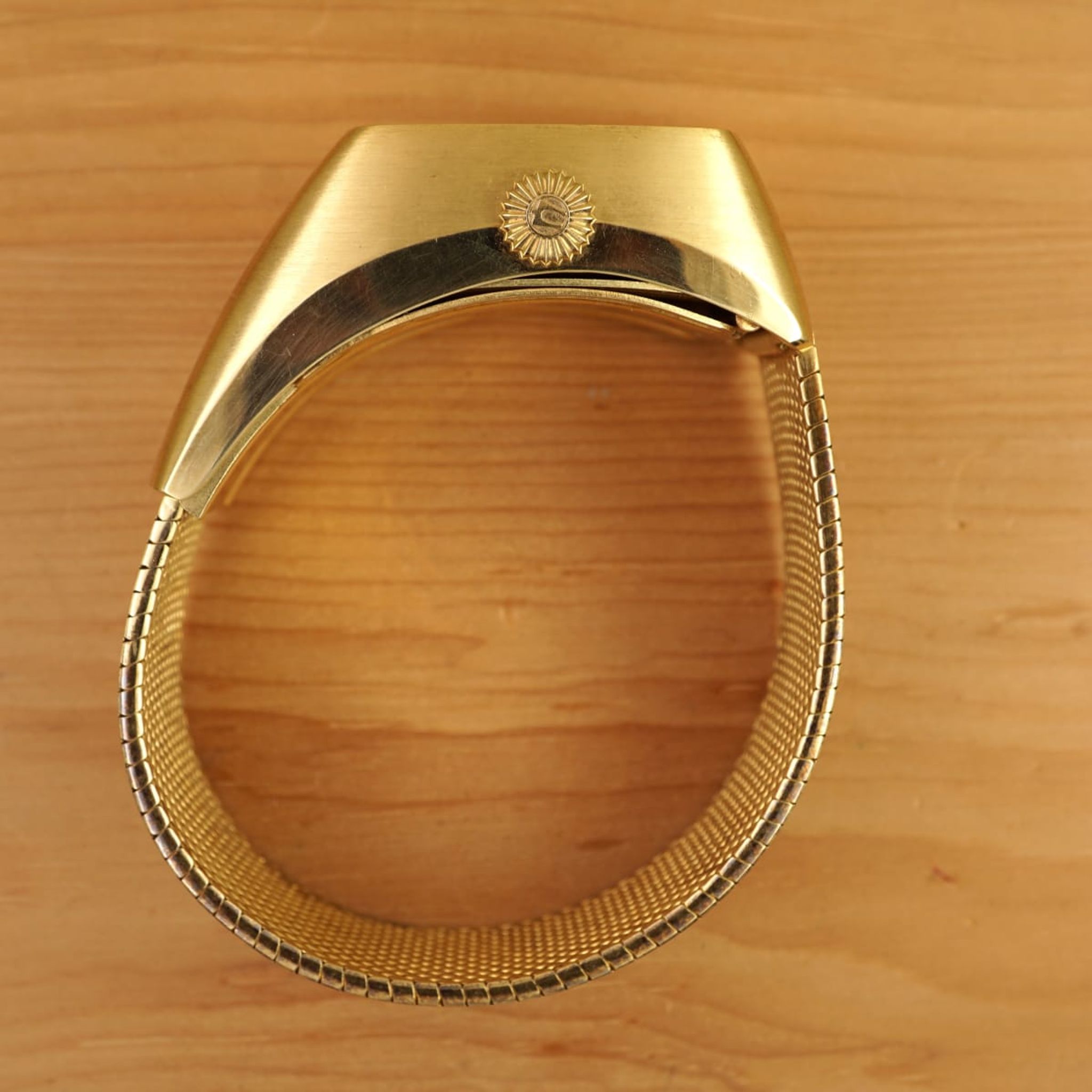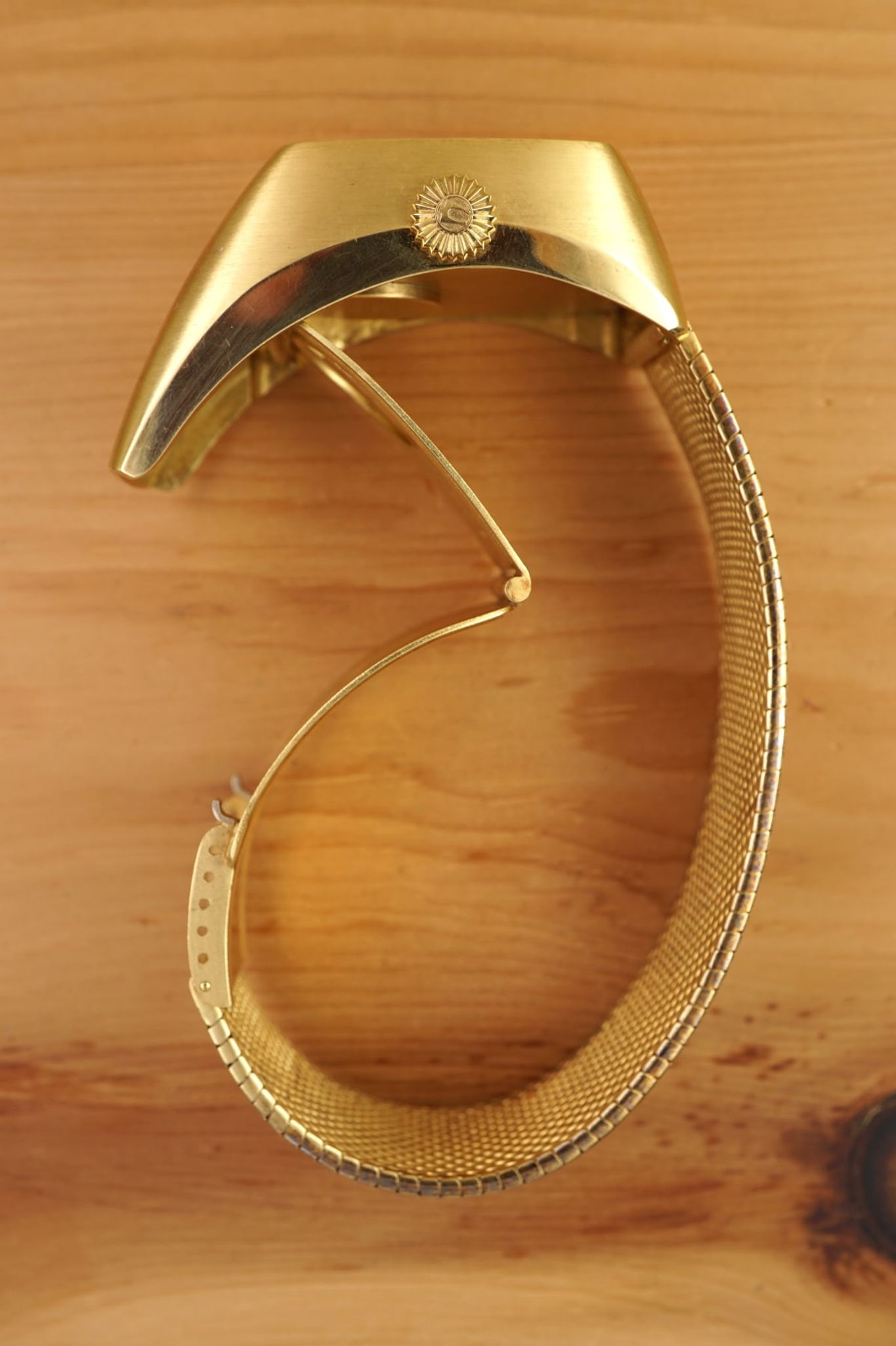 It is a unique watch in many aspects: with its weight we can expect that most of these were smelted in the last 50+ years. We know of two others, but not in such unpolished condition and not with the characteristic folding-clasp and both without the original bracelet as well. Interestingly the battery-compartment is visible on the case-back and there is a whole crafted in the folding-clasp for it. The milanaise-bracelet is removable, so the watch could be worn with a custom-made leather strap -- green ostrich for now, but there are endless options -- and the click, when the below-case clasp closes tight, is just amazing.