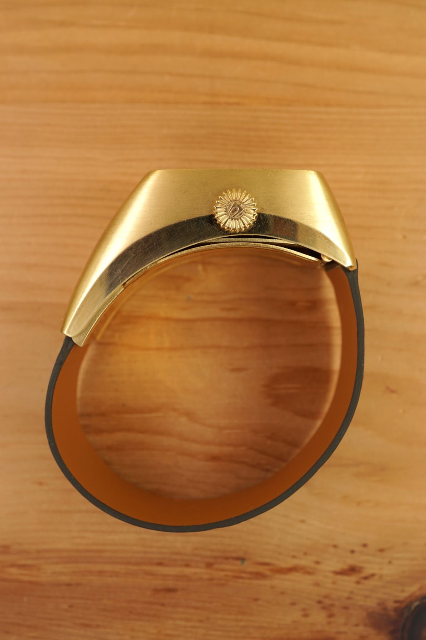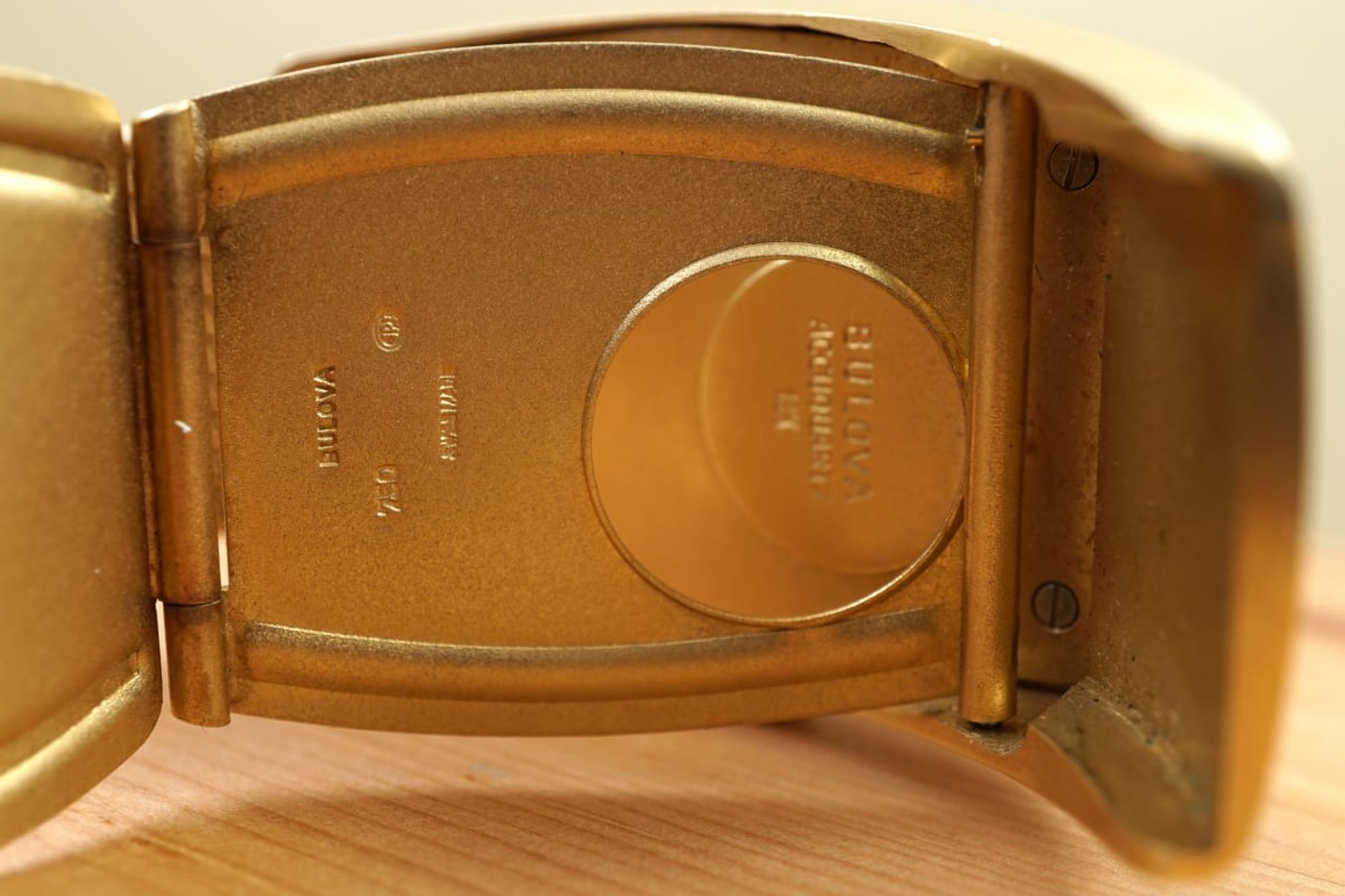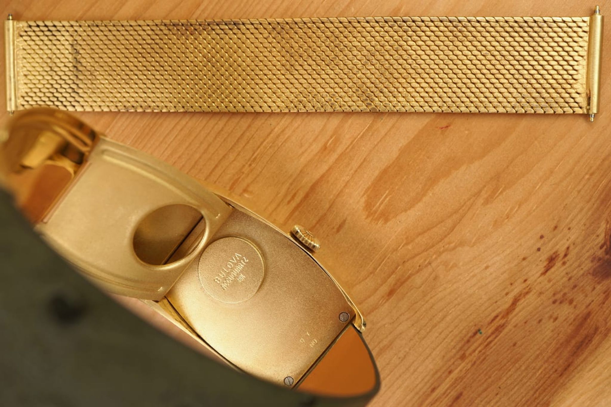 It is a unique watch in many aspects: with its weight we can expect that most of these were smelted in the last 50+ years. We know of two others, but not in such unpolished condition and not with the characteristic folding-clasp and both without the original bracelet as well. Interestingly the battery-compartment is visible on the case-back and there is a whole crafted in the folding-clasp for it. The milanaise-bracelet is removable, so the watch could be worn with a custom-made leather strap -- green ostrich for now, but there are endless options -- and the click, when the below-case clasp closes tight, is just amazing.