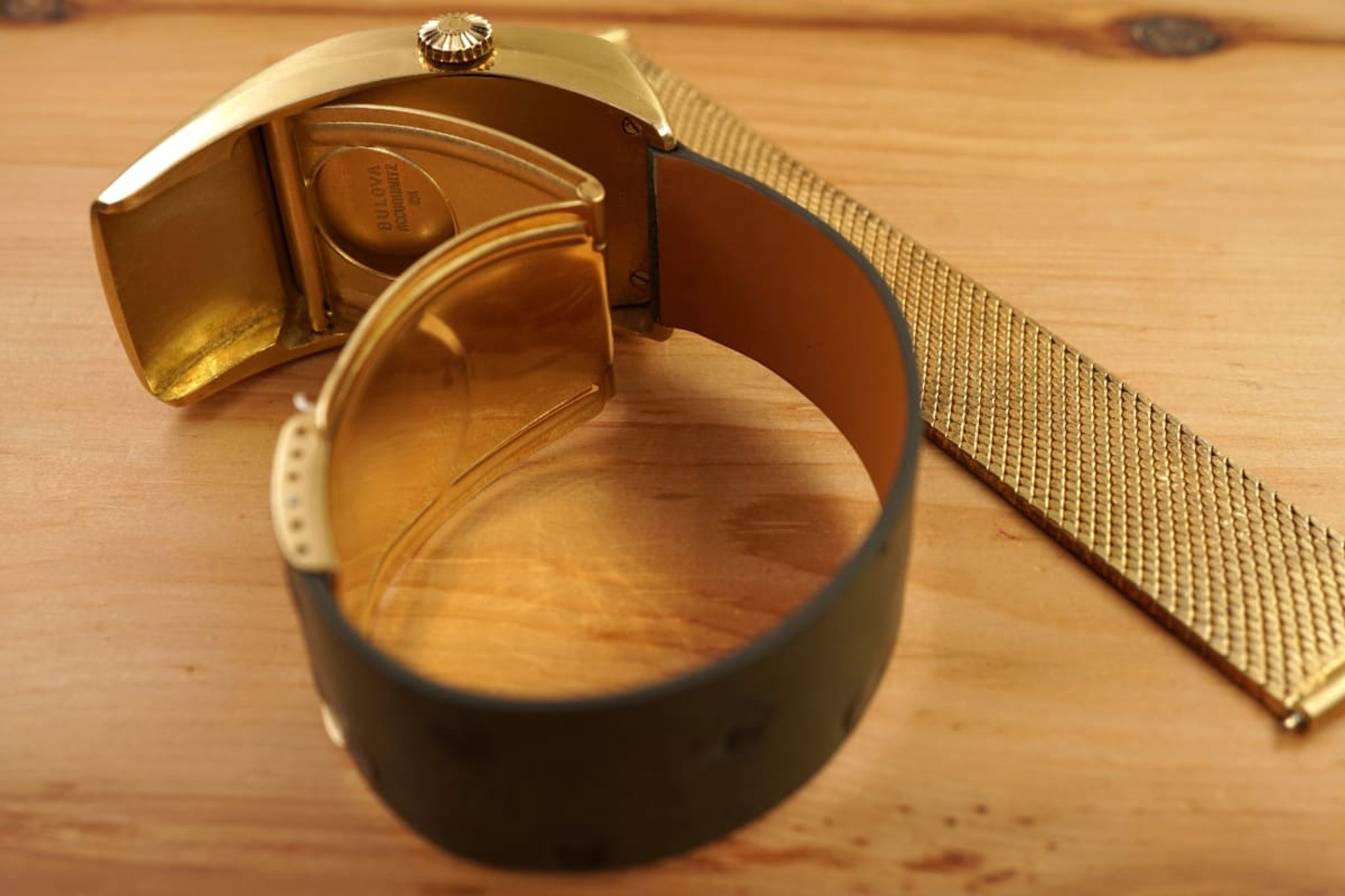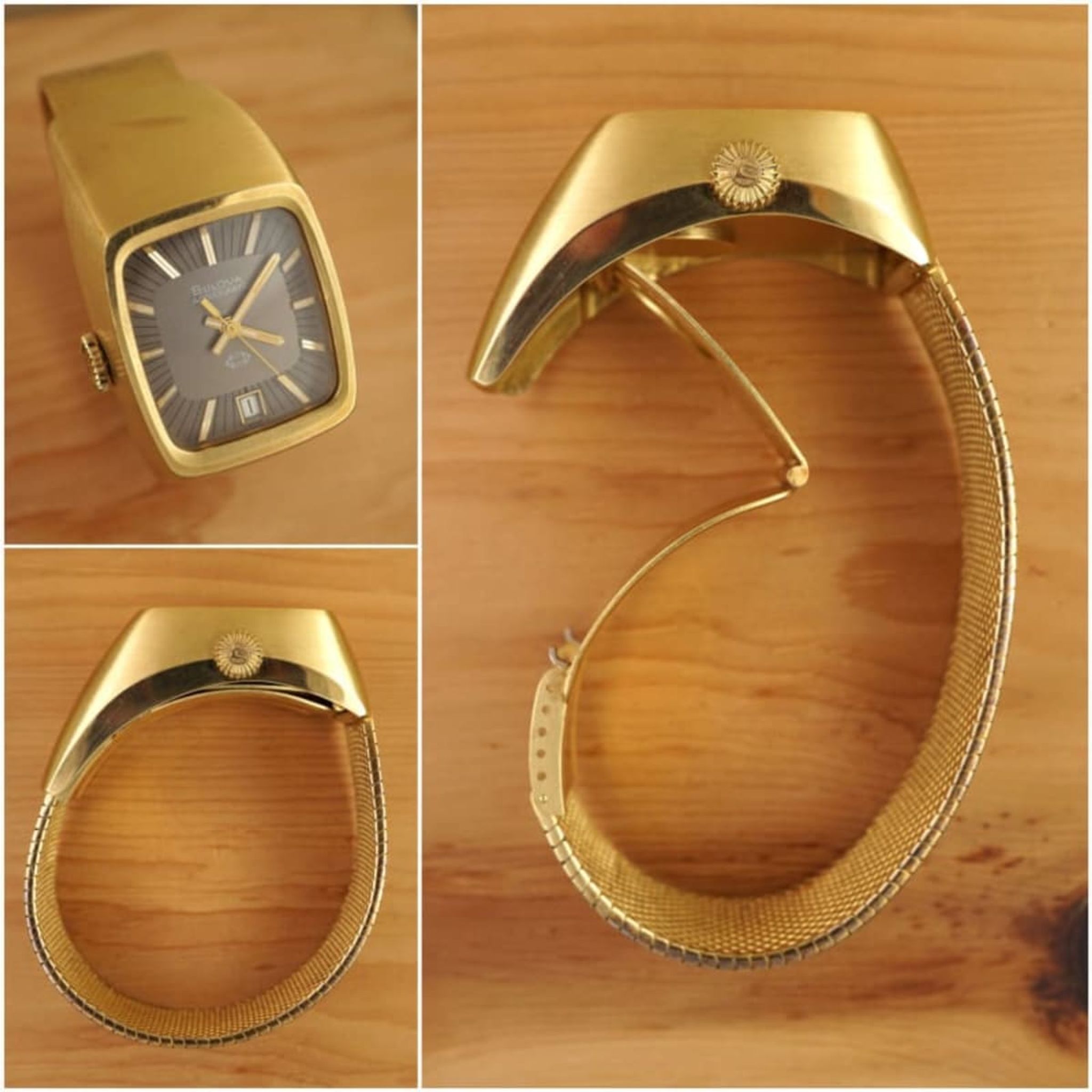Yes, heavy with more than 250g all solid 18K yellowgold. The case and the below-case folding clasp with the integrated Milanaise bracelet -- made by the star of the scene Jean-Pierre Ecoffey for Bulova. The flawless two-tone face of the watch bows to the wearer like a driver-watch, and it does so because of its alien-head-like curved shape.