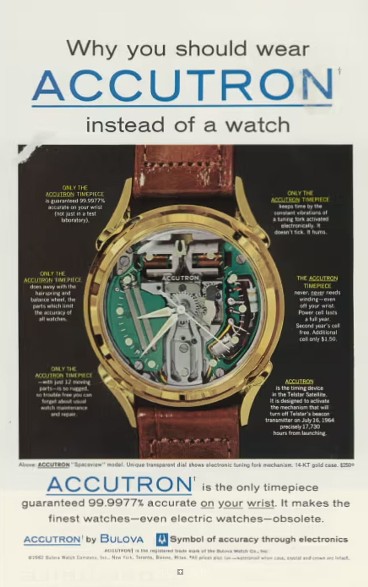 WHY WE LOVE IT? The Accutron was presented in late 1960 and the cal214 tuningfork-movement was the first electronic watch -- obviously a revolutionary concept, superior to mechanical watches and the first step on a road to highest precision.