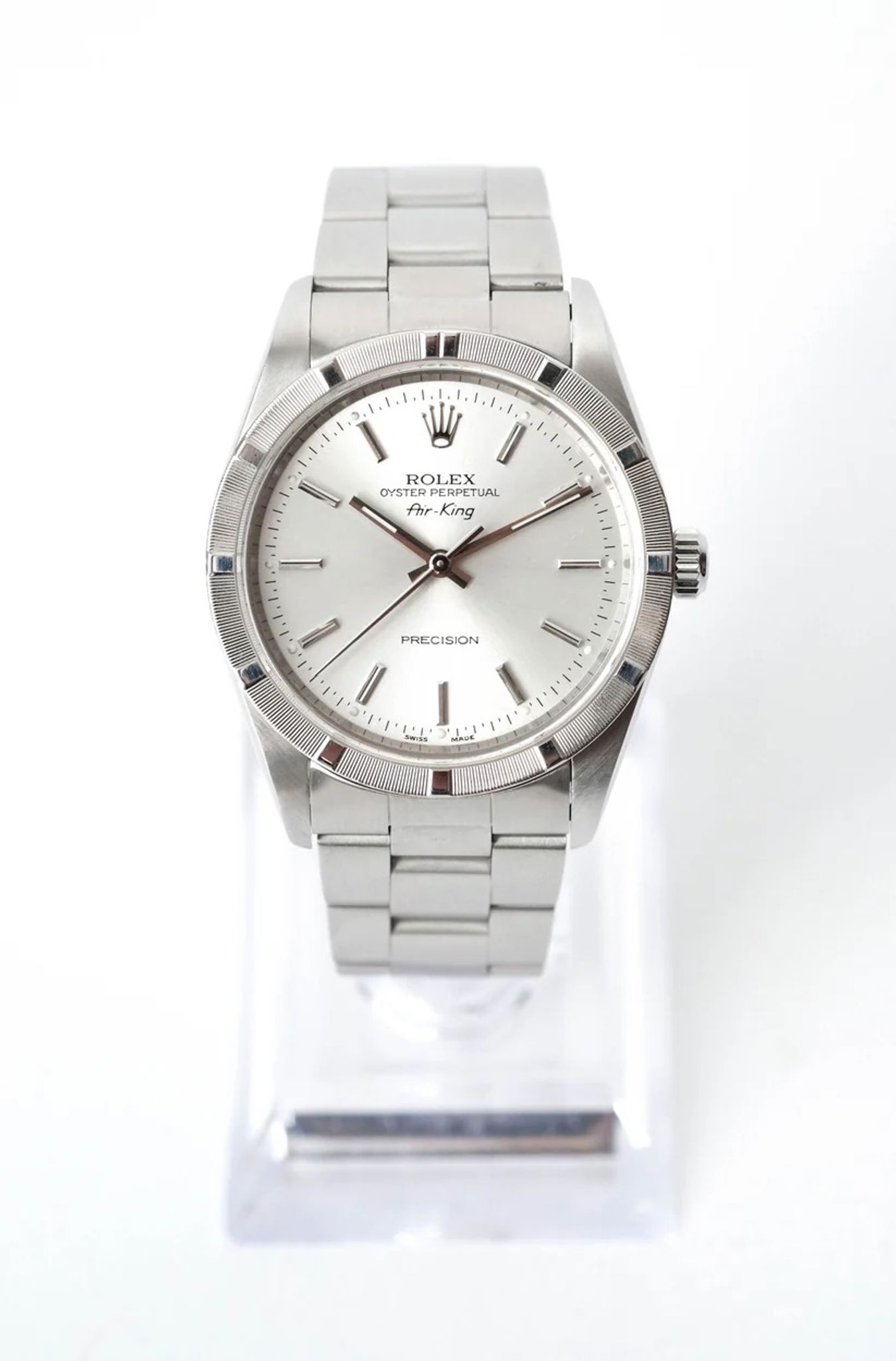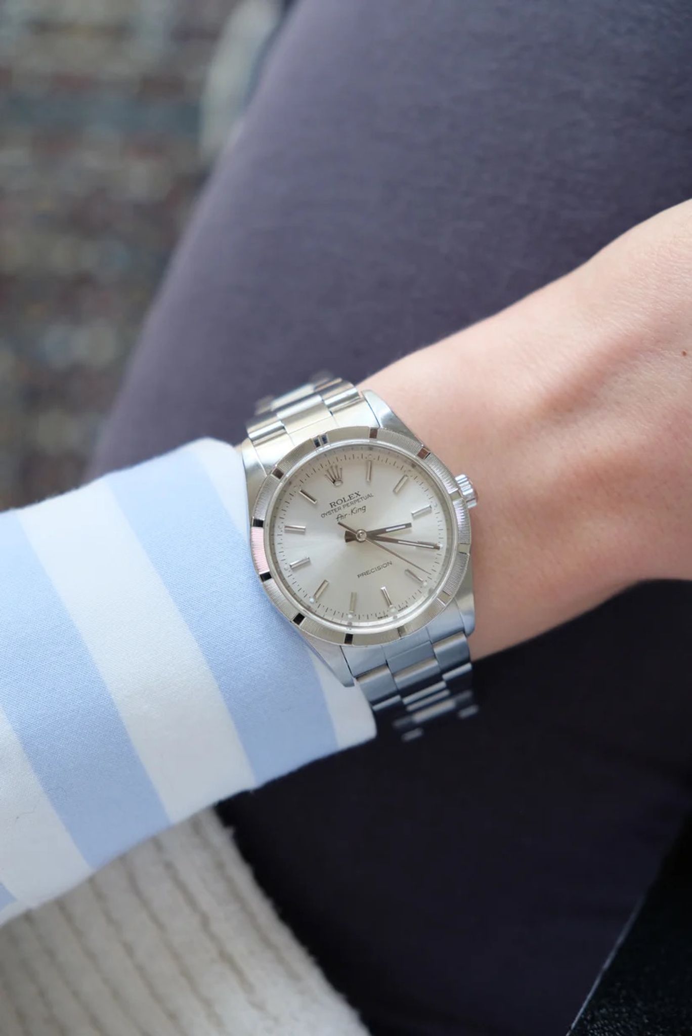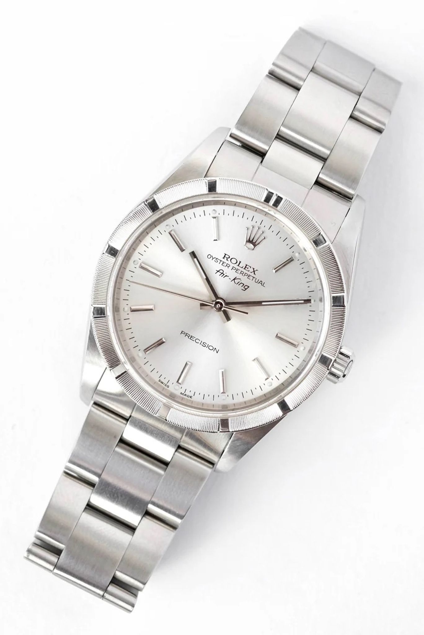 The Air King gathers all the features that made Rolex watches famous, starting with the waterproof Oyster case, here in a harmonious 34mm. The easily adjustable steel bracelet and the automatic movement make it a watch that as comfortable as practical. The silver dial is the most iconic at Rolex, the simplest. The engine turned bezel is on the other end a rarer detail that only connoisseurs will recognize.