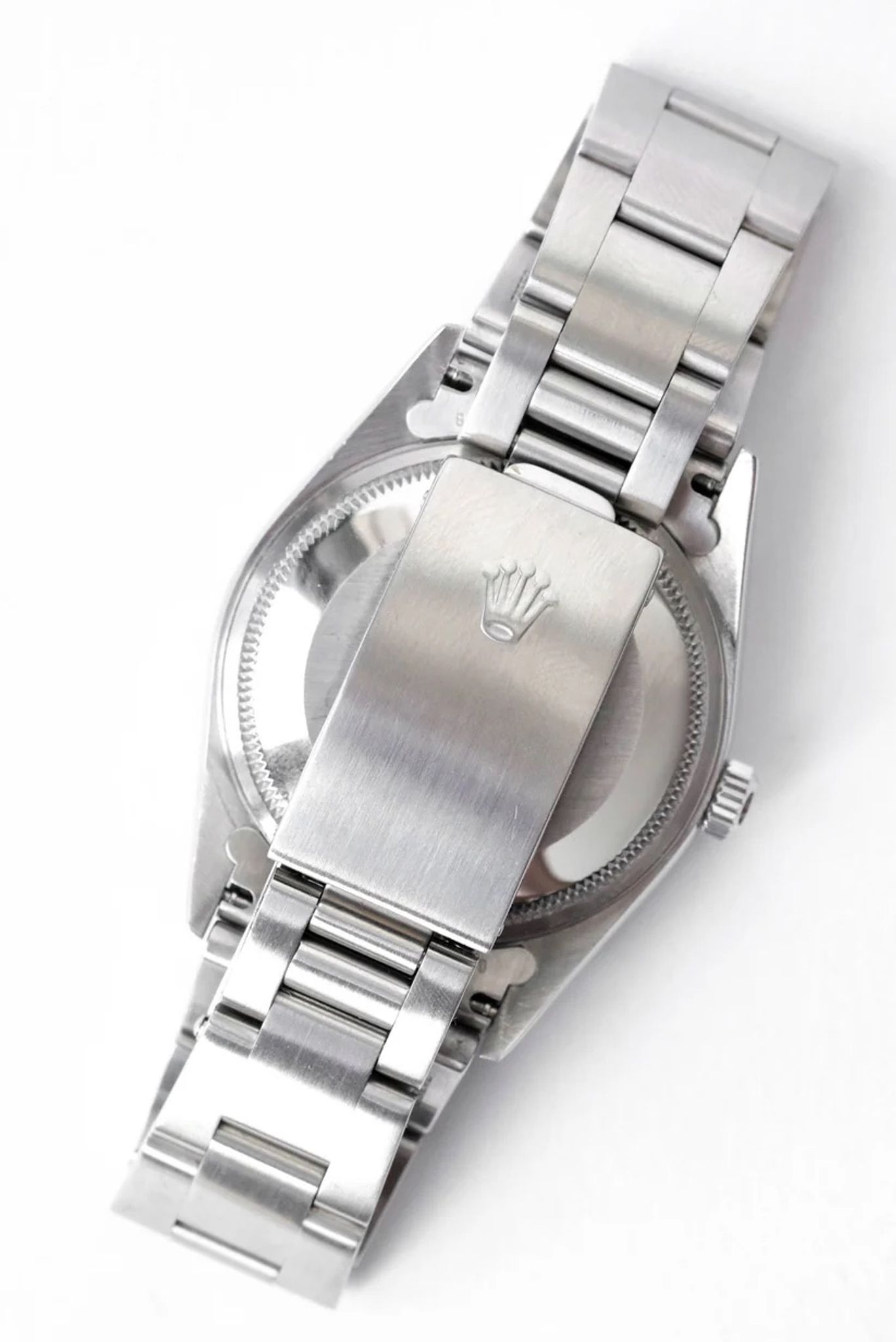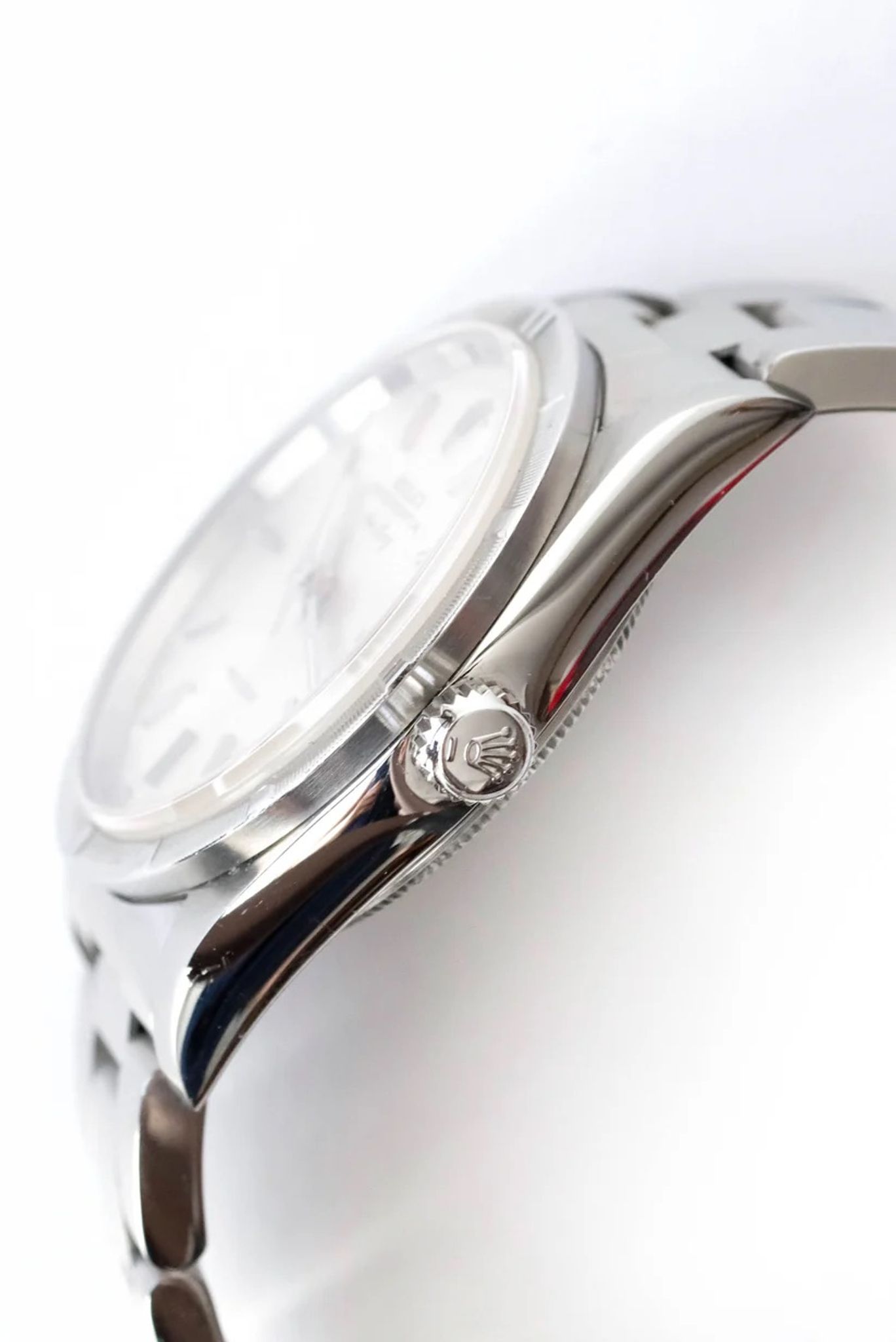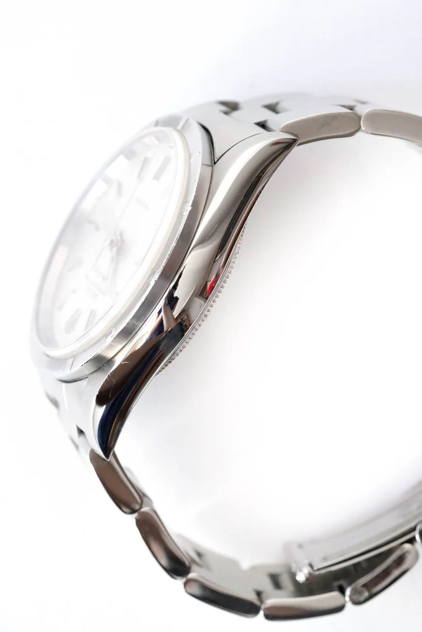 The Air King gathers all the features that made Rolex watches famous, starting with the waterproof Oyster case, here in a harmonious 34mm. The easily adjustable steel bracelet and the automatic movement make it a watch that as comfortable as practical. The silver dial is the most iconic at Rolex, the simplest. The engine turned bezel is on the other end a rarer detail that only connoisseurs will recognize.