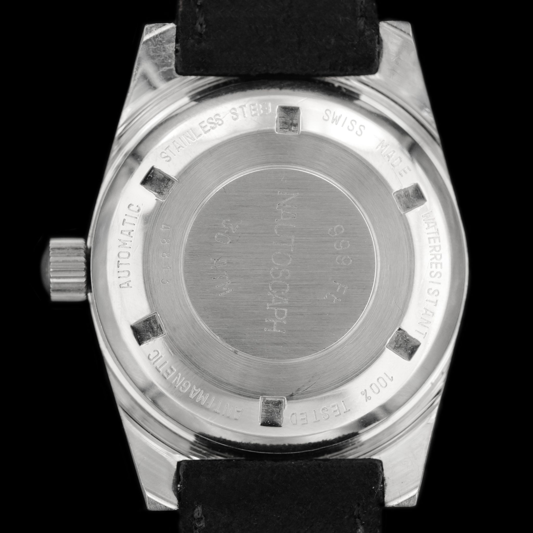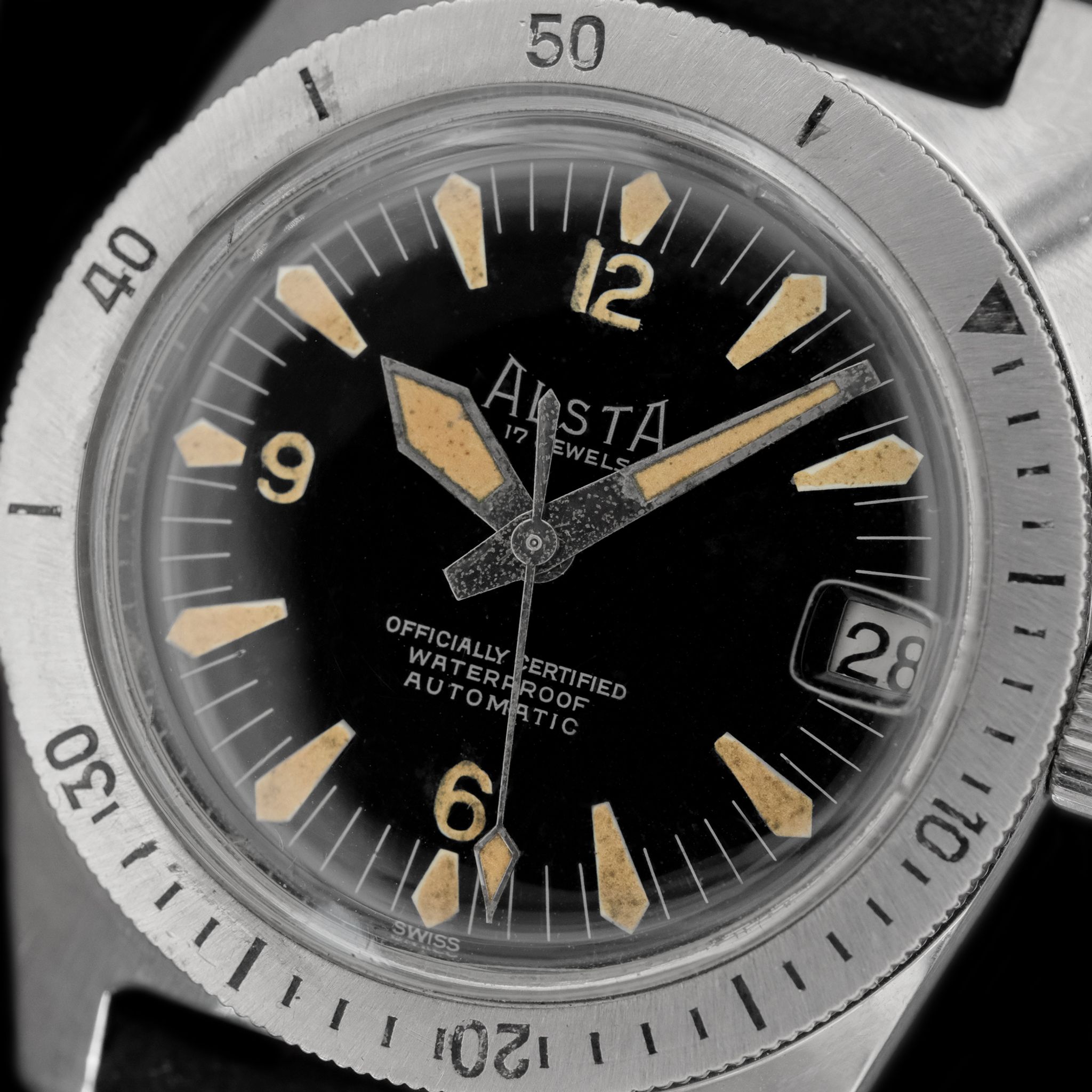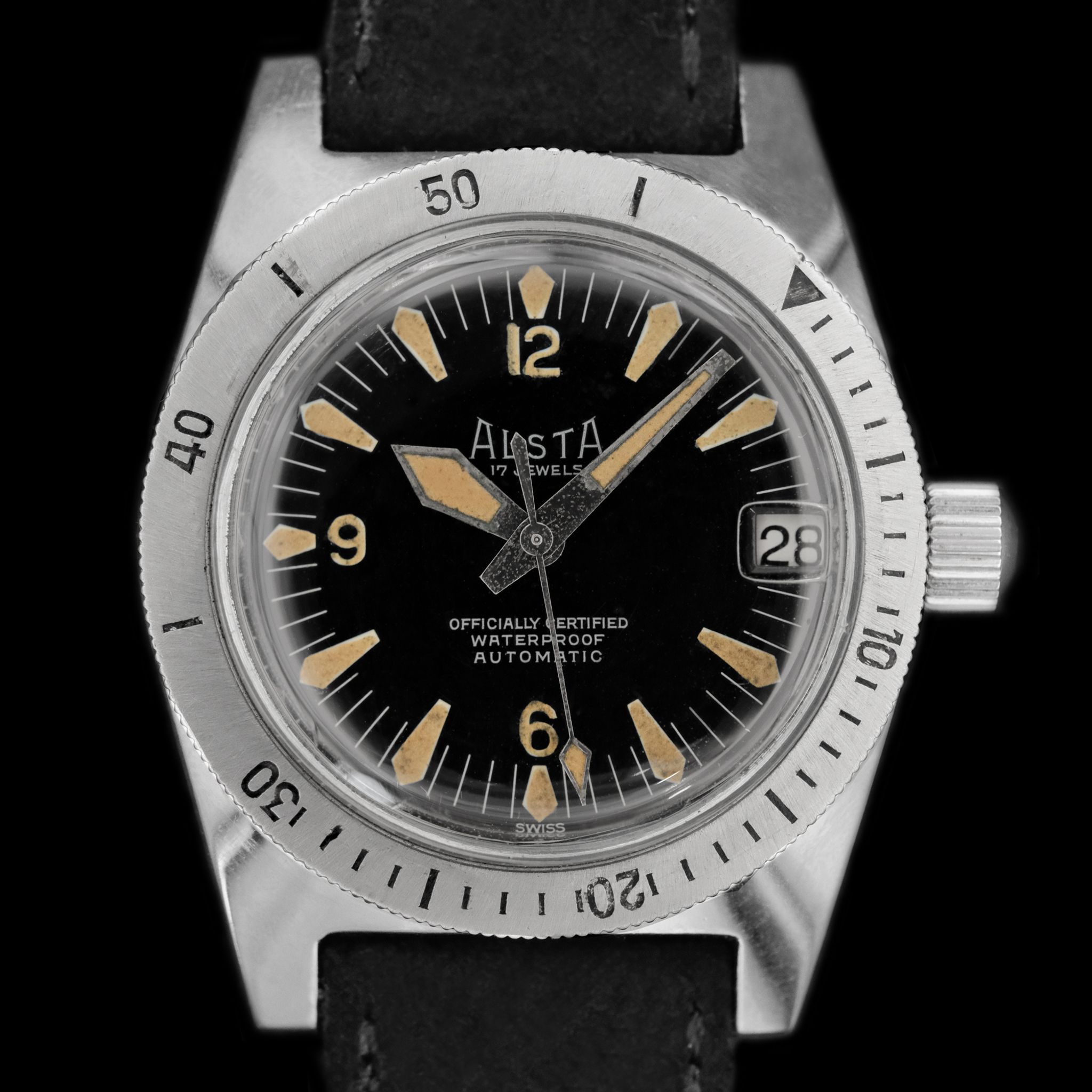 Throughout the 1960s and 1970s, Alsta was known for producing beautifully engineered wristwatches designed to withstand the elements. One of its most iconic models is the Alsta Nautoscaph, a similar model famously worn by Richard Dreyfuss in the 1975 film Jaws. This early example of the Nautoscaph also known as the "999" since its waterproof to 30 ATM, often referred to as the original "Jaws Watch," features a stainless steel bezel and is powered by the reliable Felsa 4007N automatic movement. First introduced in the 1960s, the Nautoscaph earned its place as a cult classic among vintage dive watches with a beautiful set of hands and huge crown, we only decided to curate this watch since its probably the best example ever found, full lume, unpolished and with a crisp movement. This watches are often in terrible condition since the bezels are brass plated.