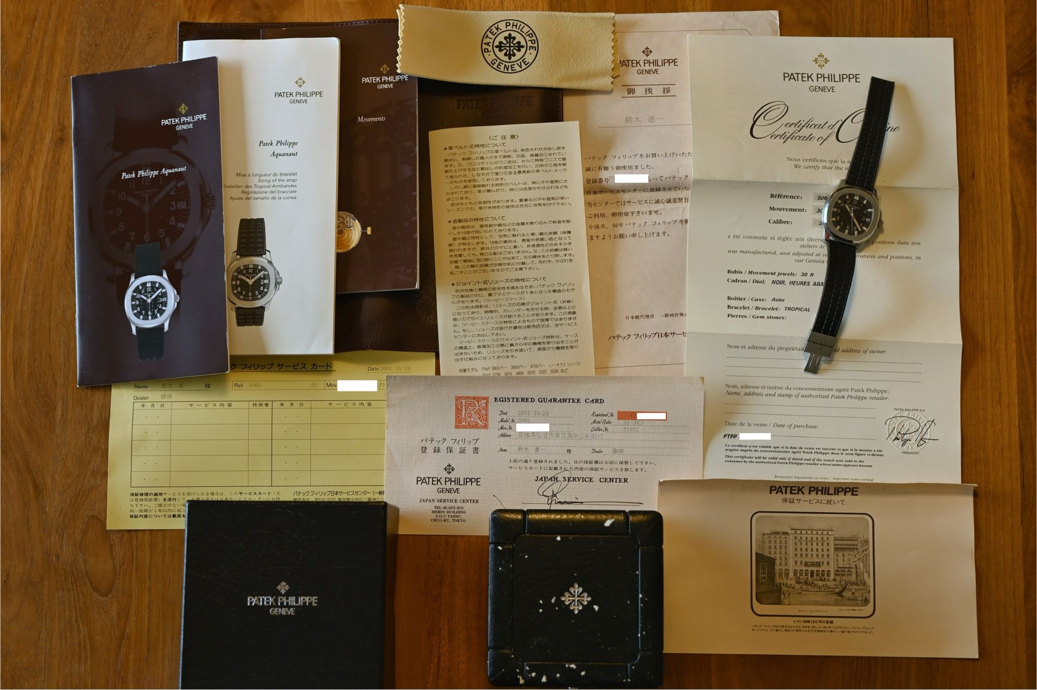 Includes: Original inner and outer box, leather folder, Certificate of Origin, movement booklet, model booklet, tropic strap booklet, strap instructions in Japanese, registration from the Japanese service center showing it was registered in 2001, additional documents in Japanese, embossed cleaning cloth, long black Tropic strap that will fit an approximate 7" wrist, and original butterfly deployant buckle.