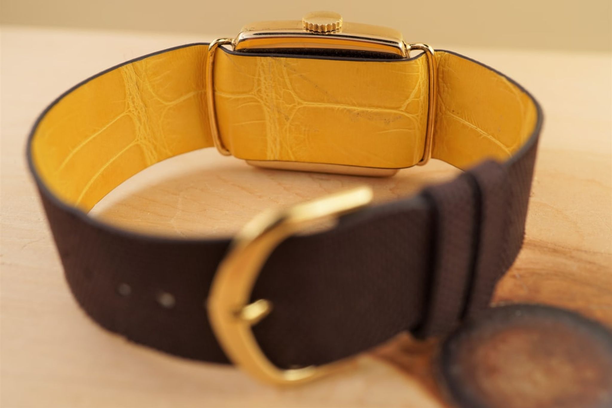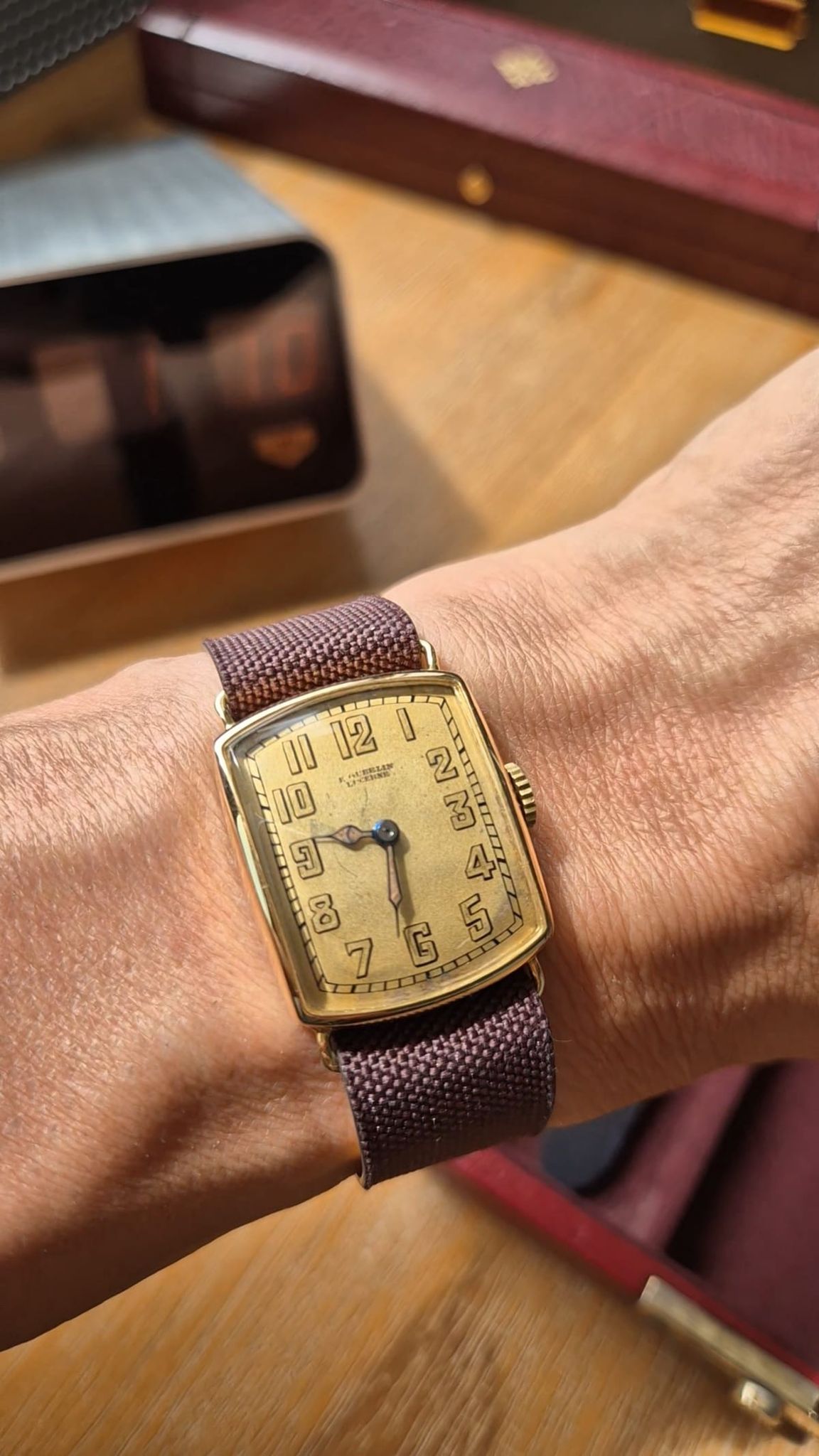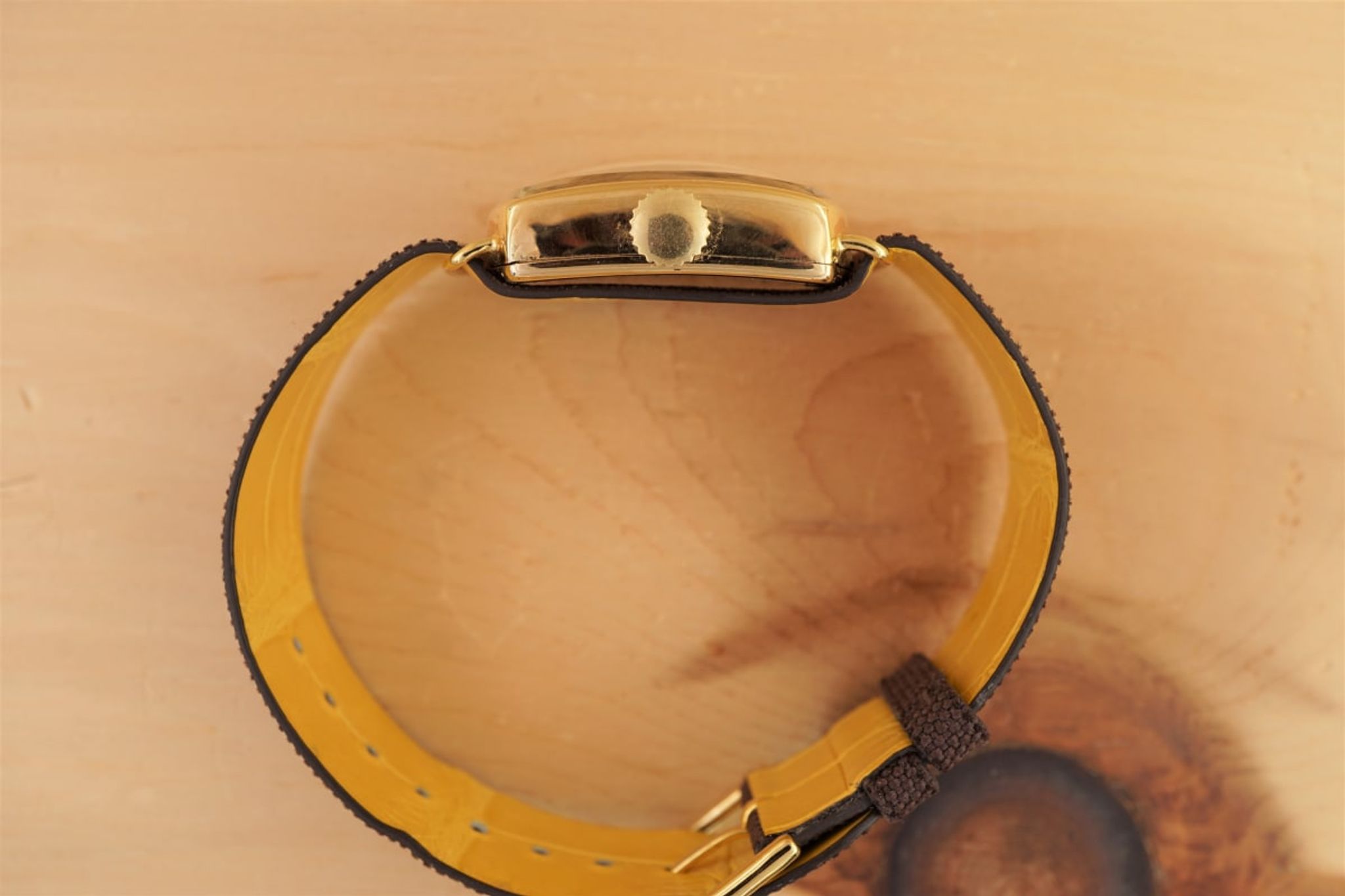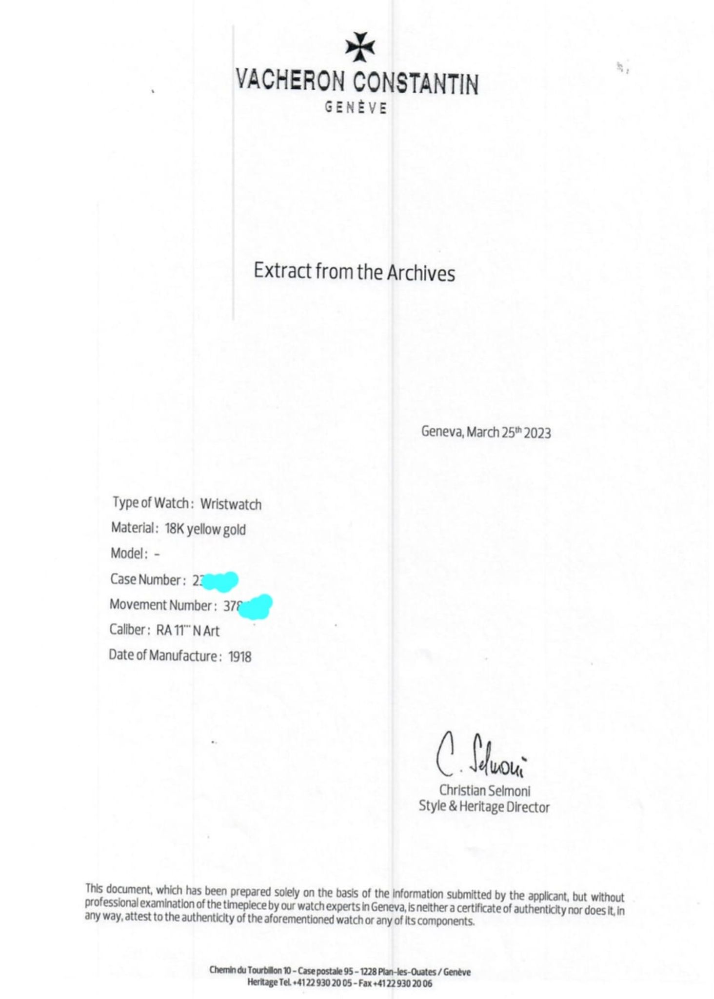 The movement and the original 18K curved-case is VC-signed, numbered and confirmed by Vacheron excerpt from archive (included). The reliable working movement was serviced and we created a very thin and wearable linen NATO-style strap for the fixed wire-lugs. Historical & wearable.