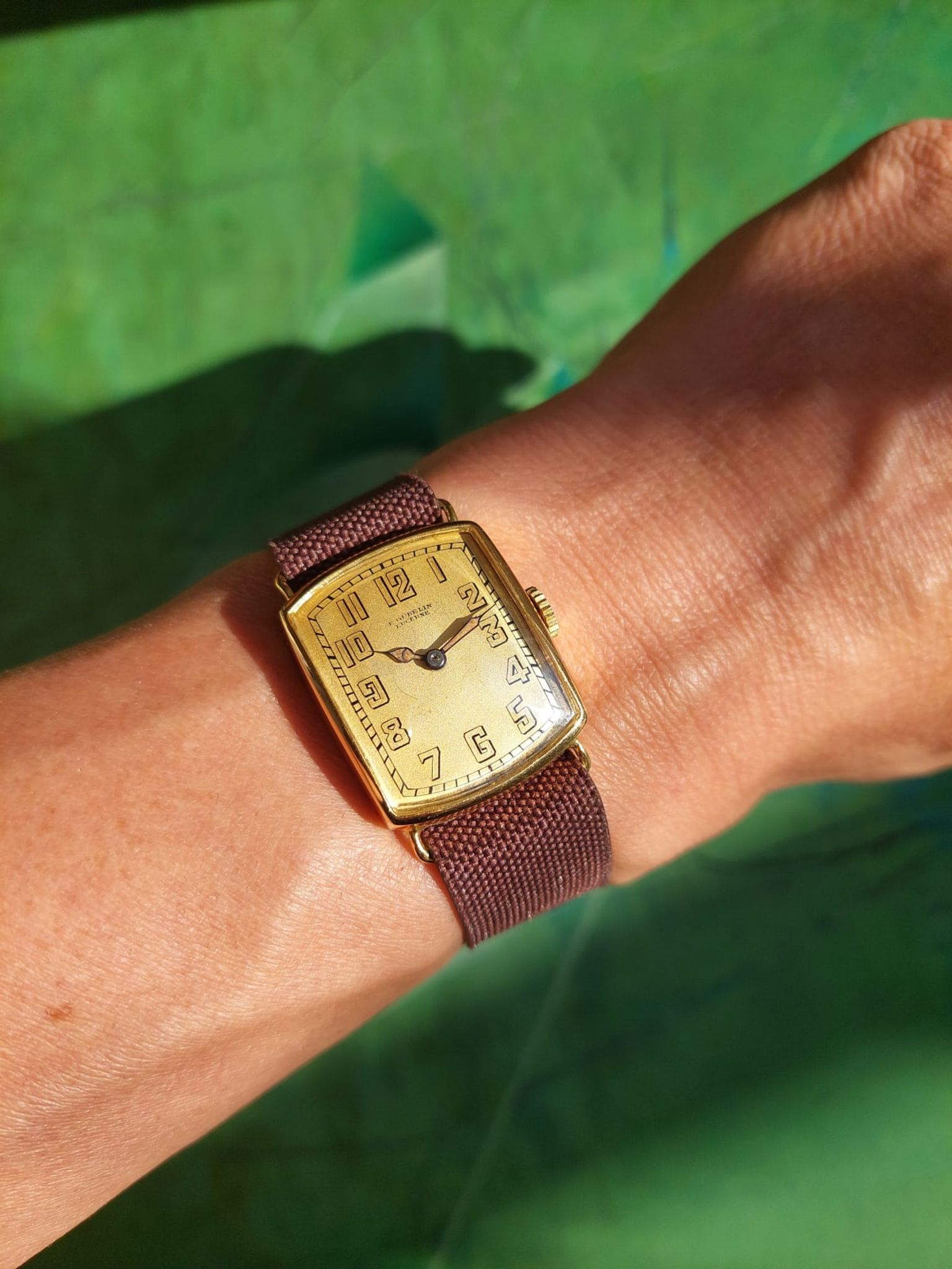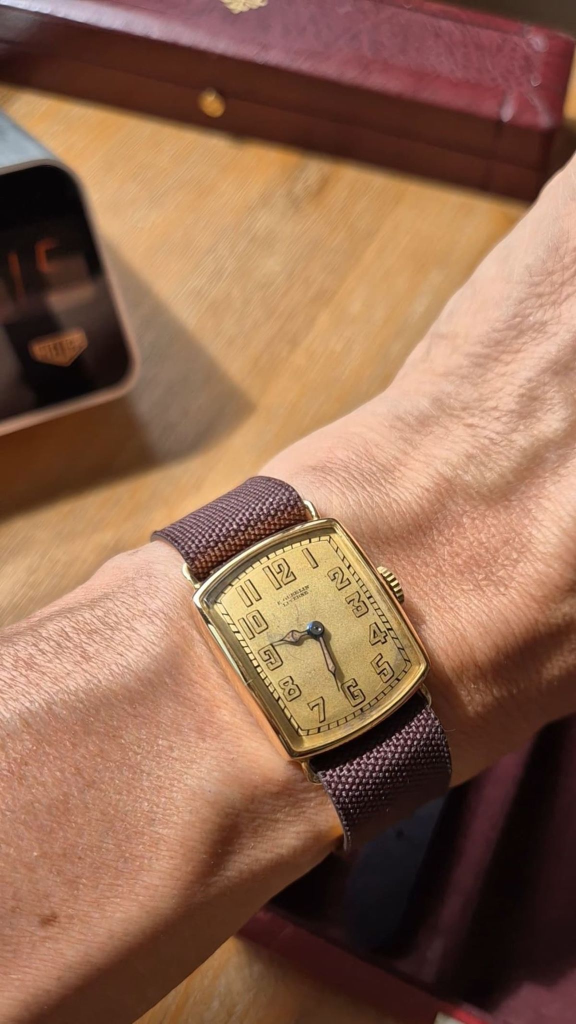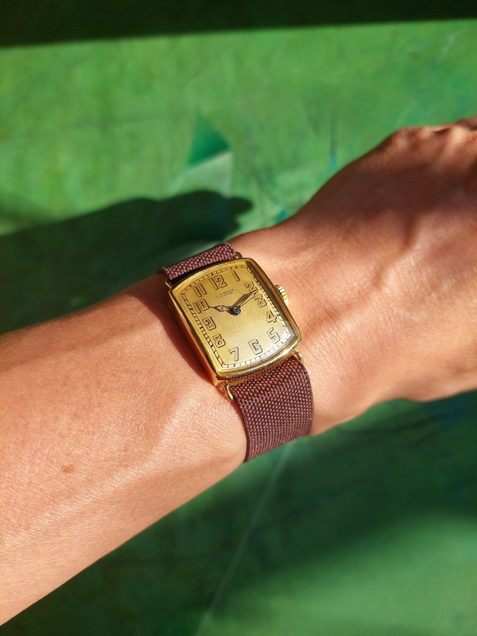 The movement and the original 18K curved-case is VC-signed, numbered and confirmed by Vacheron excerpt from archive (included). The reliable working movement was serviced and we created a very thin and wearable linen NATO-style strap for the fixed wire-lugs. Historical & wearable.