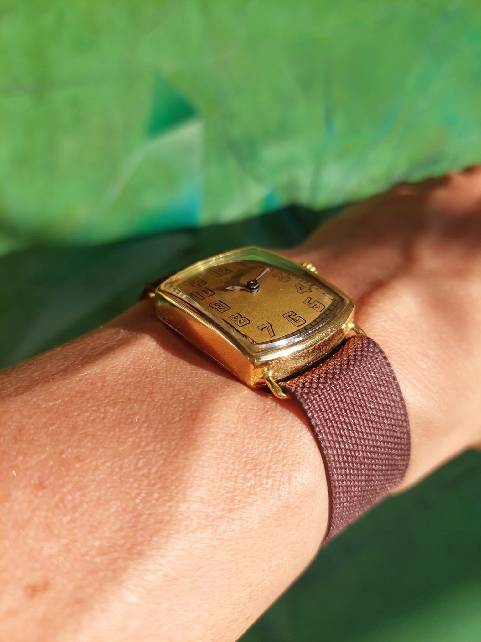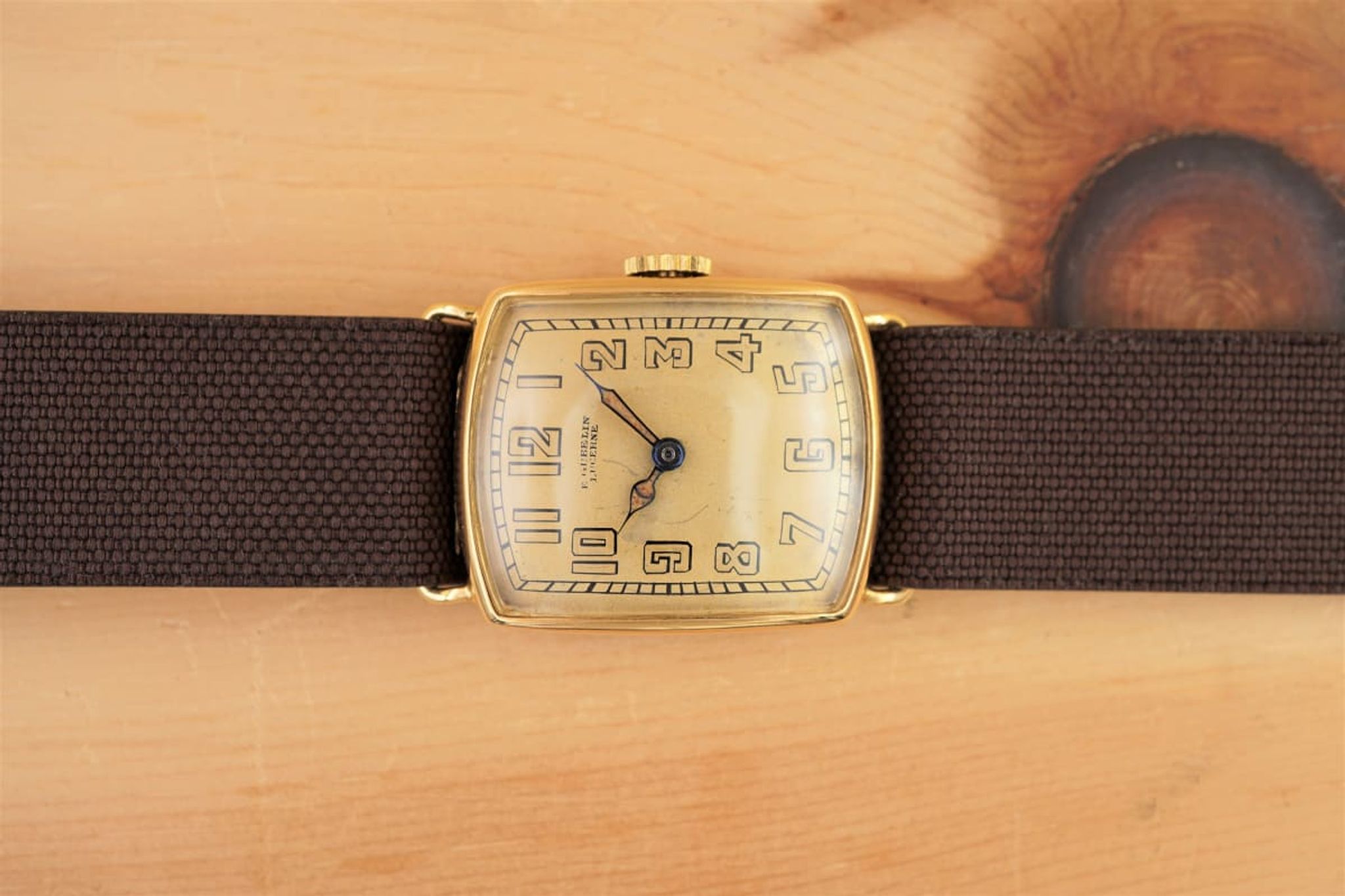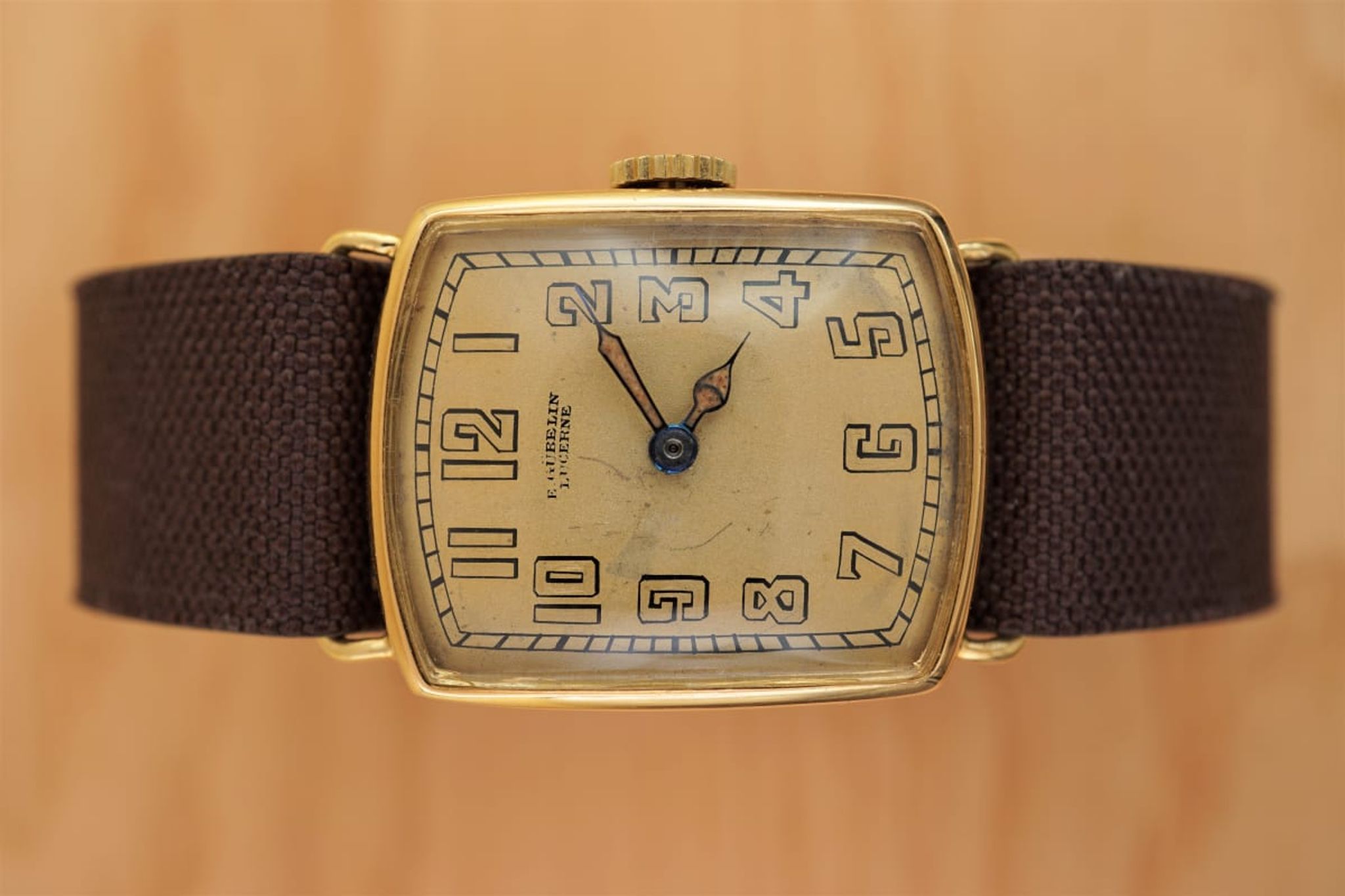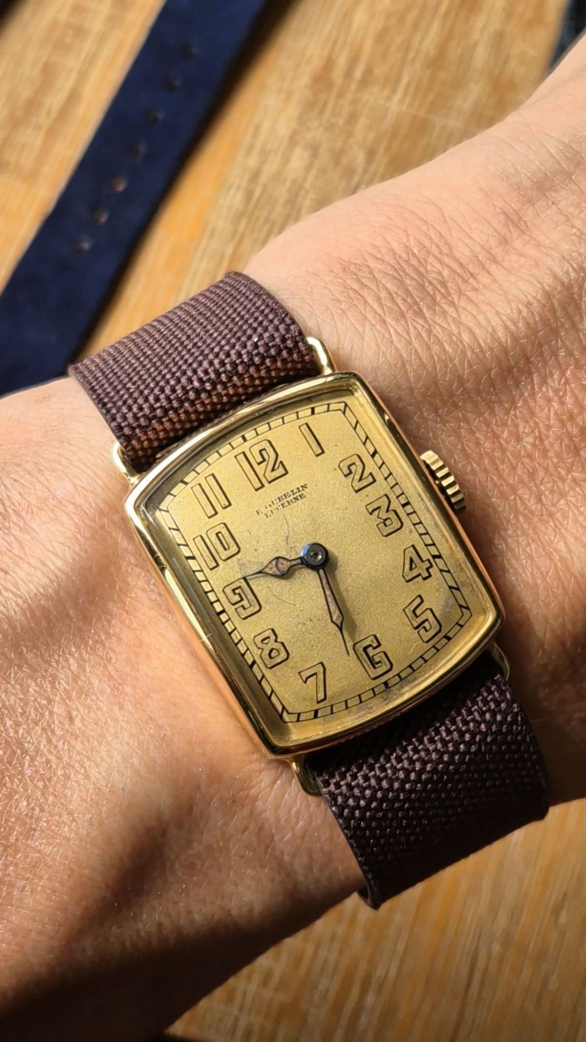 The movement and the original 18K curved-case is VC-signed, numbered and confirmed by Vacheron excerpt from archive (included). The reliable working movement was serviced and we created a very thin and wearable linen NATO-style strap for the fixed wire-lugs. Historical & wearable.