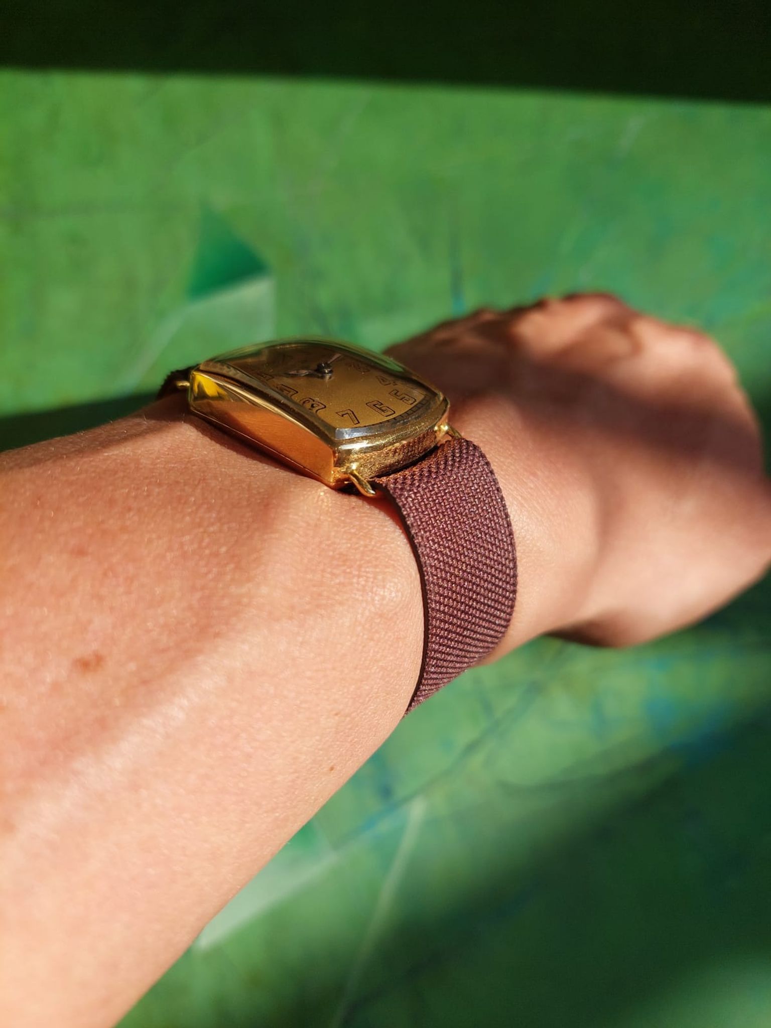 The amazing golden Sand-Dial is signed by Lucerne-based retailer Gubelin. The art-deco numerals just make it an artefact; an art-de-fact.
