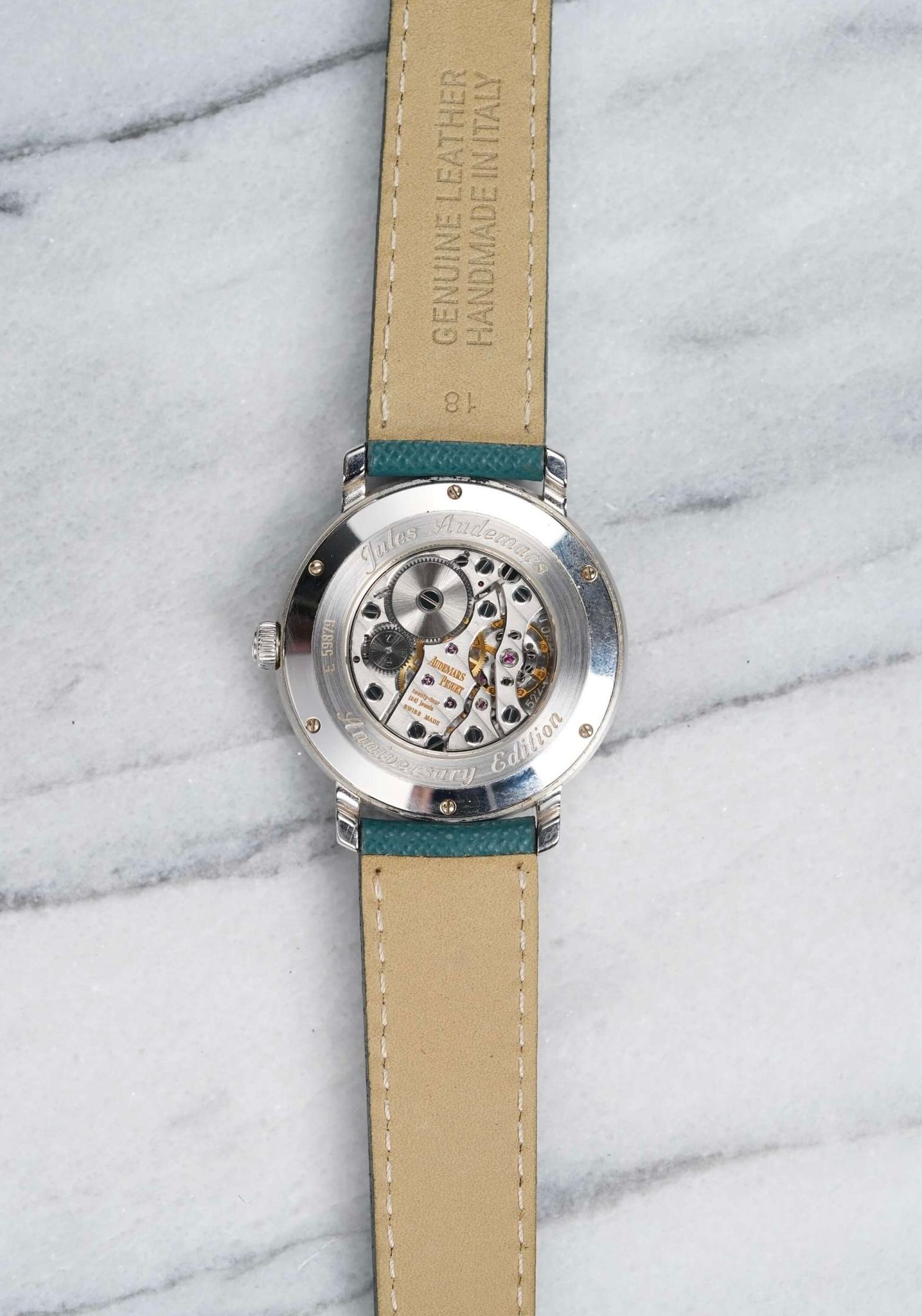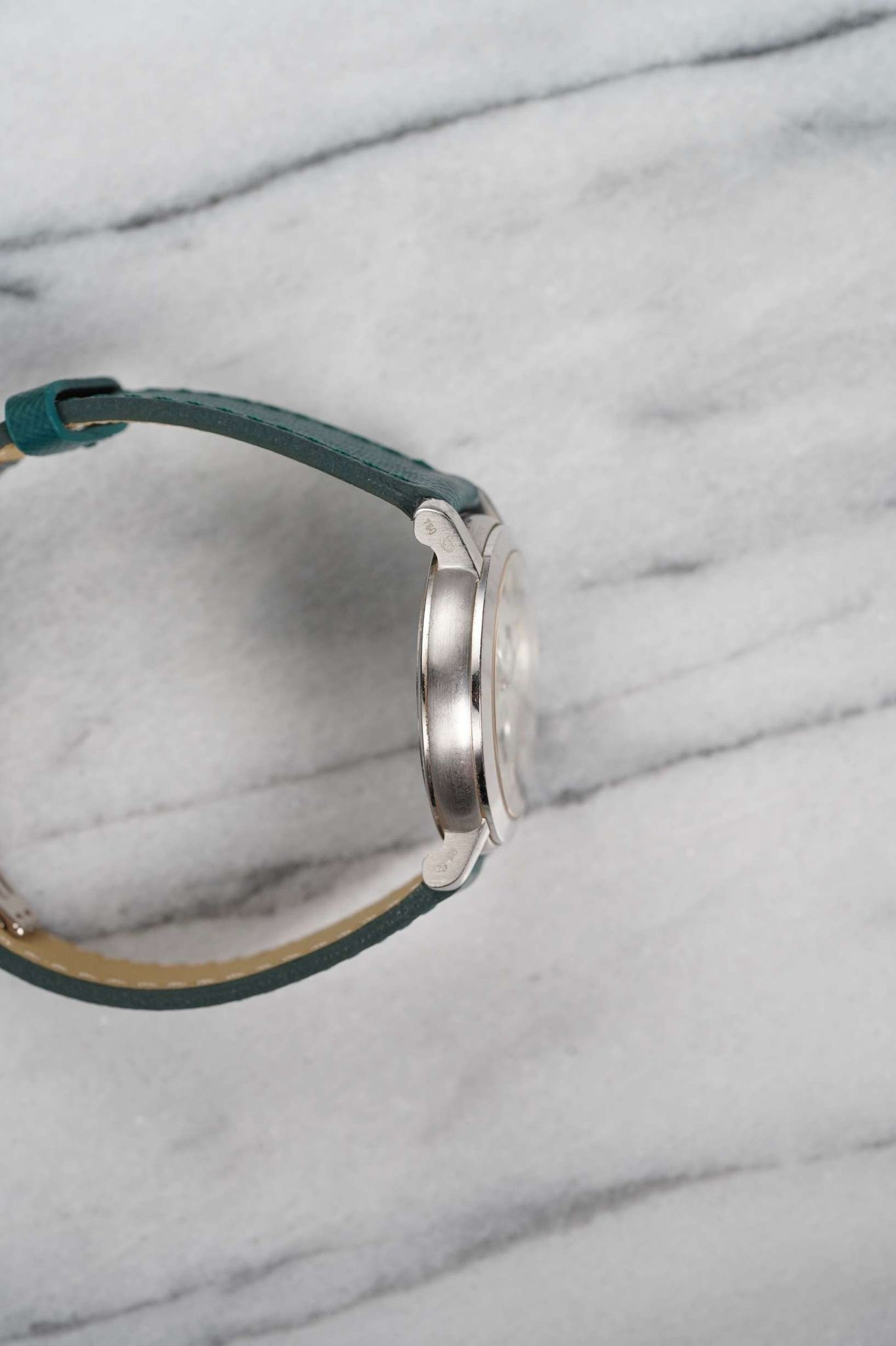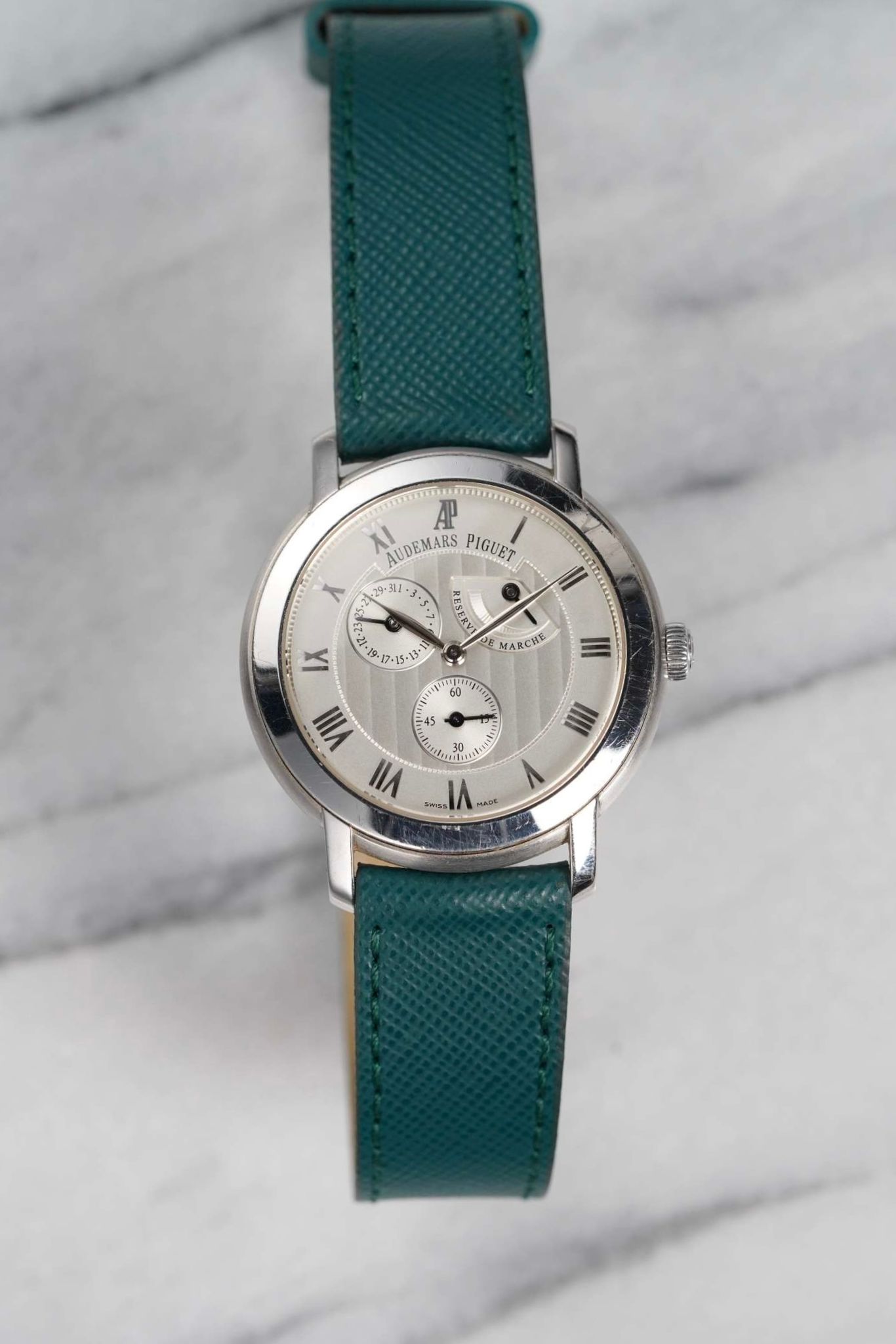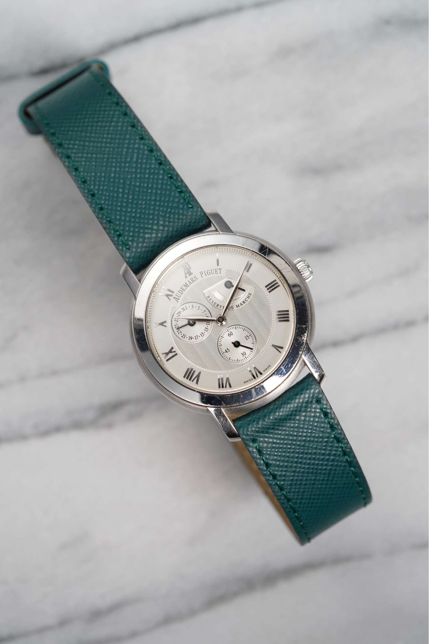 Here we have a Audemars Piguet manual wind in18k white gold with a beautiful white dial from the 2000s-2010 (E series). Comes with its original papers. Keeps great time and is fully functional. Measurements of the case is 36mm including the crown. Quickset date function at 3 a clock. On an aftermarket green leather strap (Made in Italy) and matching gold deployant buckle. Clear exhibition caseback. 18K white gold case and caseback. All parts are original including the dial, crown, movement, and caseback. Both the dial and case are in great cosmetic, untouched condition.