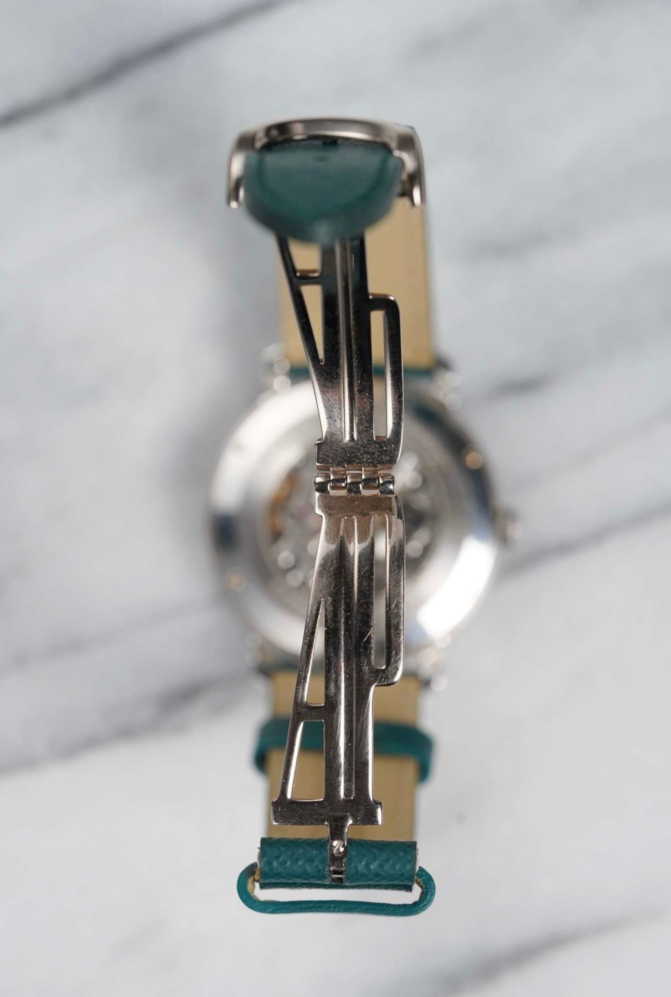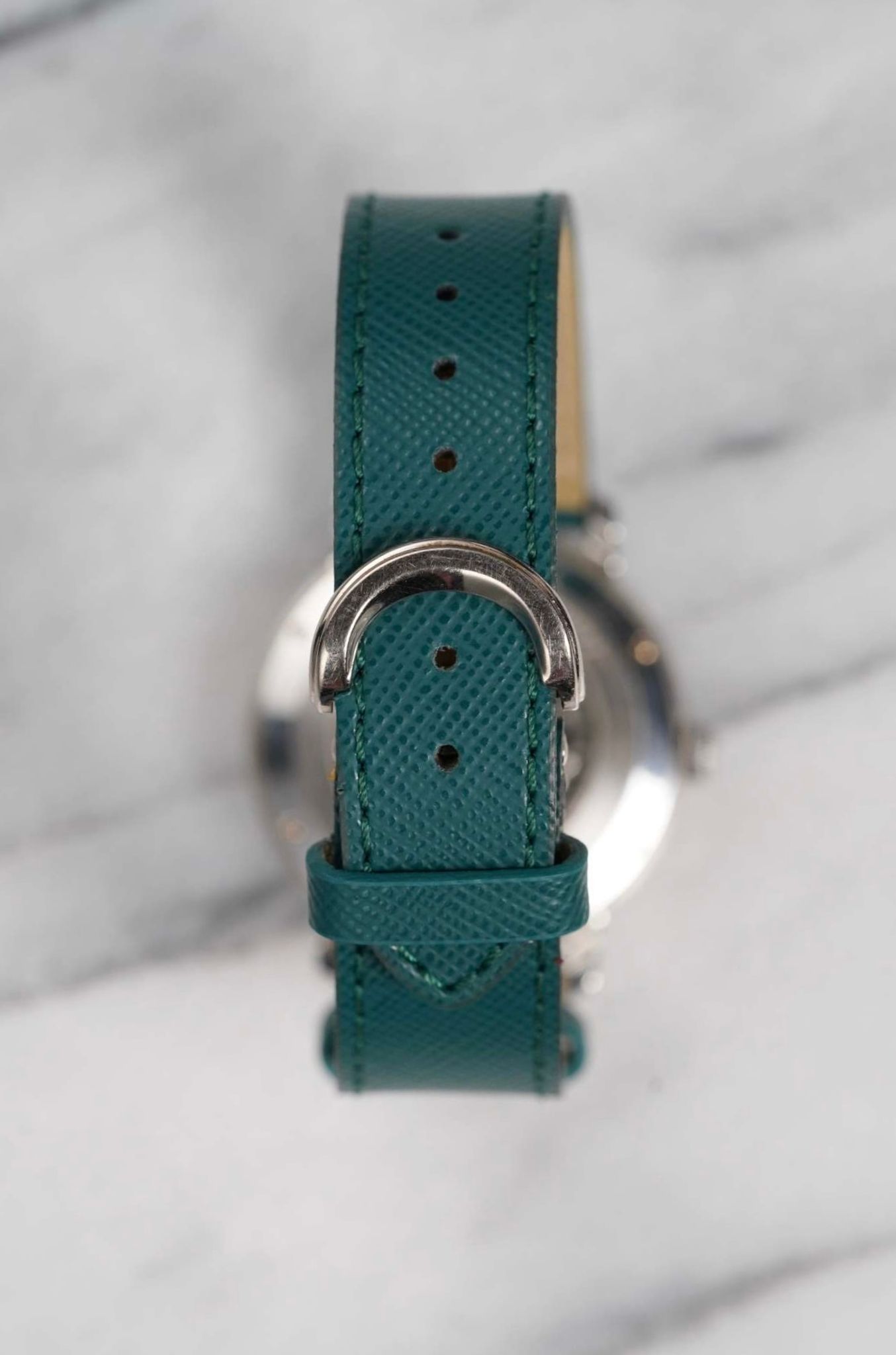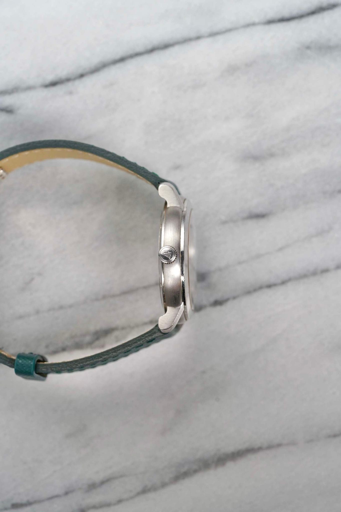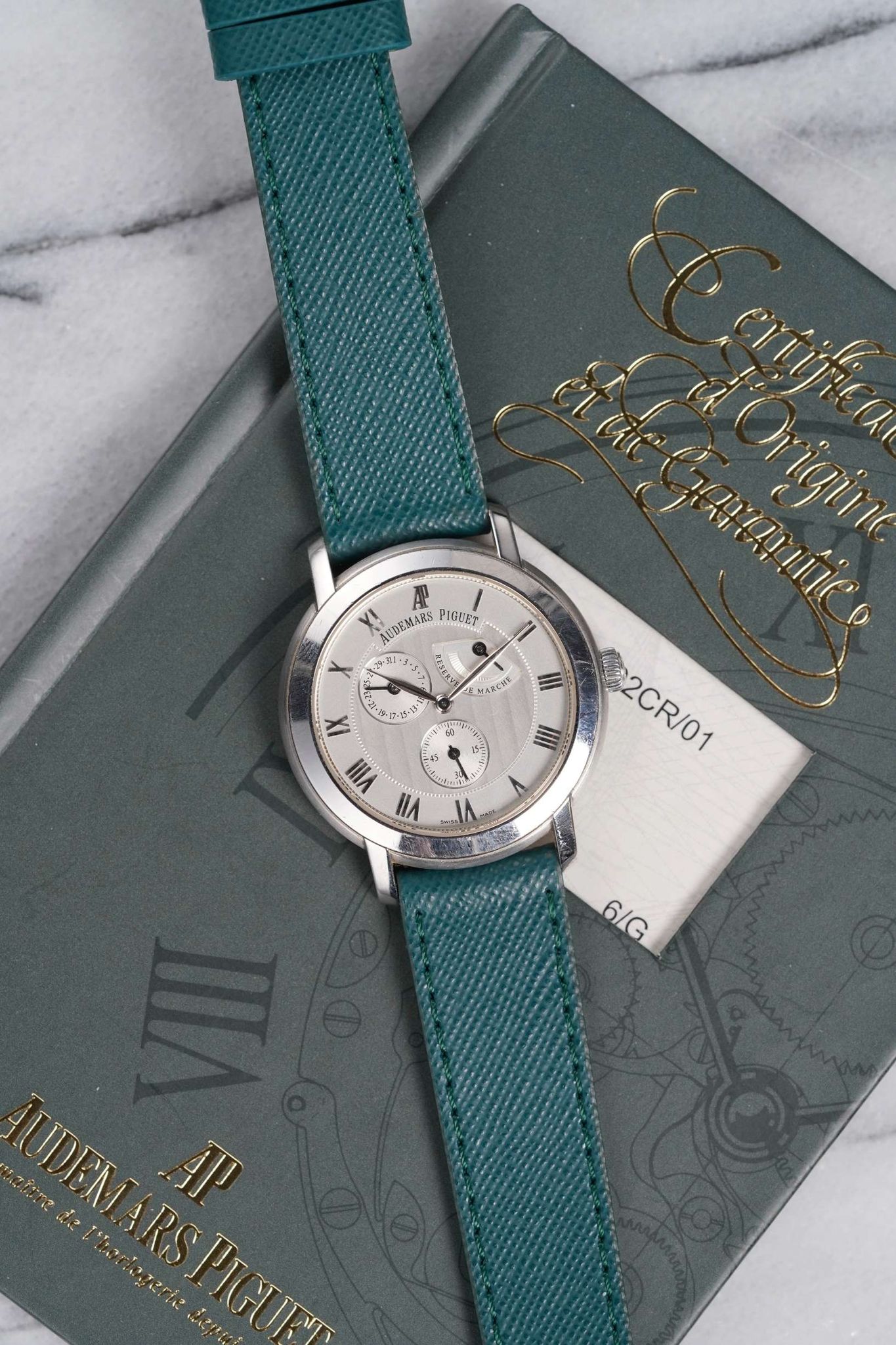 Here we have a Audemars Piguet manual wind in18k white gold with a beautiful white dial from the 2000s-2010 (E series). Comes with its original papers. Keeps great time and is fully functional. Measurements of the case is 36mm including the crown. Quickset date function at 3 a clock. On an aftermarket green leather strap (Made in Italy) and matching gold deployant buckle. Clear exhibition caseback. 18K white gold case and caseback. All parts are original including the dial, crown, movement, and caseback. Both the dial and case are in great cosmetic, untouched condition.
