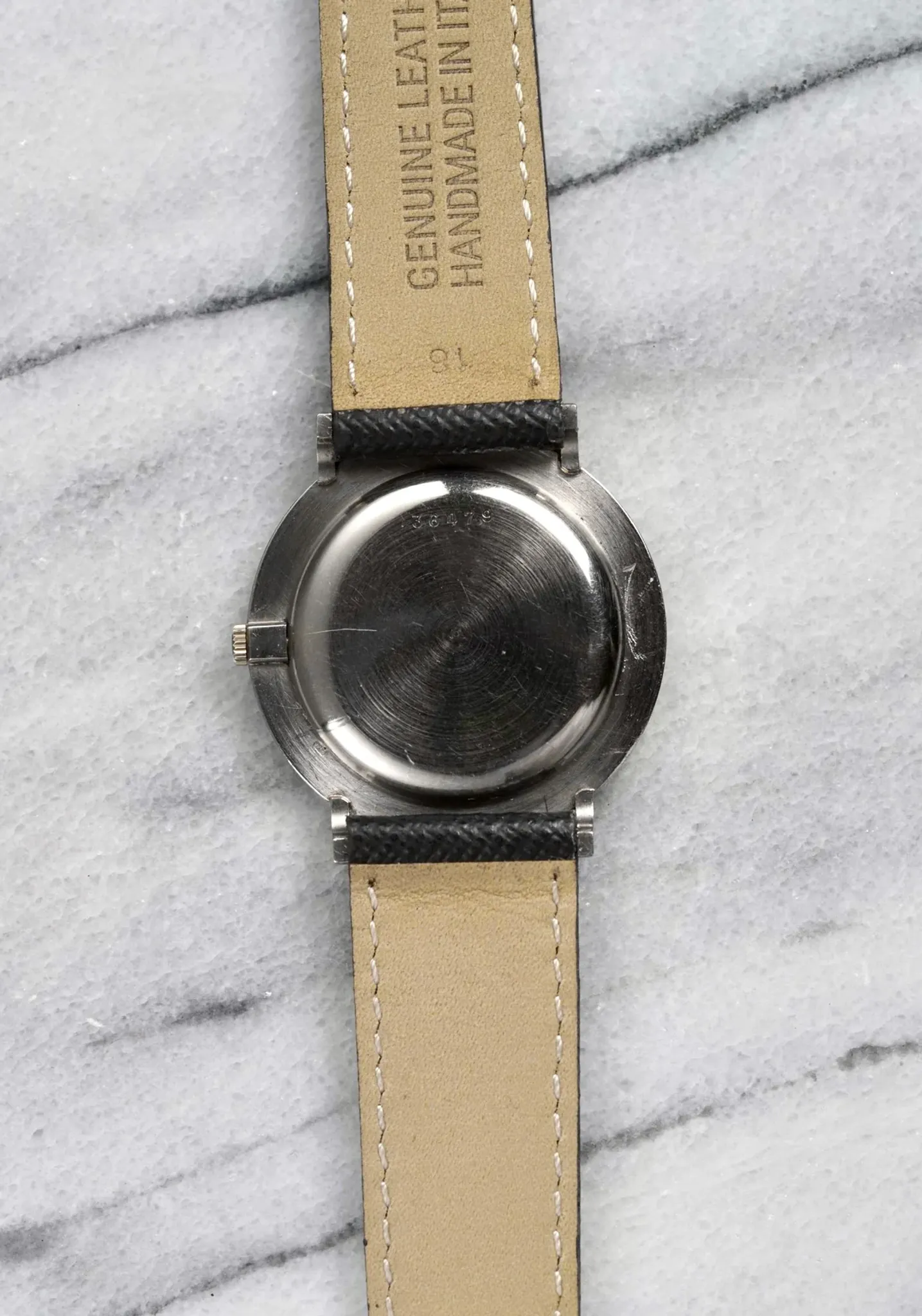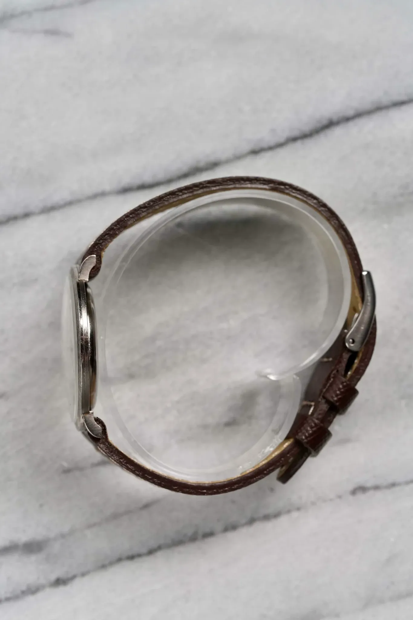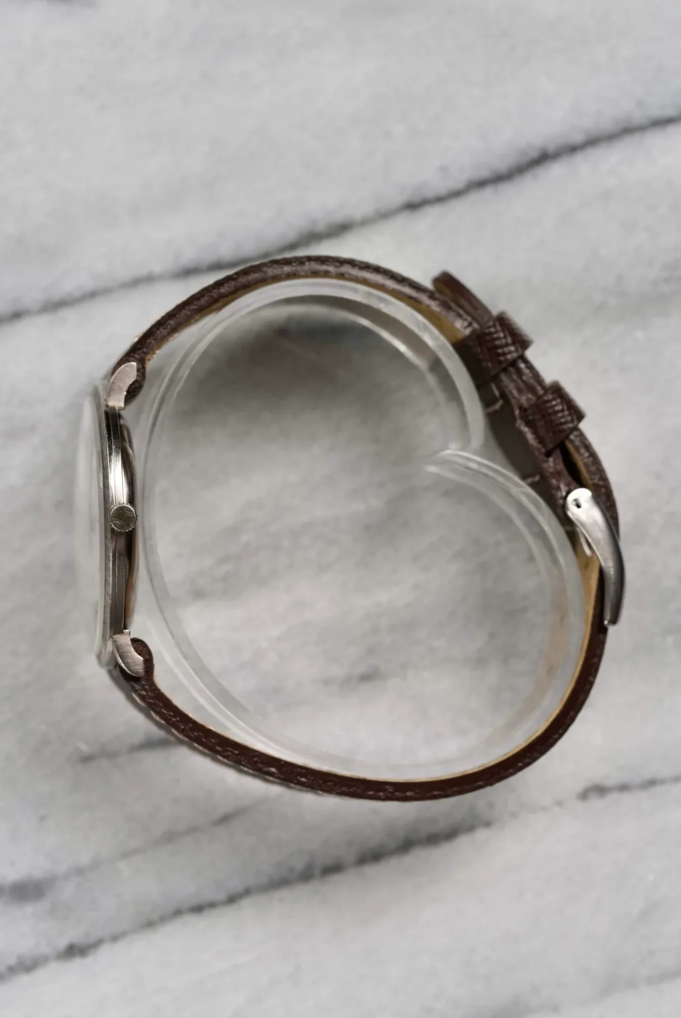 Here's a vintage Audemars Piguet manual wind in 18K white gold with a matte white dial from the 1970s-1980s. Keeps great time and is fully functional. Measurements include a 34mm case and 18mm lug width. It's on a brown saffiano pebble textured leather strap (Made in Italy). Two hands only. Matching black stick hands and hour markers. 18k white gold case and snapback caseback. The bezel has a unique hobnail-like texture as seen in the photos. Both the dial and crystal are free from any scratches or marks. Serial number on the snapback: 36479. All parts are original including the crown, dial, and caseback. Both the dial and case are in great cosmetic, untouched condition.