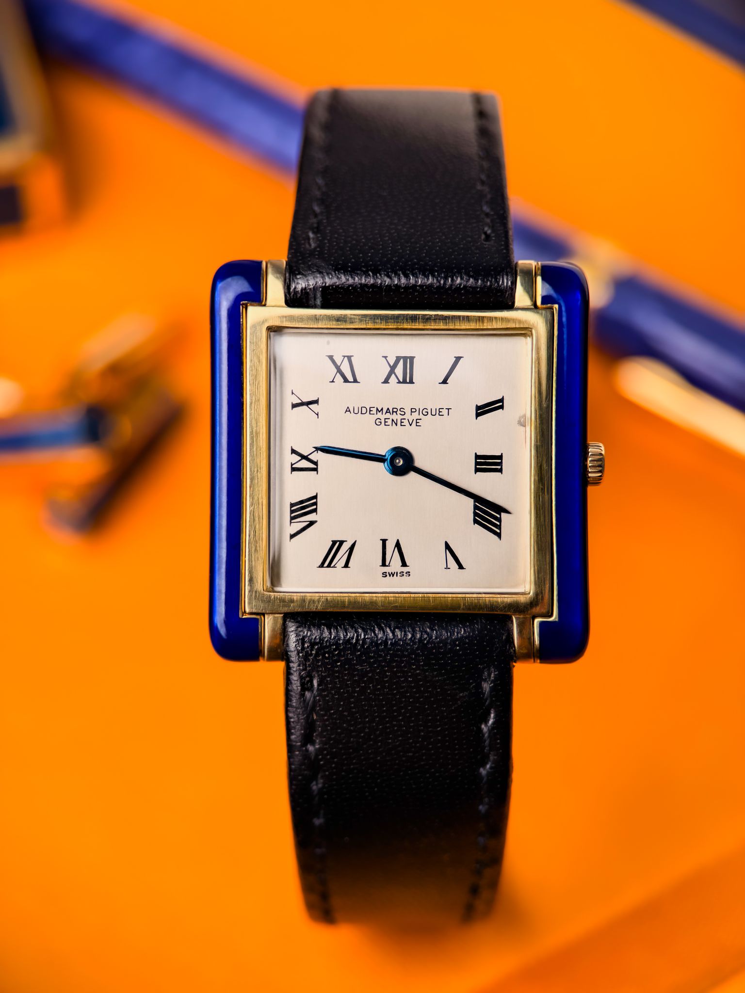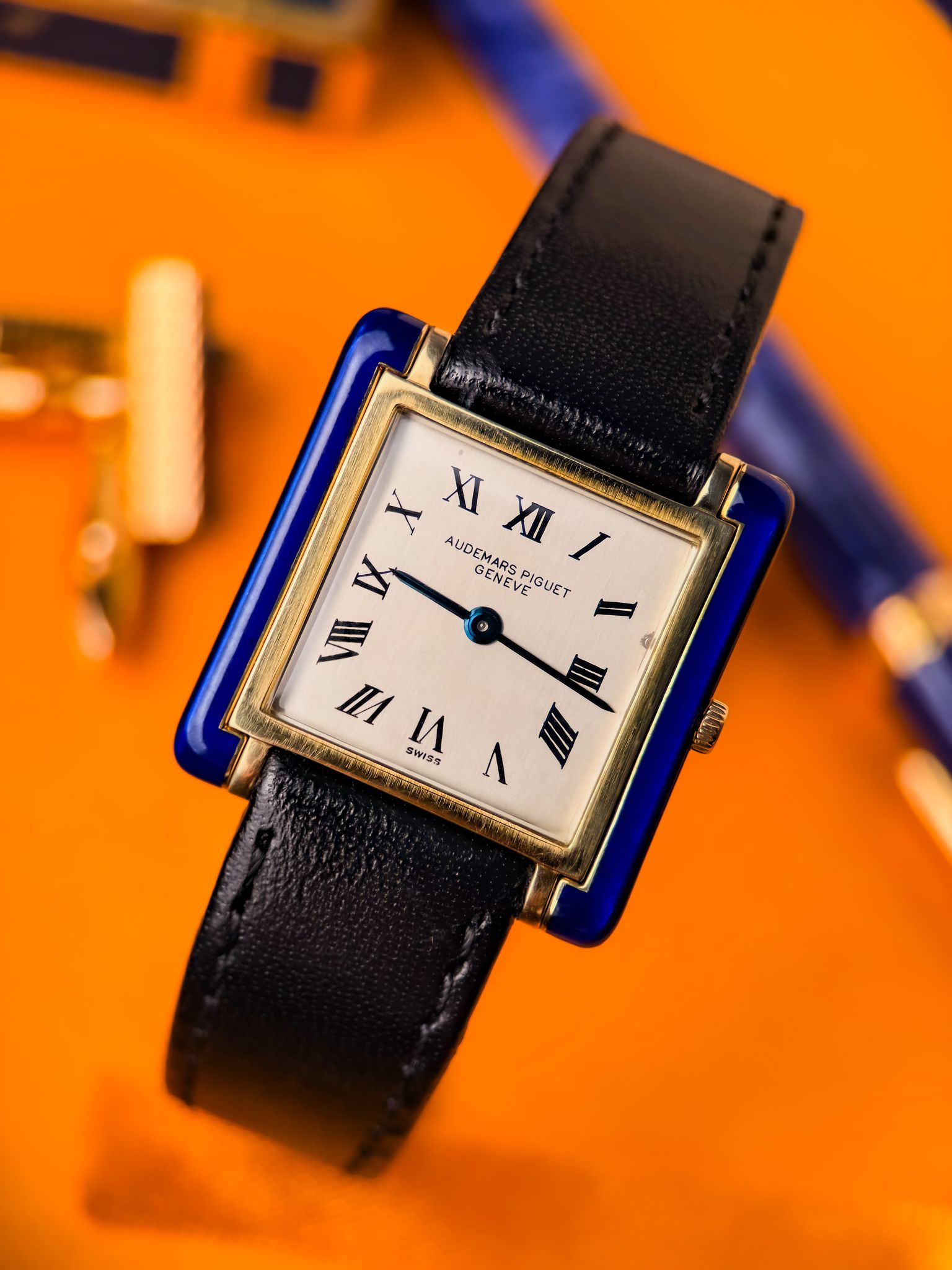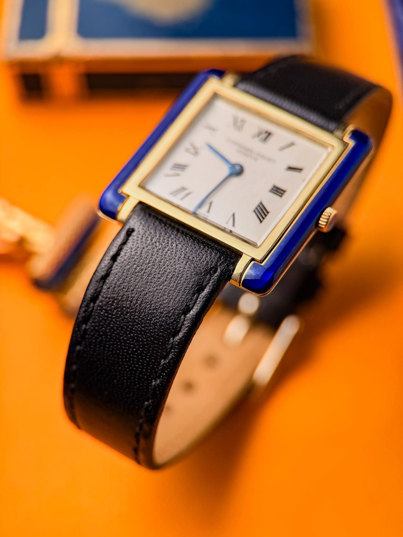 The rectangular 18K gold case is accented with hand-applied cobalt-blue enamel. Ultra-thin and perfectly balanced, it stands out for the simplicity of its matte white dial, Roman numerals, and blued hands.