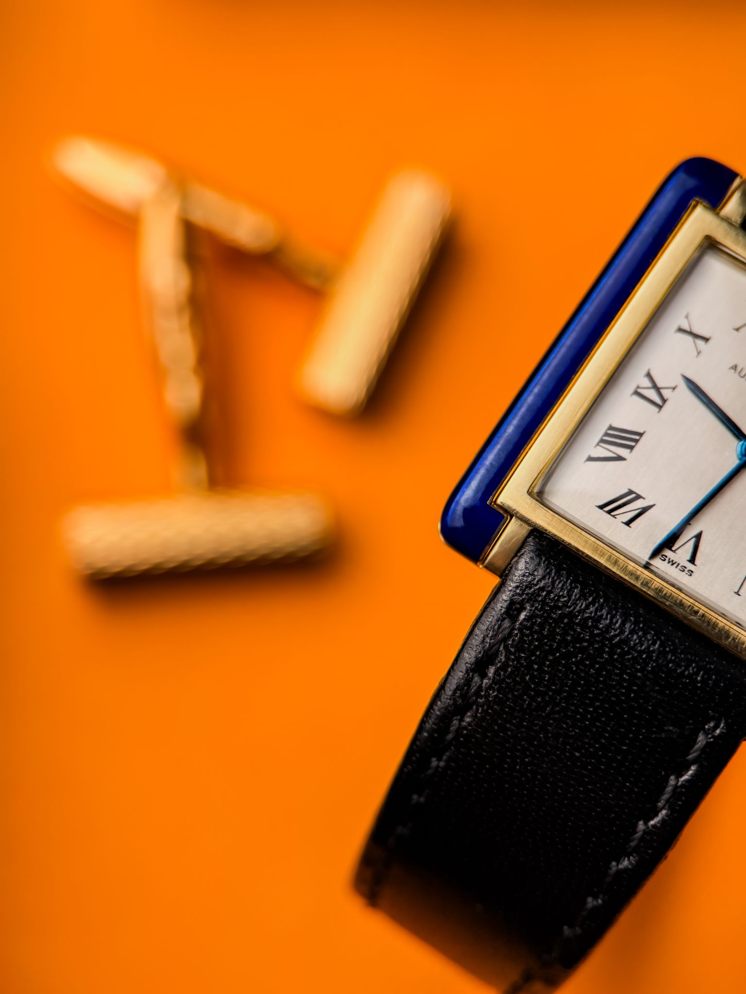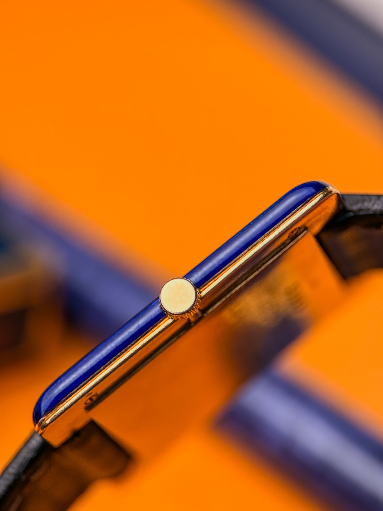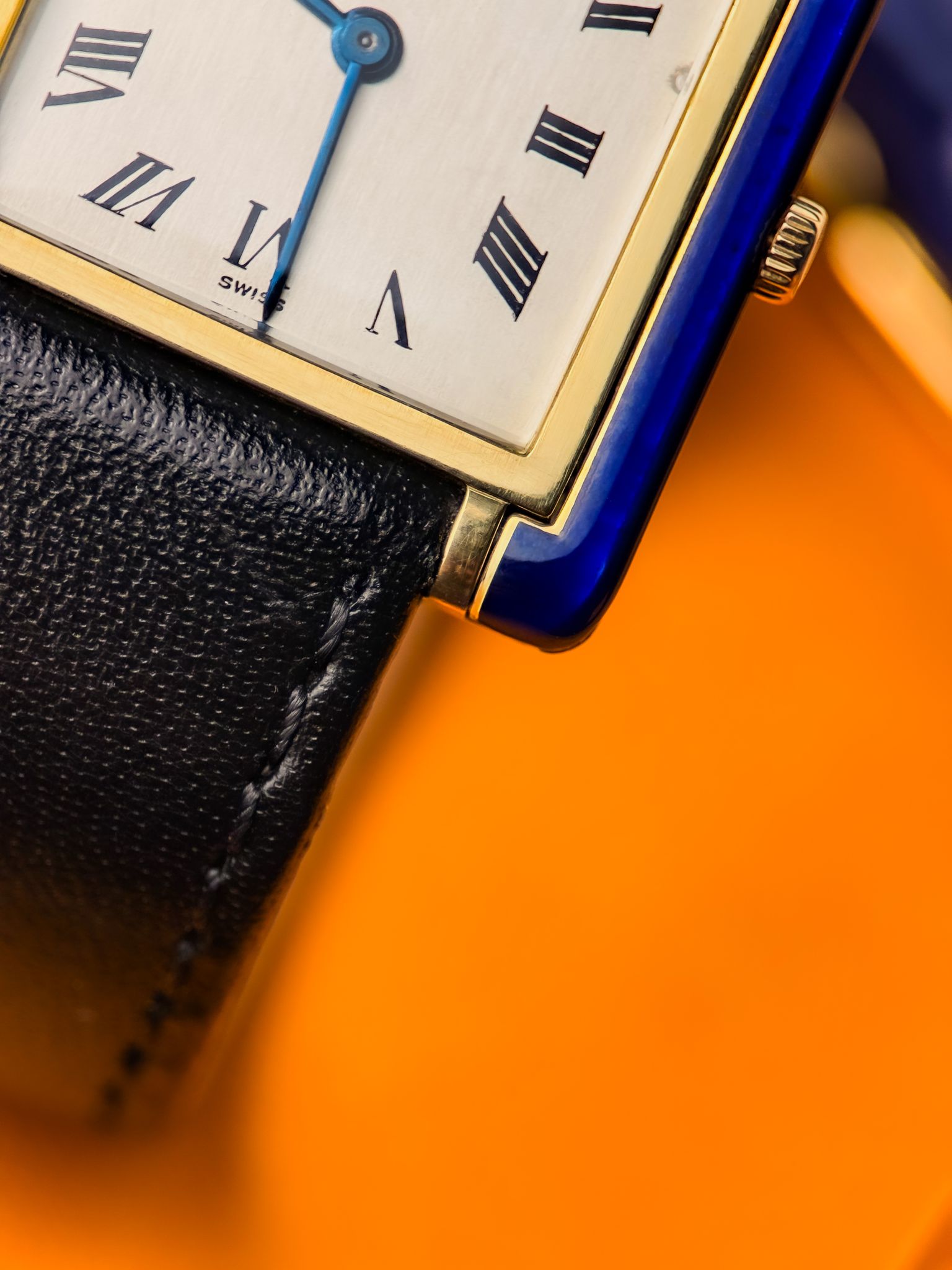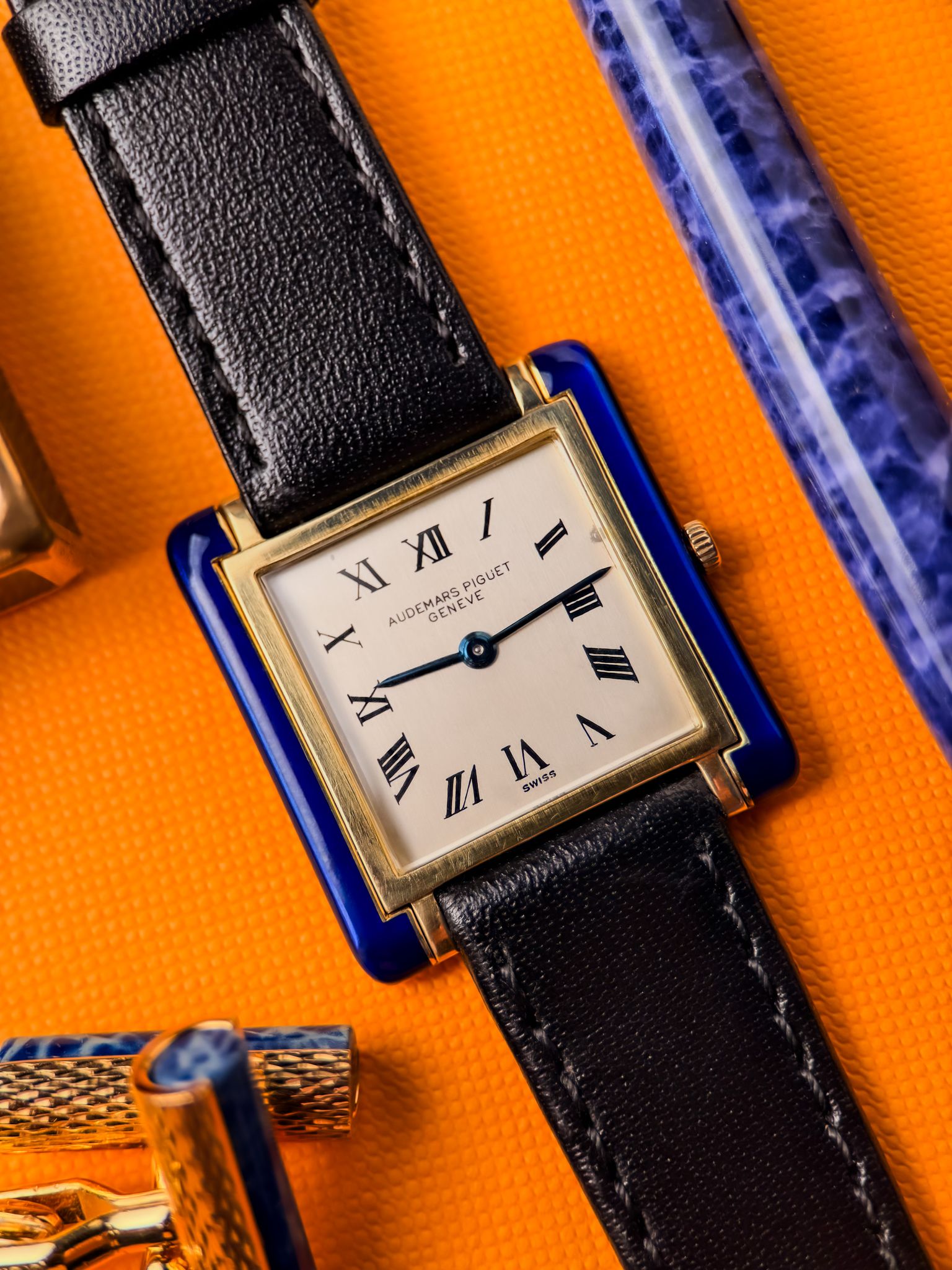 The rectangular 18K gold case is accented with hand-applied cobalt-blue enamel. Ultra-thin and perfectly balanced, it stands out for the simplicity of its matte white dial, Roman numerals, and blued hands.