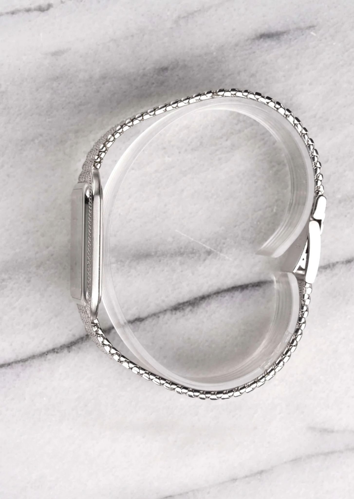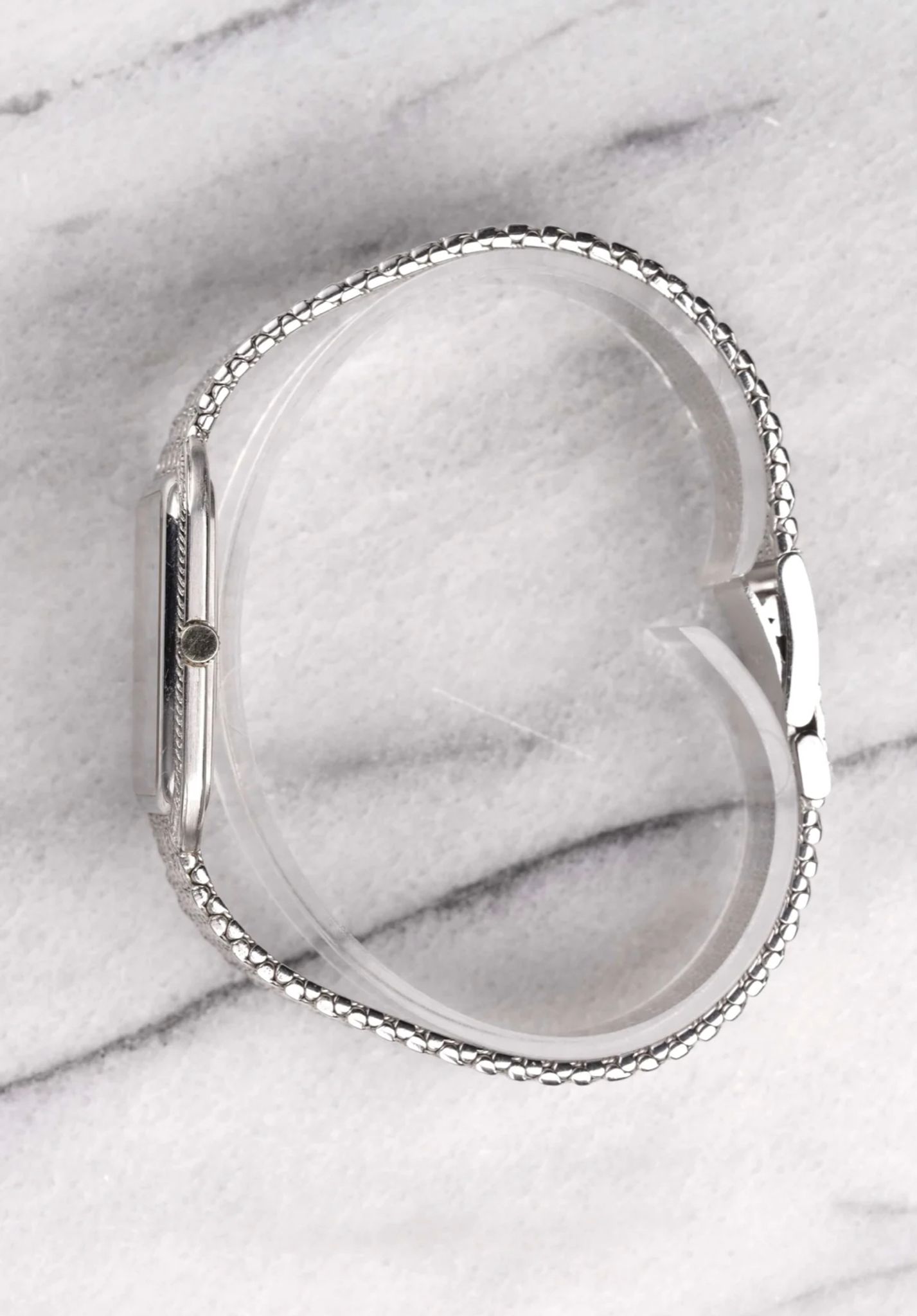 Here we have a vintage Audemars Piguet cobra manual wind in 18k white gold with a silver stardust diamond dial from the late 70s (B series) Keeps great time and is fully functional. Measurements of the case are 28x28mm including the crown. It's on its original matching integrated 18k white gold bracelet measuring 6.5-6.75 inches long with its micro adjuster. 18K white gold case and case back. Both the dial and crystal are free from any scratches. Matching braided texture in both the bracelet and bezel. All parts are original including the dial, crown, movement, and case back. Both the dial and case are in great cosmetic, untouched condition.