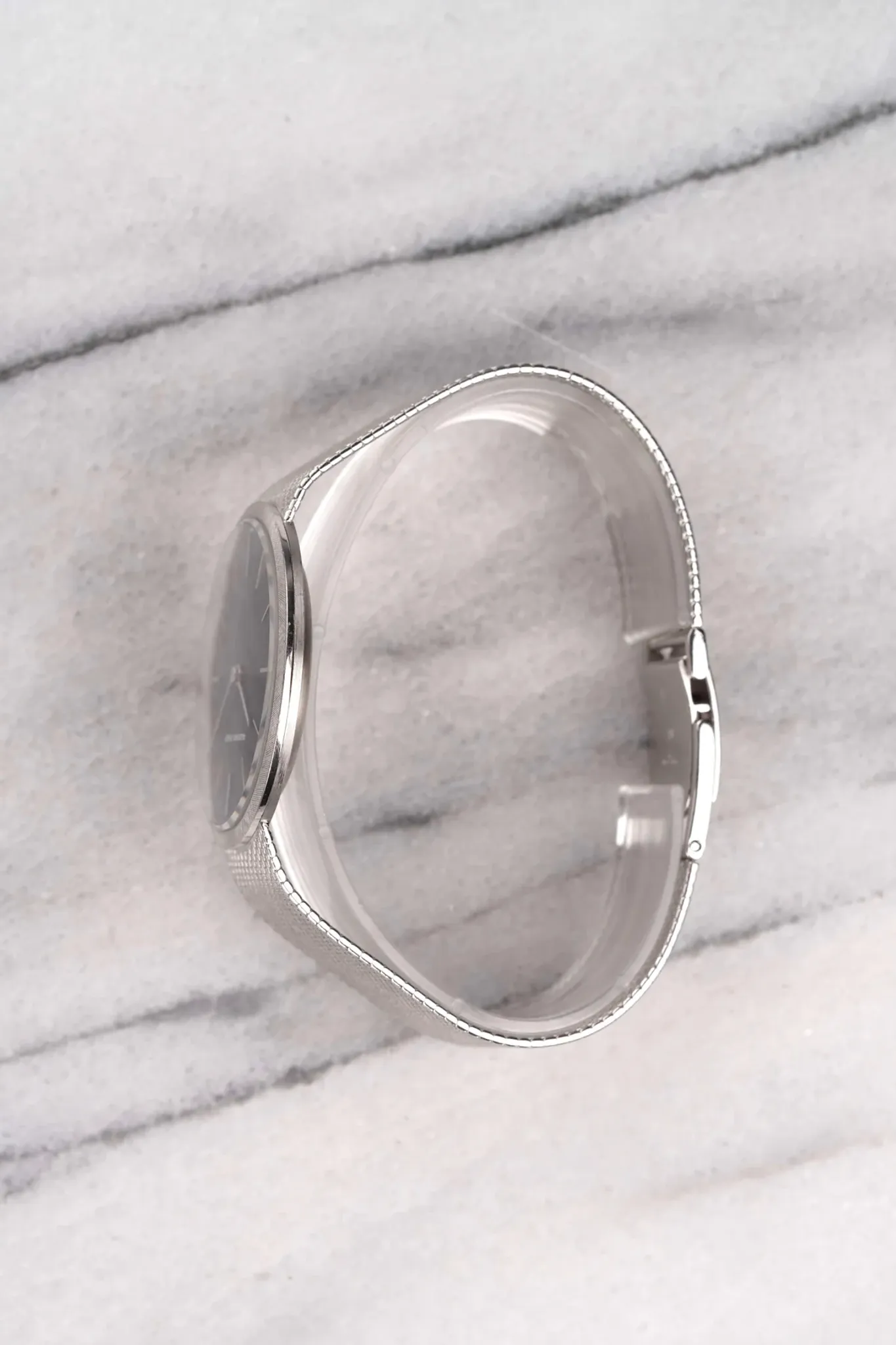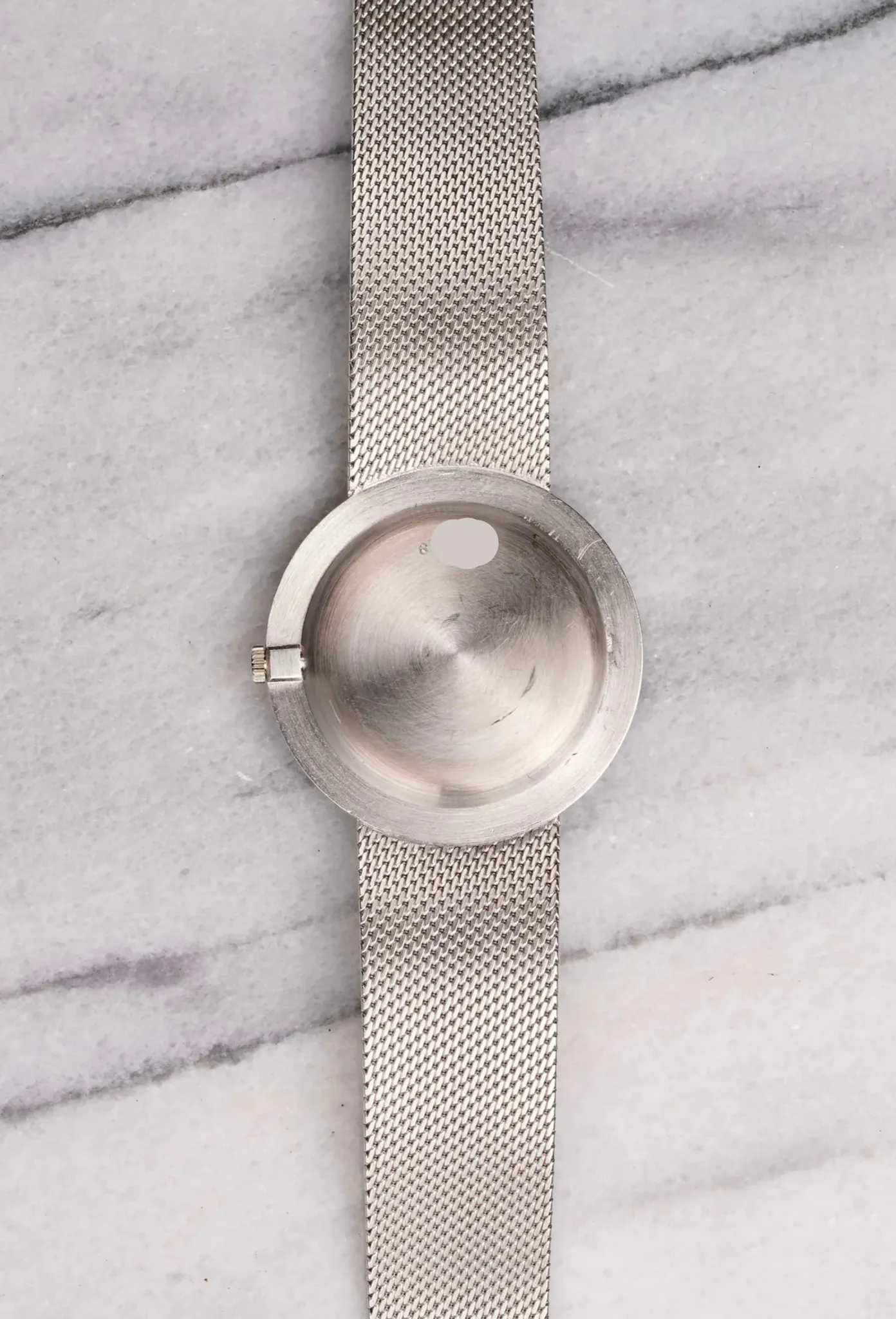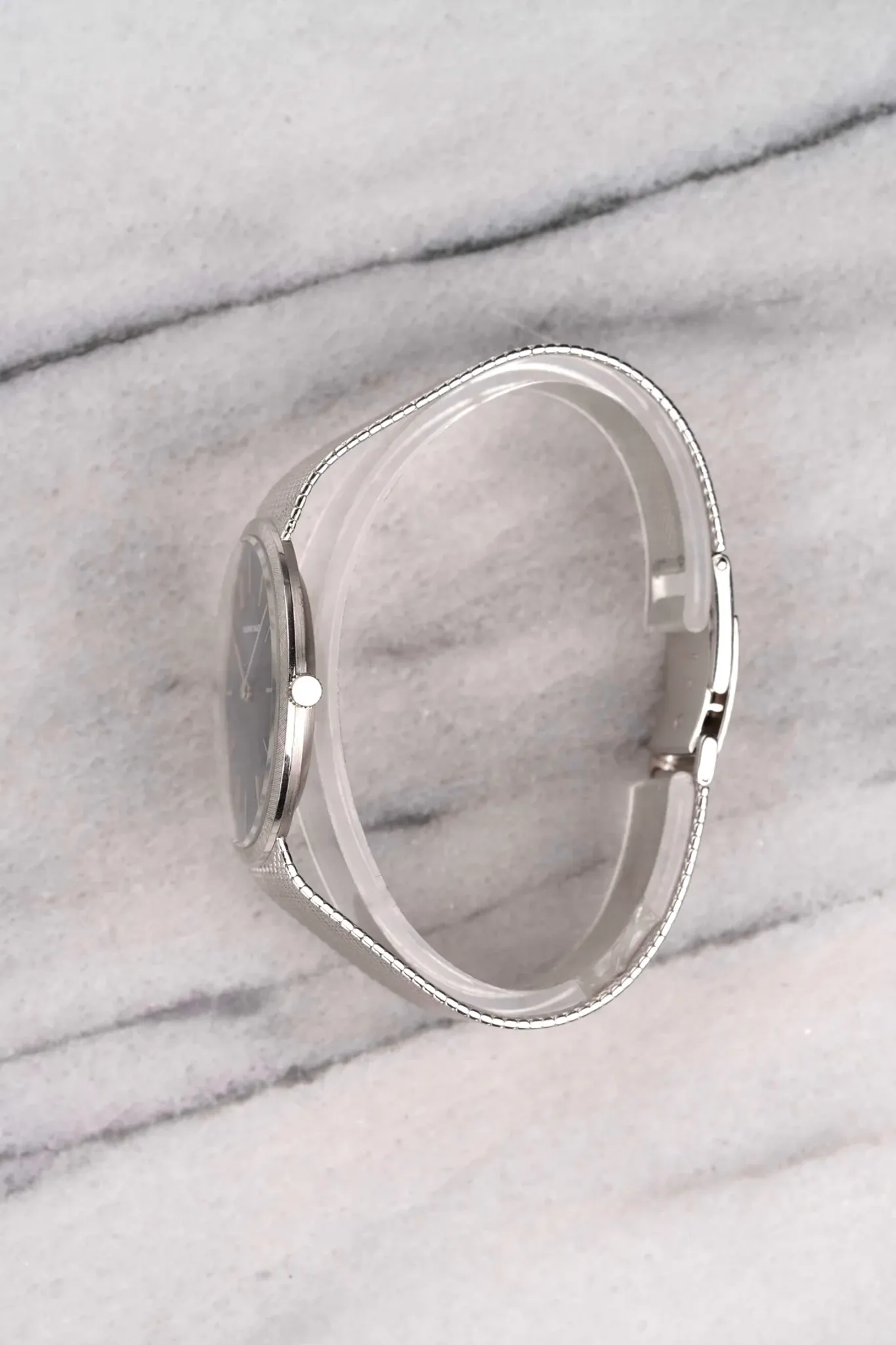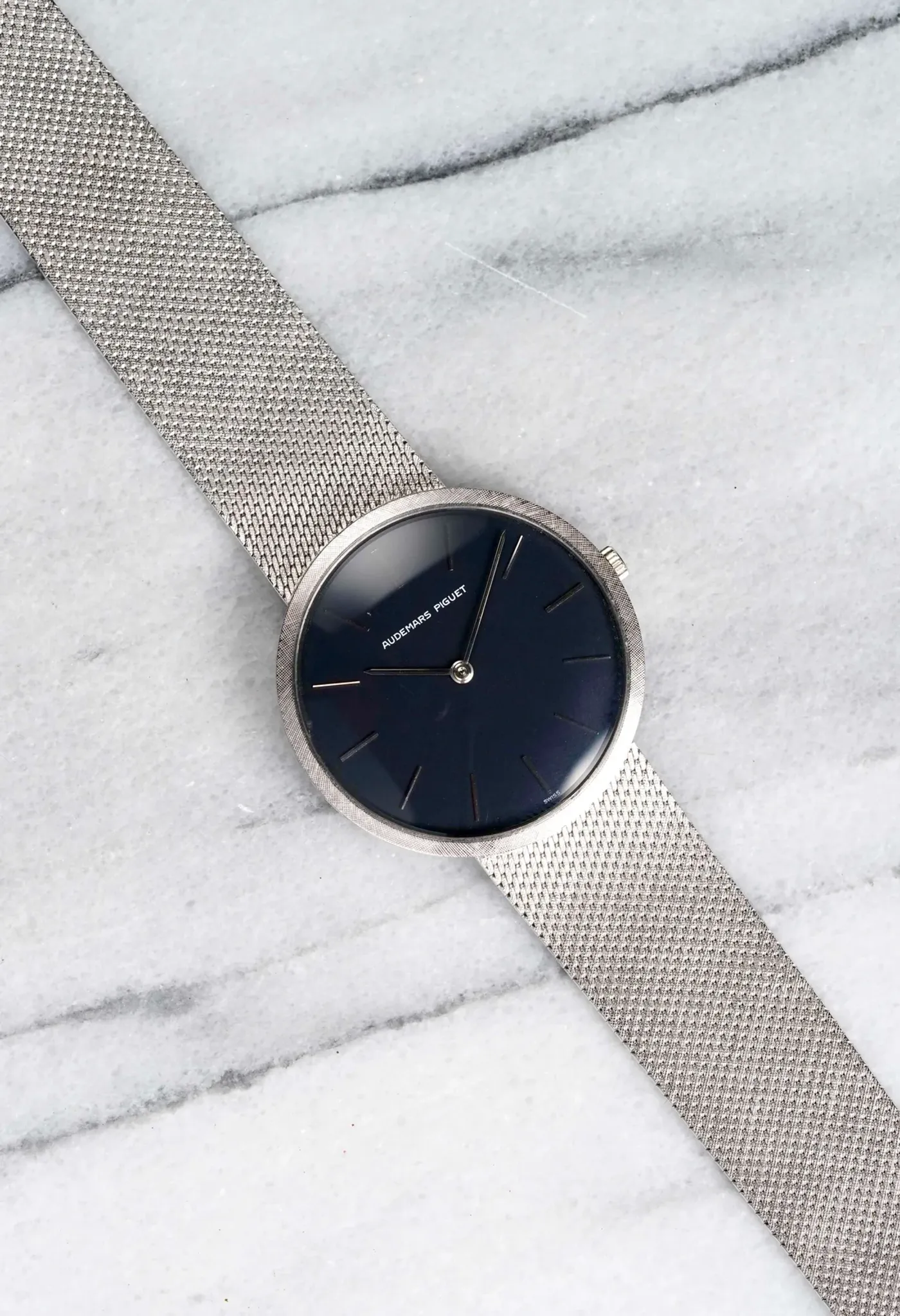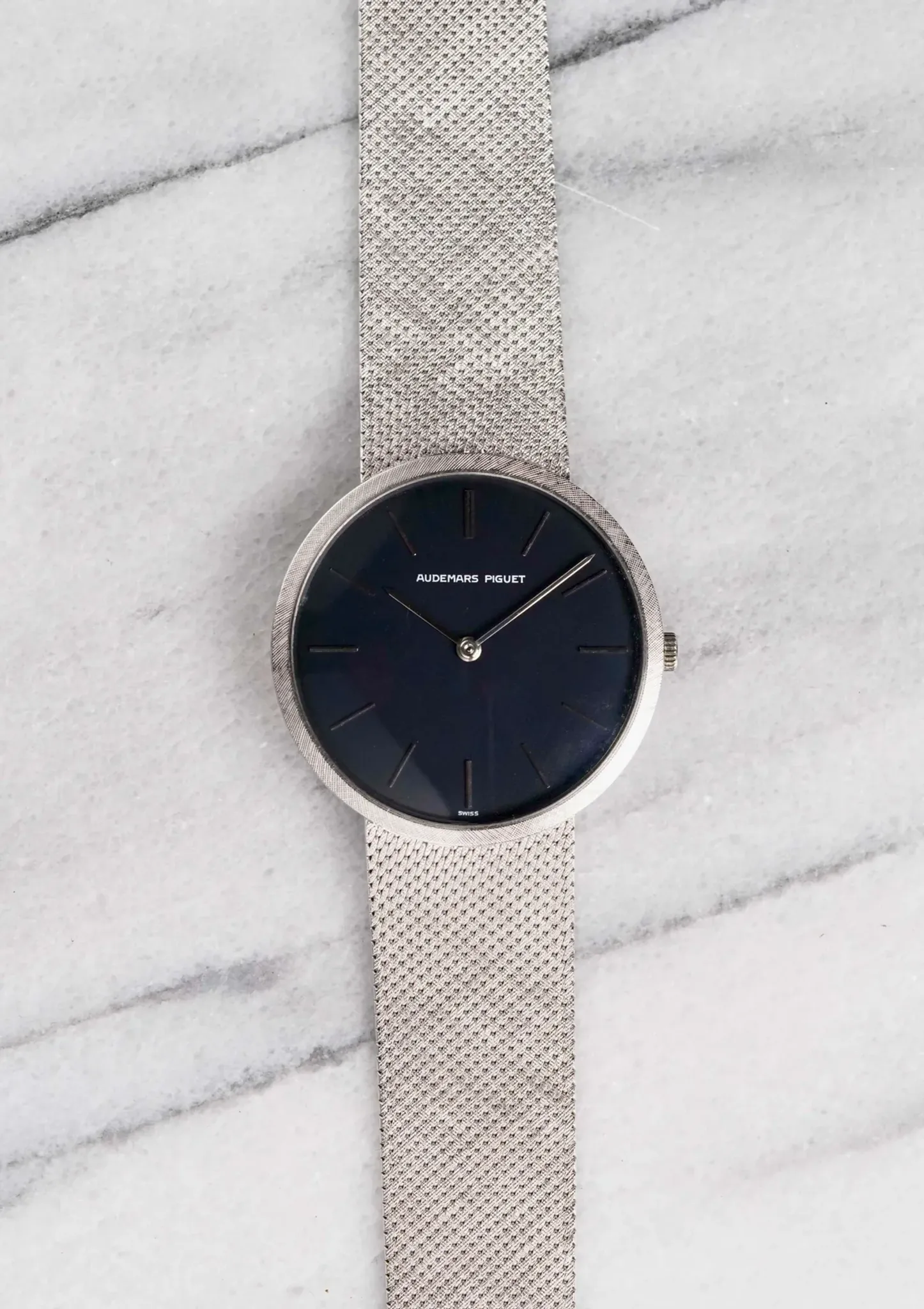Here's a vintage Audemars Piguet with a crisp condition matte blue dial. It is powered by a manual wind movement and paired with its original integrated 18K white gold bracelet. The case is 18K white gold. Keeps great time and is fully functional. The watch is dated to the late 1970s. The bezel has a unique Florentine finish. The integrated gold bracelet fits wrists of 6.5-6.75 inches. 18K gold case, bracelet, and case back, 35mm case including the crown. All parts are original including dial, movement, and case back. Both the dial and case are in great cosmetic, untouched condition.