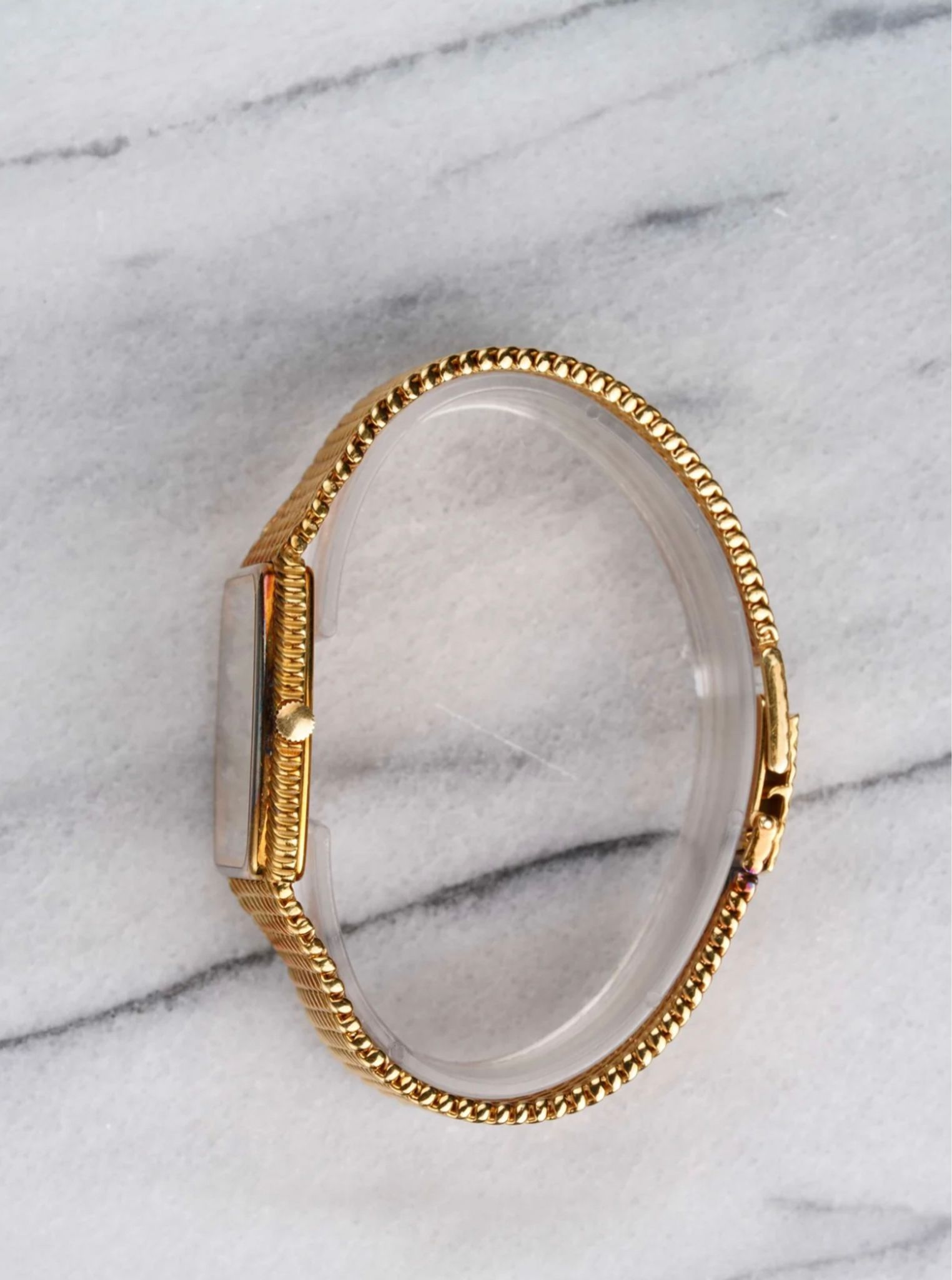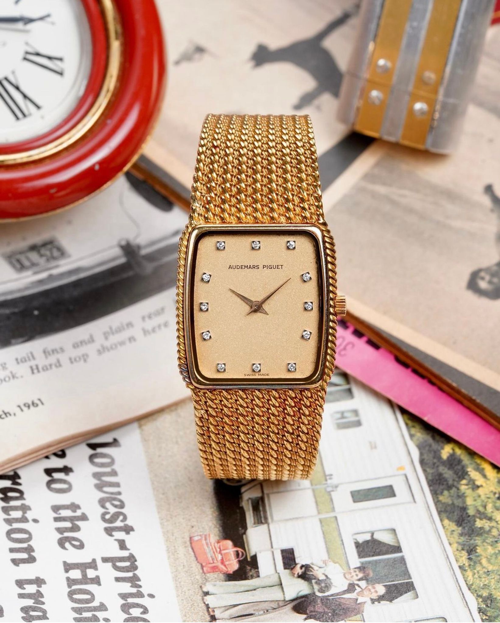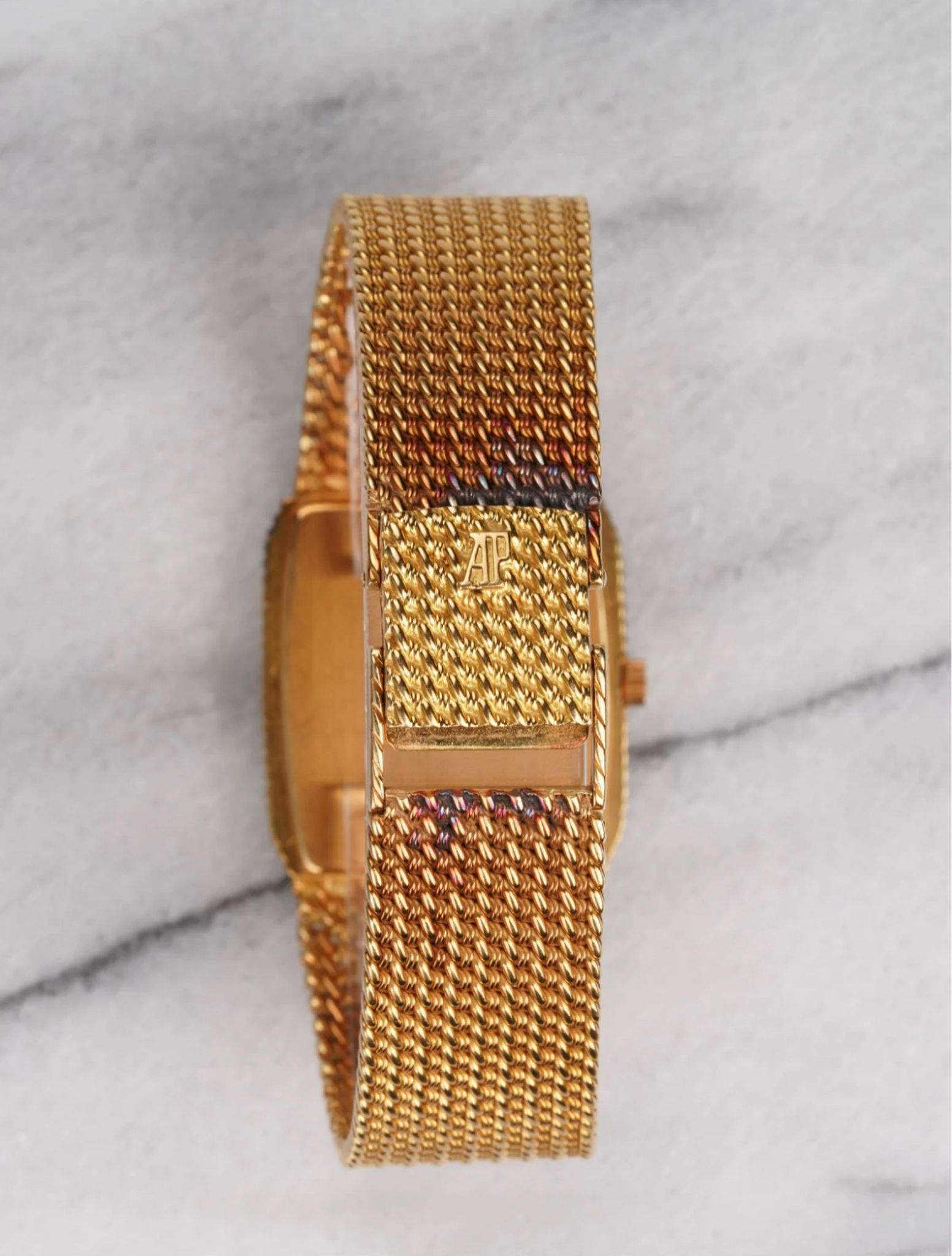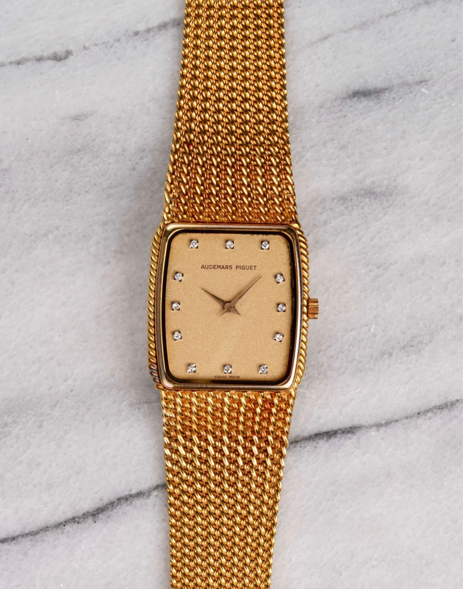 Here we have a vintage Audemars Piguet quartz in 18k yellow gold with a champagne diamond dial from the 1980s. Tonneau case. Keeps great time and is fully functional. Measurements of the case is 30x30mm including the crown. It's on its original matching integrated 18k yellow gold bracelet measuring 6.75-7.25 inches long with its micro adjuster. Champagne stardust dial finish throughout. The piece is quite heavy! 18K yellow gold case and cashback. Both the dial and crystal are free from any scratches. Theres a matching braided texture on both the bezel and bracelet. The bracelet has signs of oxidation due to turning purple as seen in photos. The bracelet is fully integrated with a woven finish through the case. All parts are original including the dial, crown, movement, and caseback. Both the dial and case are in great cosmetic, untouched condition.