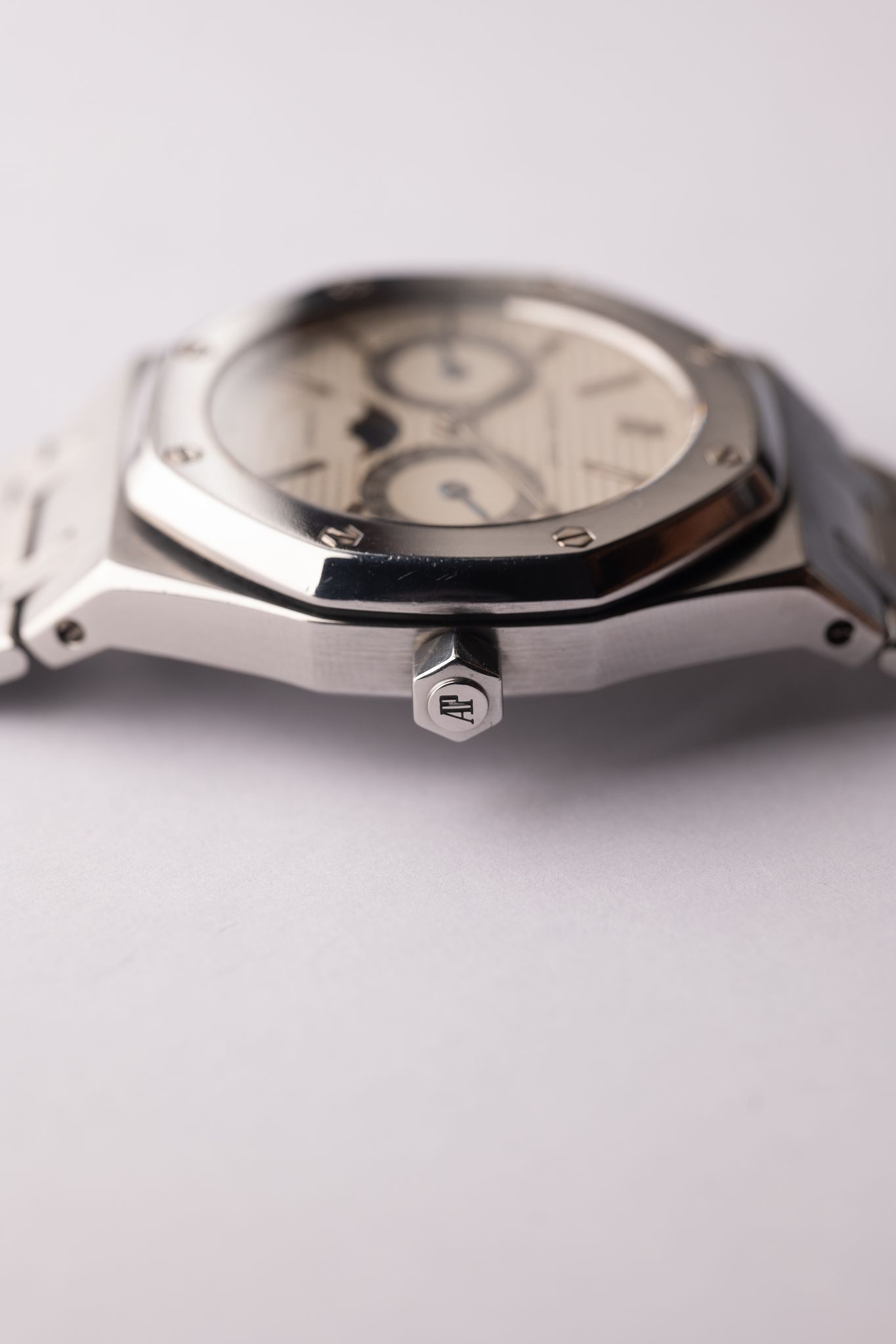 The 25594st MK2 Steel moon phase owl is the best Royal Oak in our humble opinion. The 36mm case wears more like a 38mm-39mm watch due to it not having crown guards. As such, the case size doesn’t feel very different than a typical Submariner. We love this watch for a number of reason, least which is the balanced dial with moon phase functionality. This case is in excellent condition and appears very thick. Very little slack on the bracelet. The bracelet will fit a 7” wrist.The AP chronicles has the following info on sales numbers;
