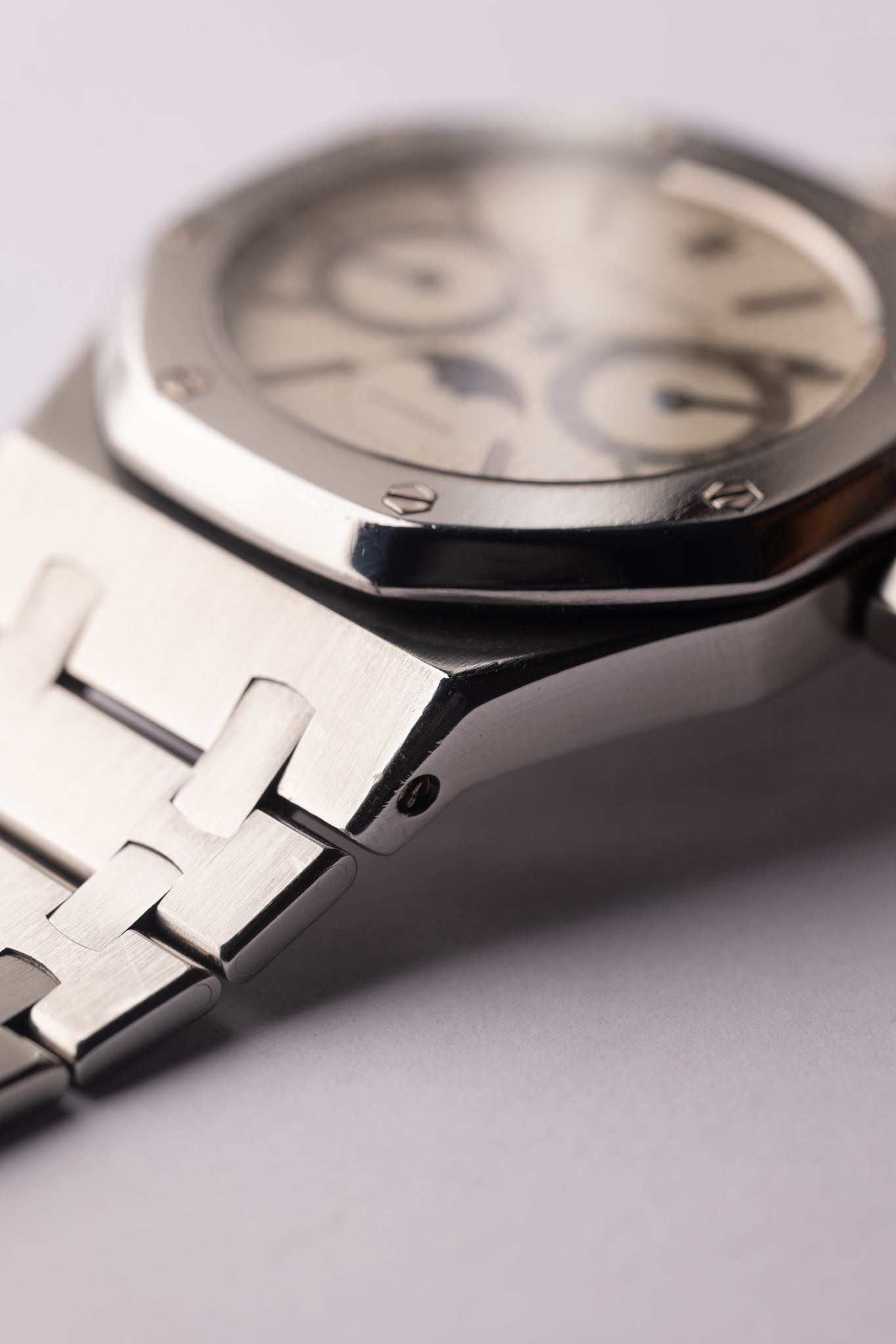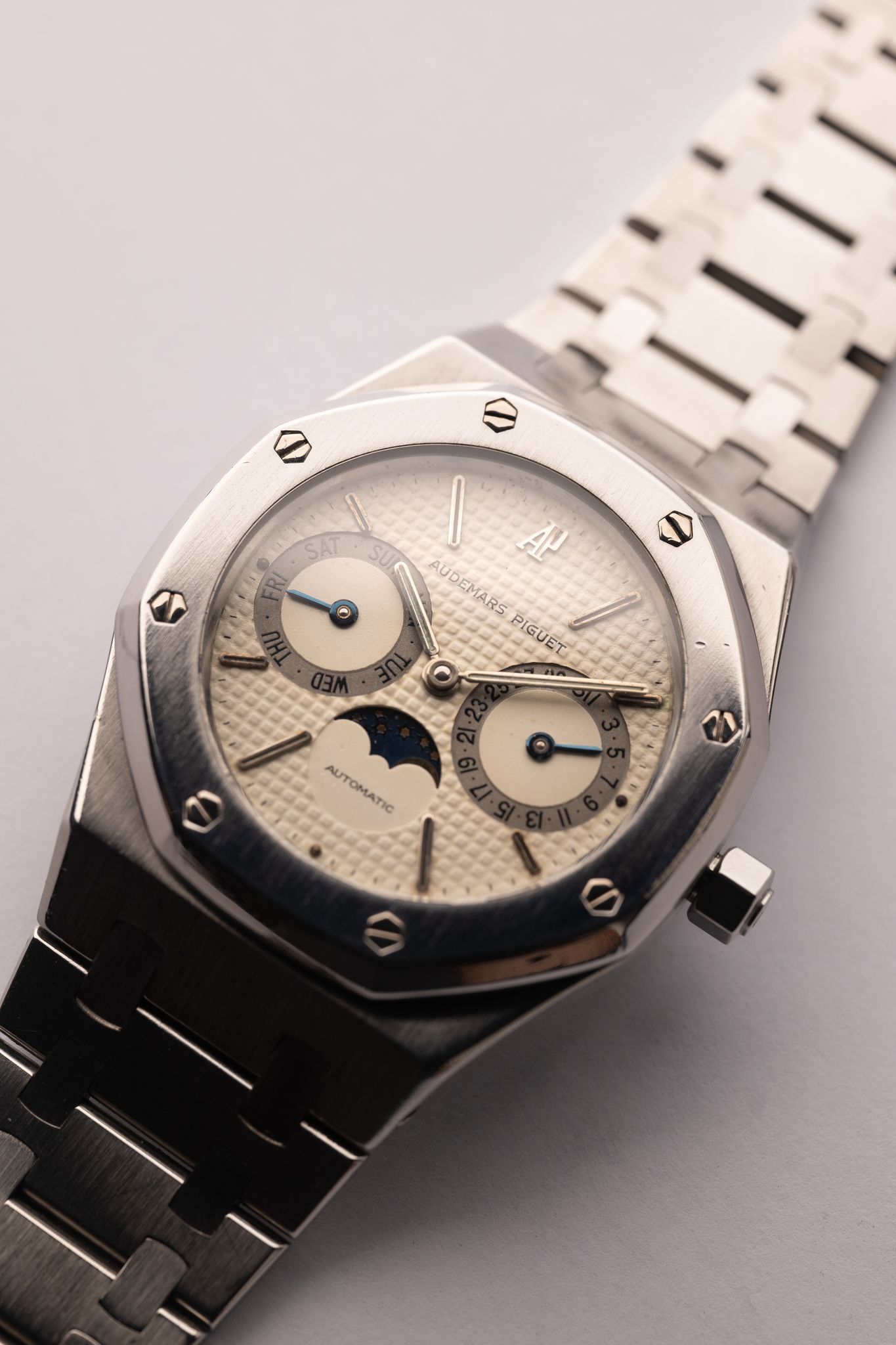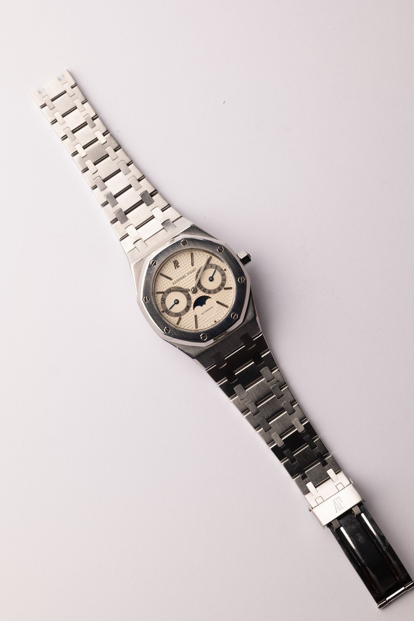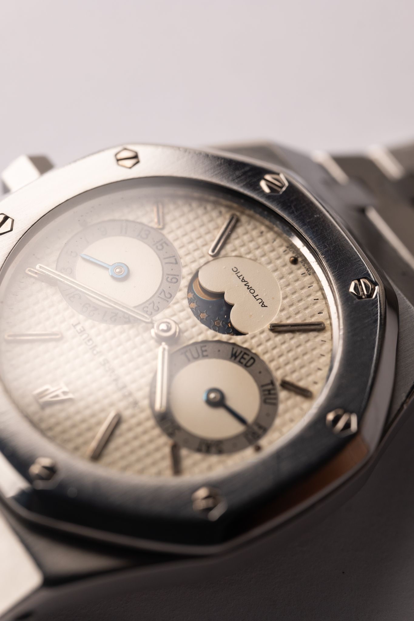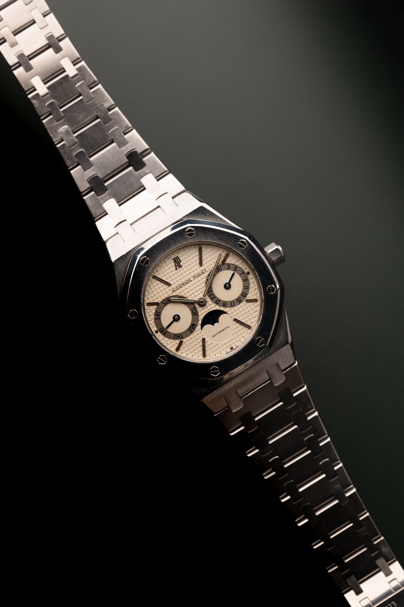 “From 1984 to 2001, the Royal Oak Day Date Moon Phase 25594SA appeared in a two-tone combination. The dial picks up the colour of the case middle, the crown and the eight screws punctuating the bezel. All other elements are yellow, with the notable exception of the night sky surrounding the moon. In 2001, the dial became noticeably lighter for this and many other models.