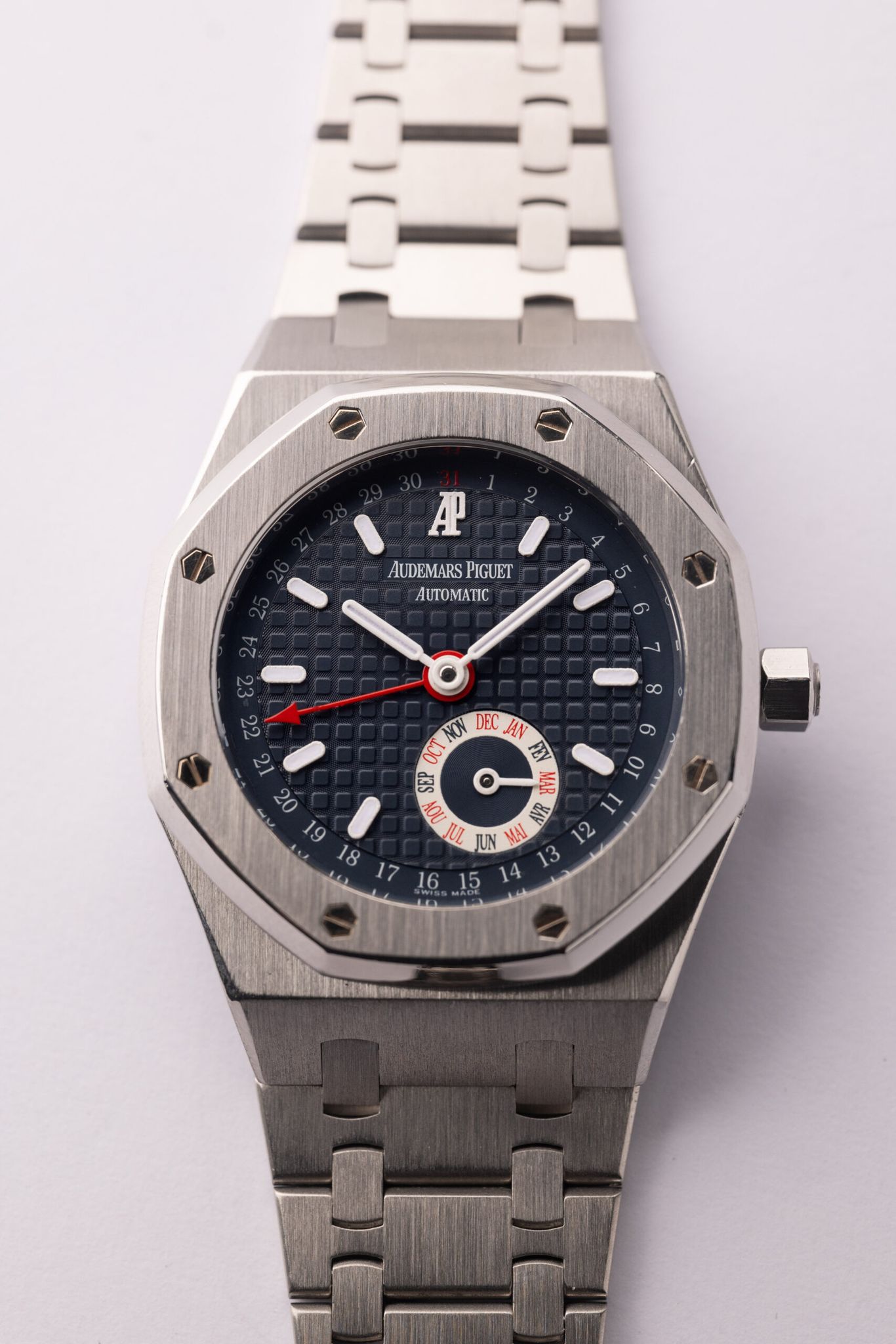 Audemars’ monohull espoused to the Royal Oak’s first and only Annual Calendar complication. The Grande Tapisserie dial features a date surround and month subdial at five, whose complication differentiates between the 30th/31st month depending, while needing adjustment only once a year at the end of February – an uncommon complication housed within famed Royal Oak architecture. Produced within a small timeframe, between the mid-1990s and early 2000s, the 25920 remains Piguet’s only Annual Calendar complication.