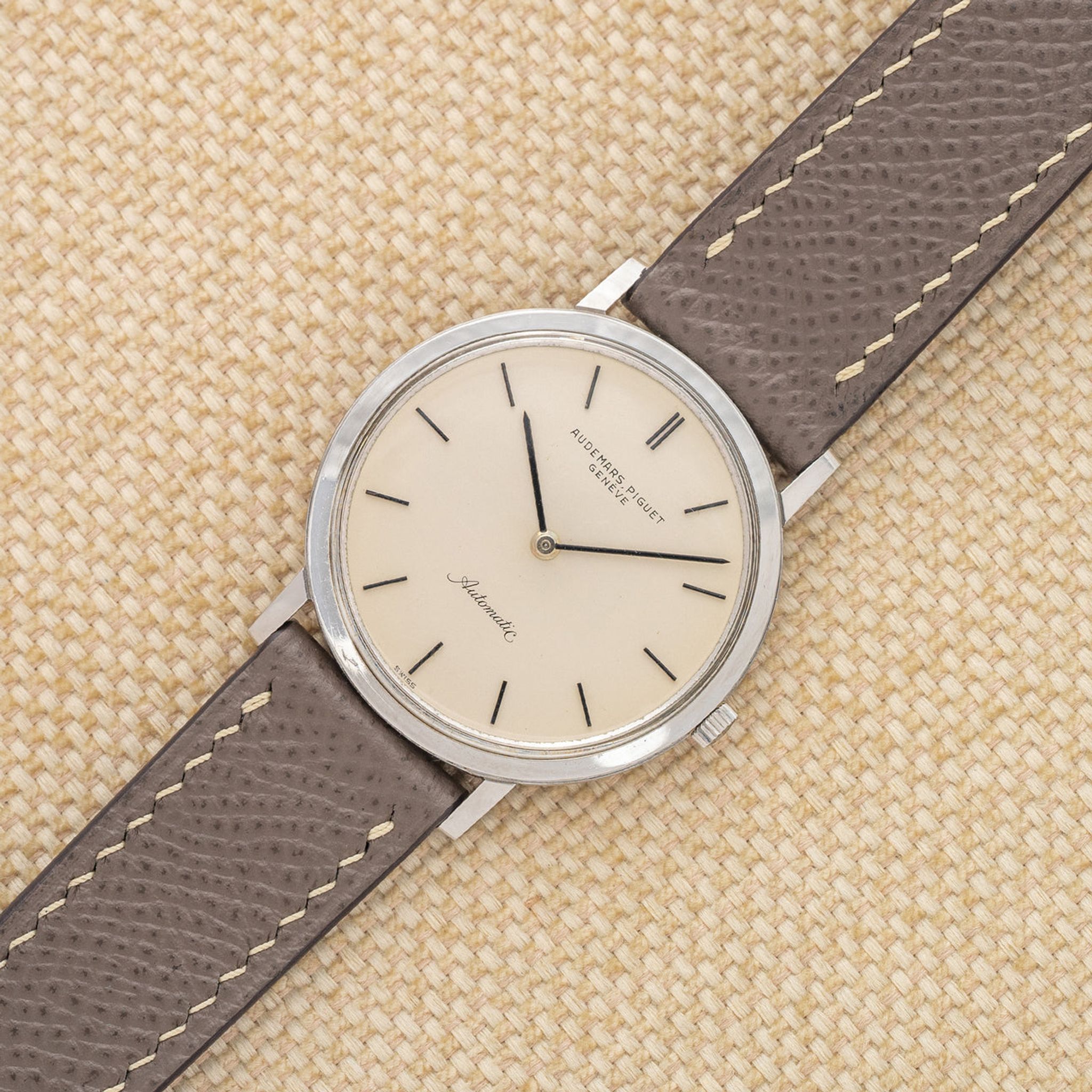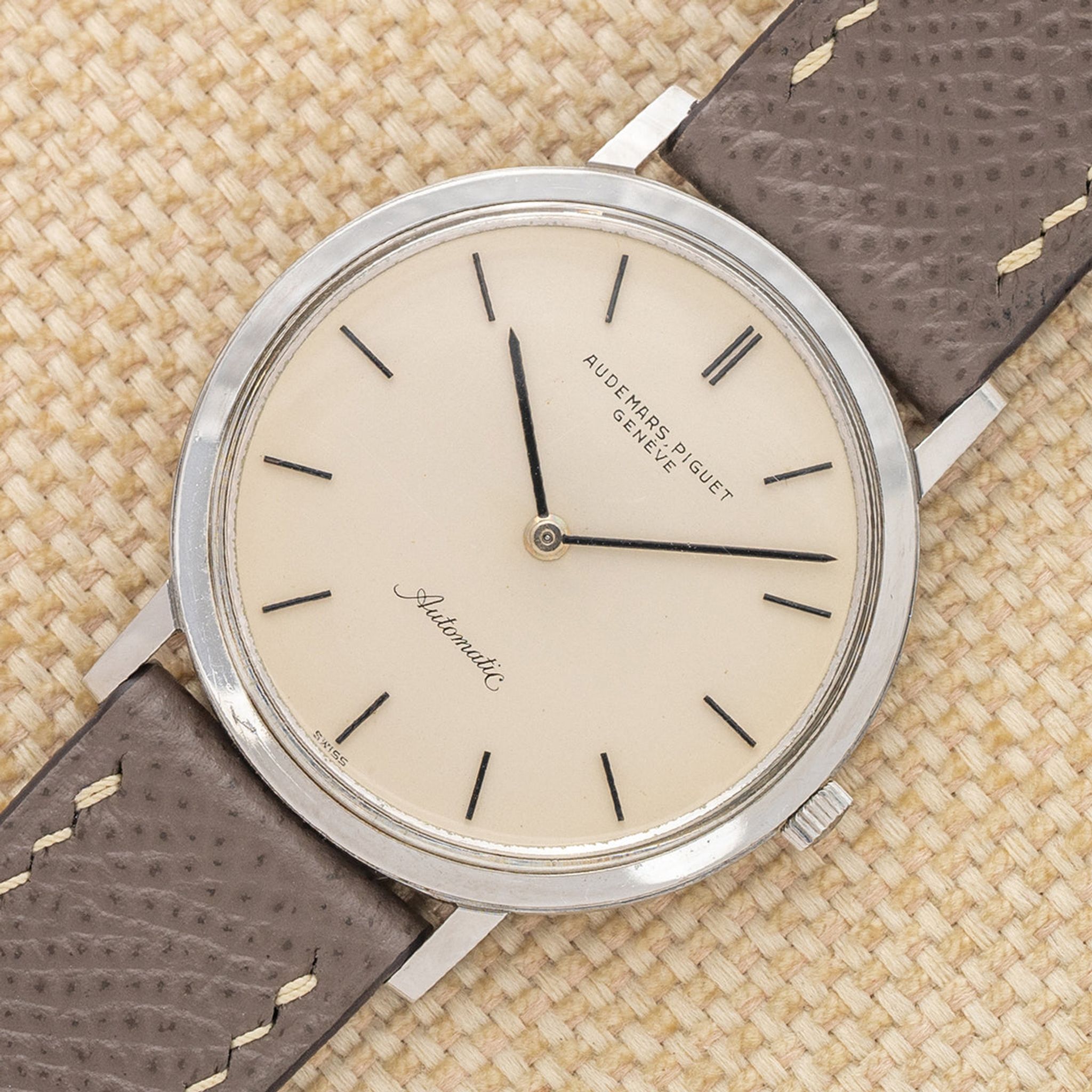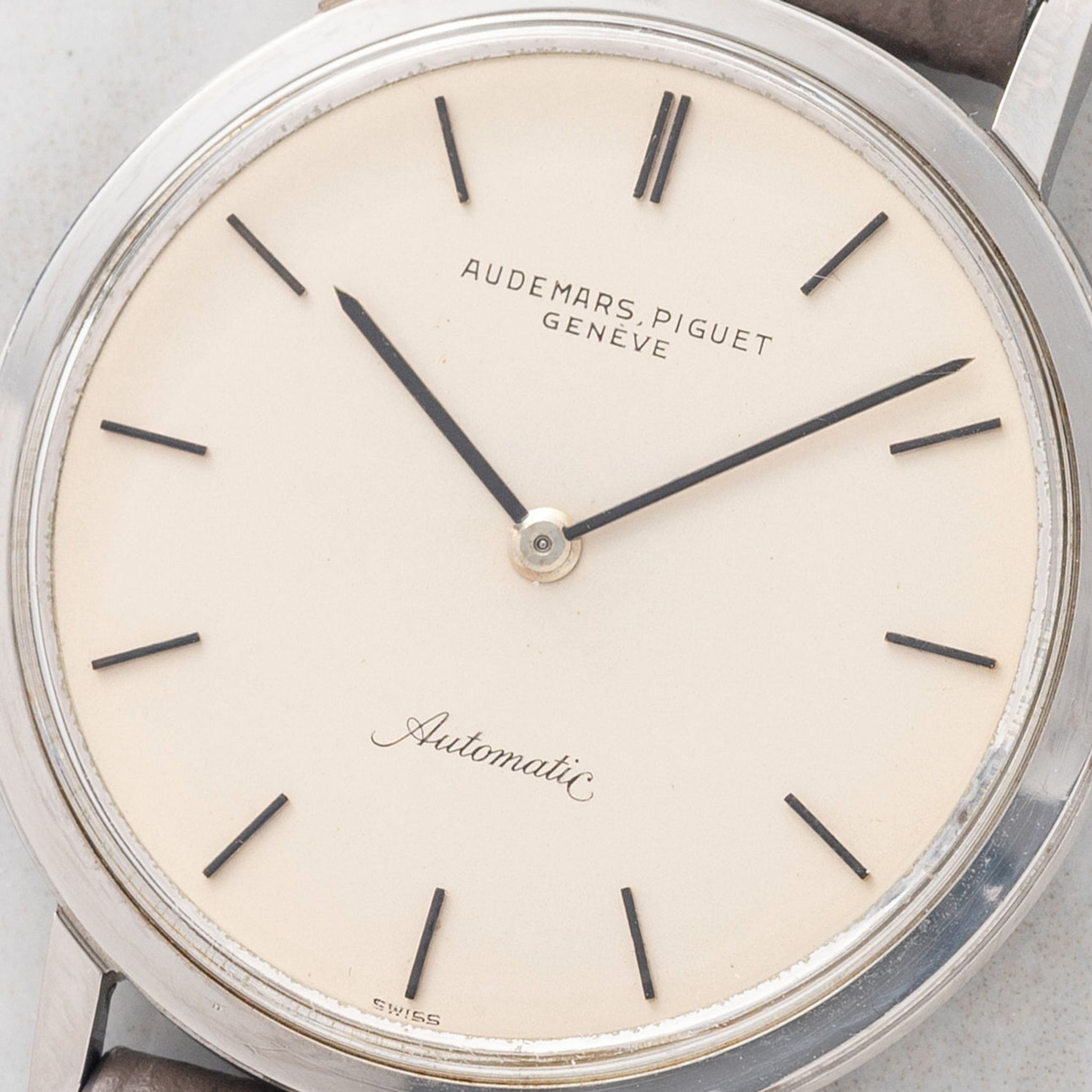 Audemars Piguet's ref. 5273 is a very rare vintage find with elegant proportions of 34mm, and just 5.9mm in thickness. The dial displays a beautiful "Automatic" text referencing the high grade caliber 2120 it houses. This movement is historically important due to its use in both of the first series of the Royal Oak (ref. 5402), as well as the Patek Philippe Nautilus (ref. 3700).