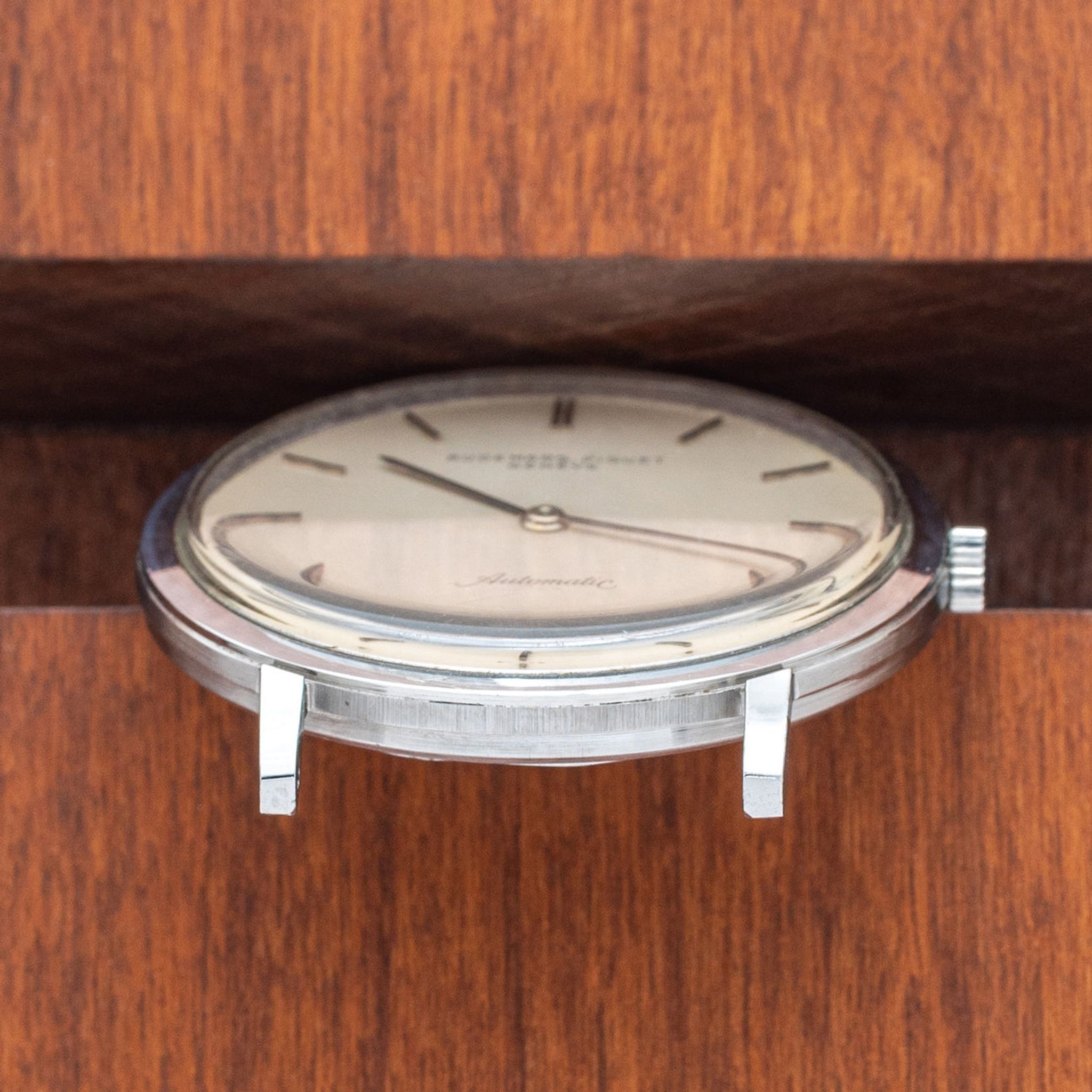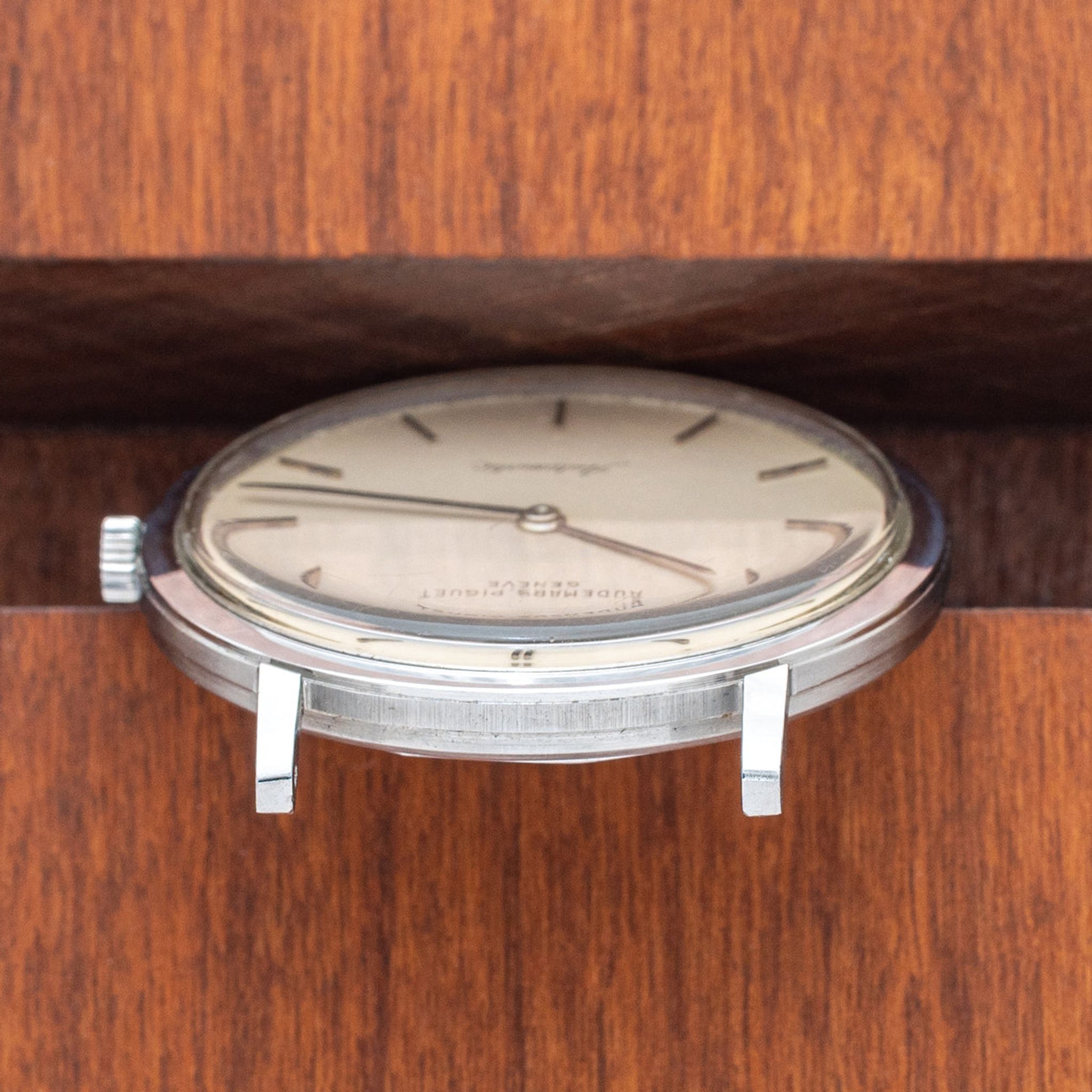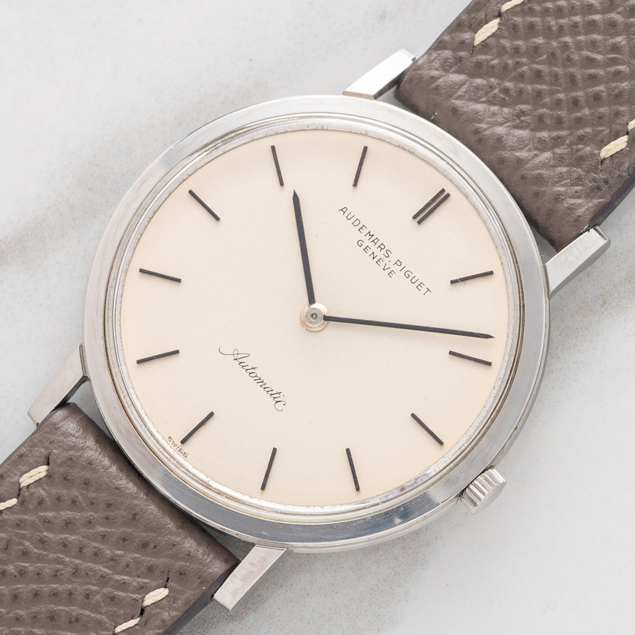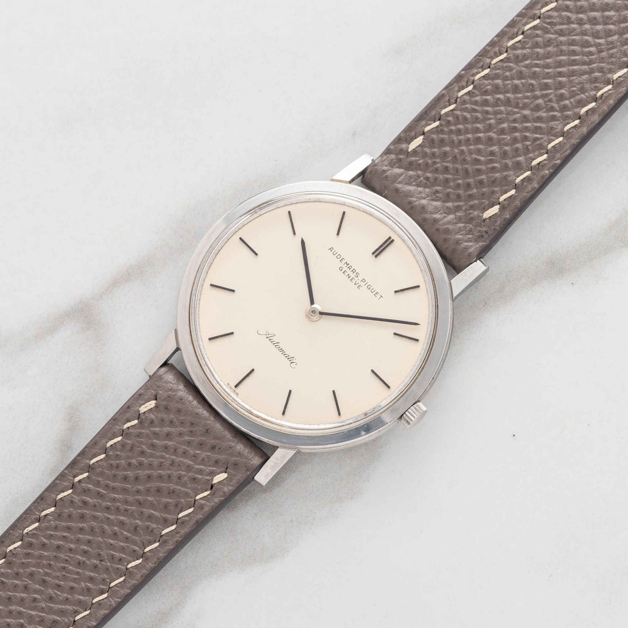 Audemars Piguet's ref. 5273 is a very rare vintage find with elegant proportions of 34mm, and just 5.9mm in thickness. The dial displays a beautiful "Automatic" text referencing the high grade caliber 2120 it houses. This movement is historically important due to its use in both of the first series of the Royal Oak (ref. 5402), as well as the Patek Philippe Nautilus (ref. 3700).