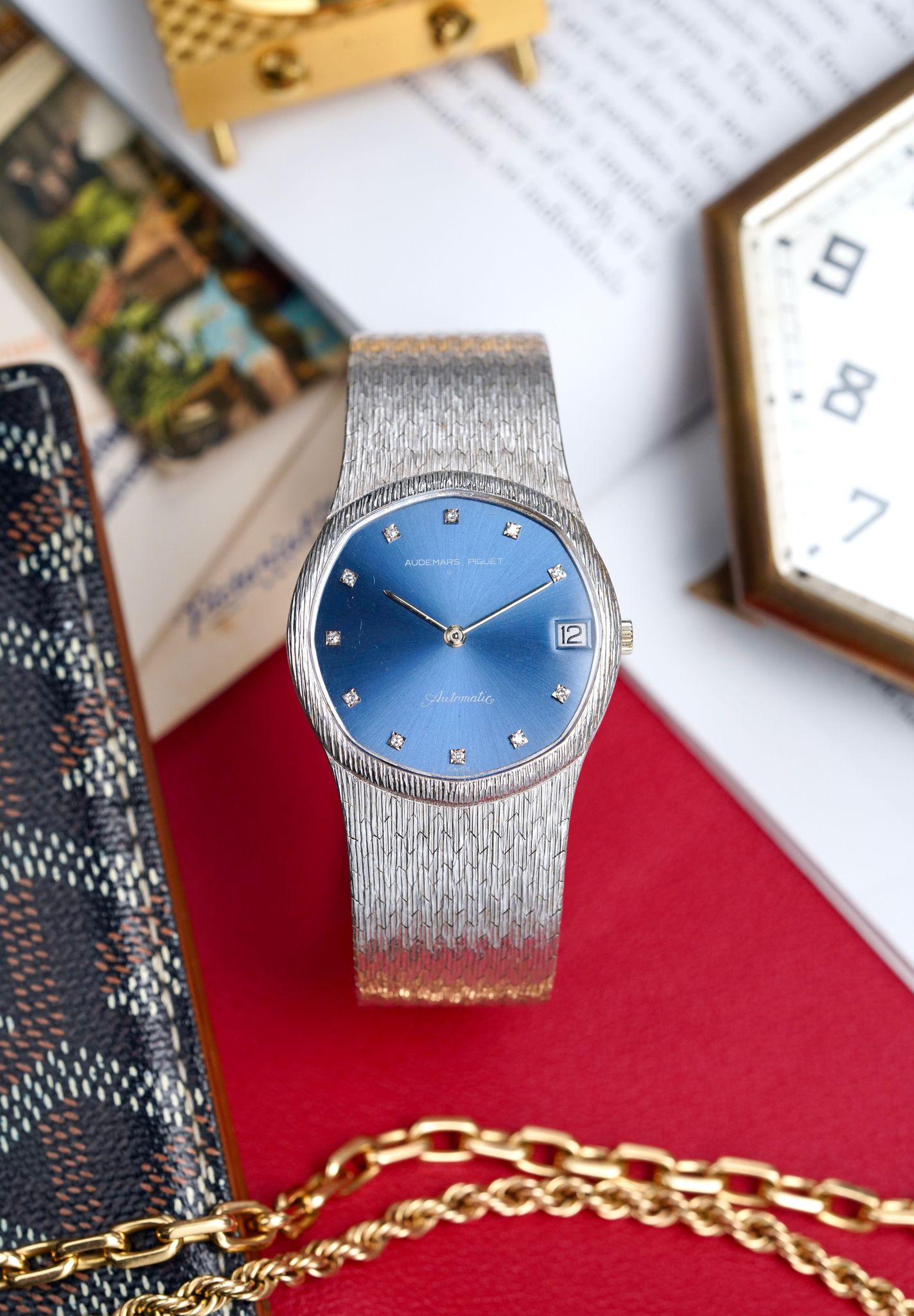 Here we have a vintage Audemars Piguet reference 5388 automatic in 18k white gold with a beautiful blue diamond dial from the 1980s. Keeps great time and is fully functional. Measurements of the case is 30mm including the crown. Quickset date function at 3 a clock. It's on its original matching integrated 18k white gold bracelet measuring 7 inches long with its micro adjuster. 18K white gold case and cashback. Both the dial and crystal are free from any scratches. The bracelet is fully integrated with a woven finish through the case. Unusual to find this in an automatic iteration. All parts are original including the dial, crown, movement, and caseback. Both the dial and case are in great cosmetic, untouched condition.