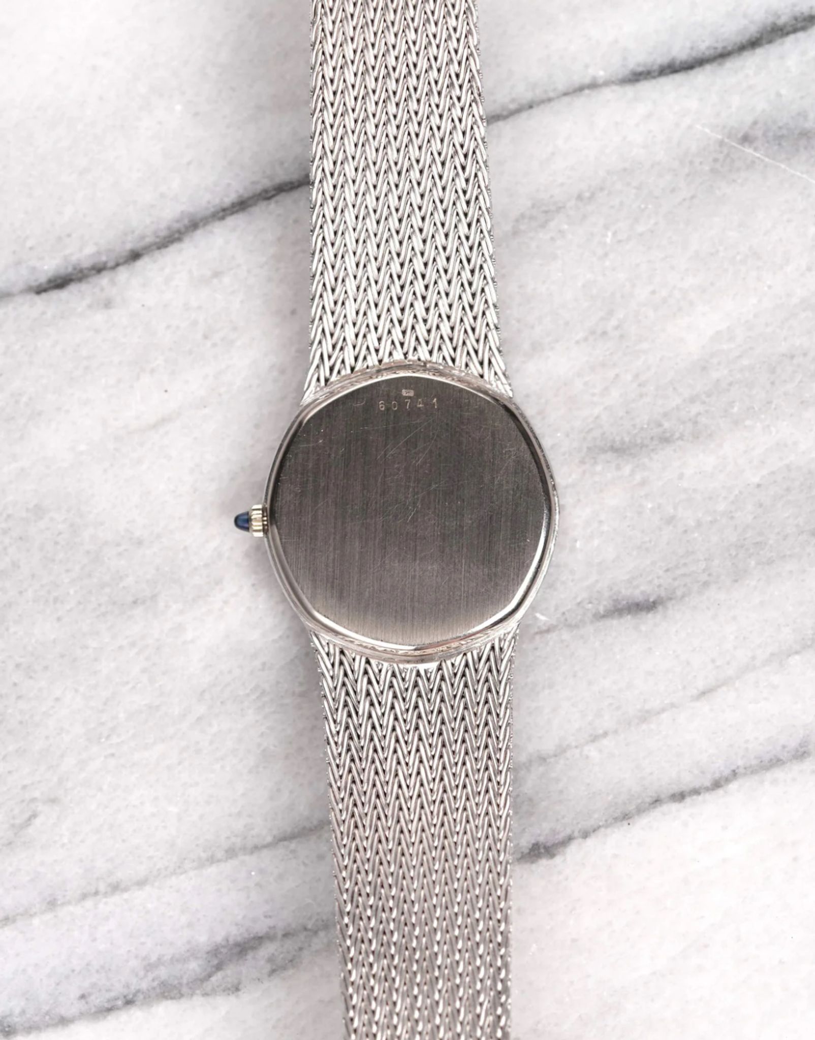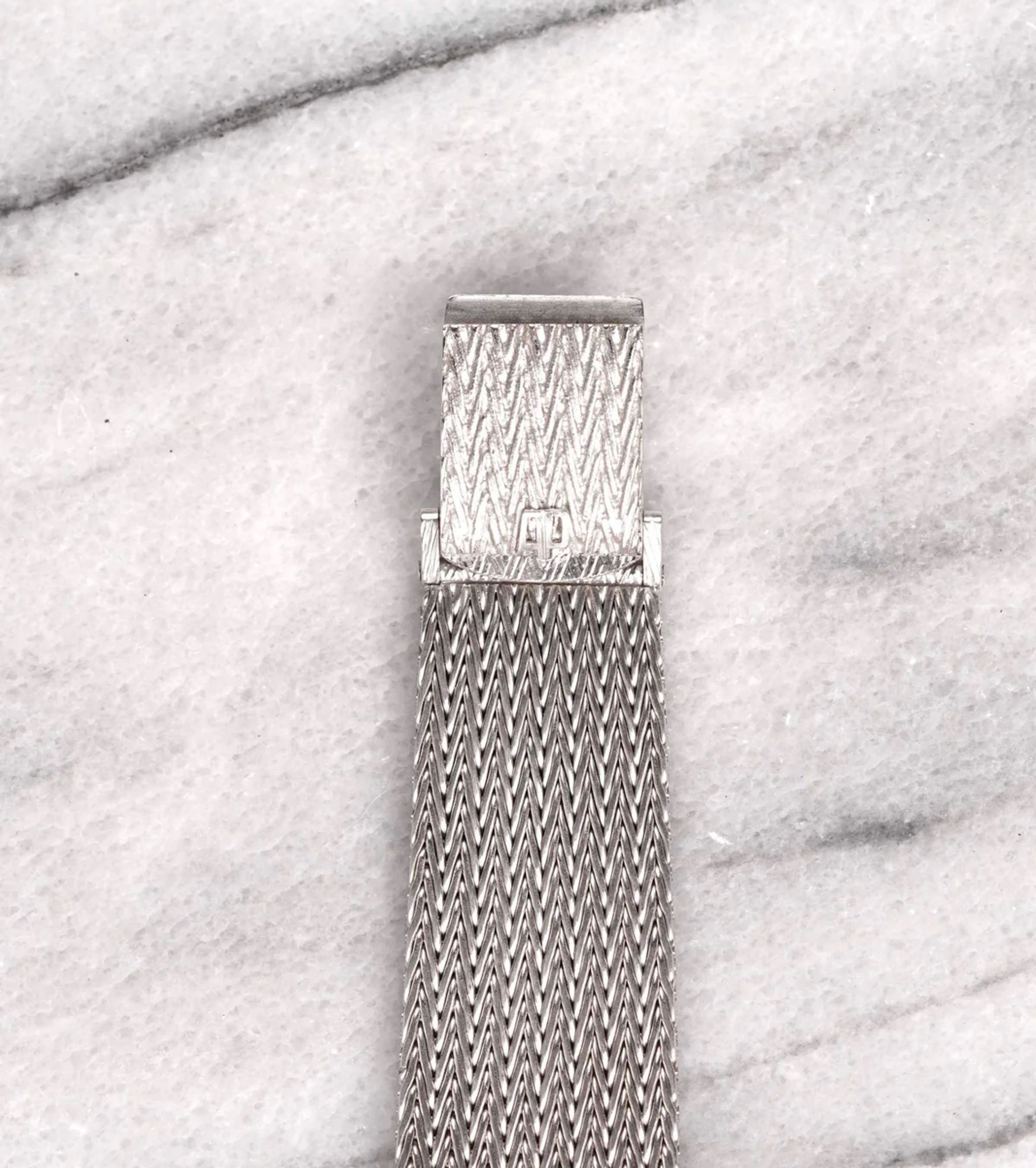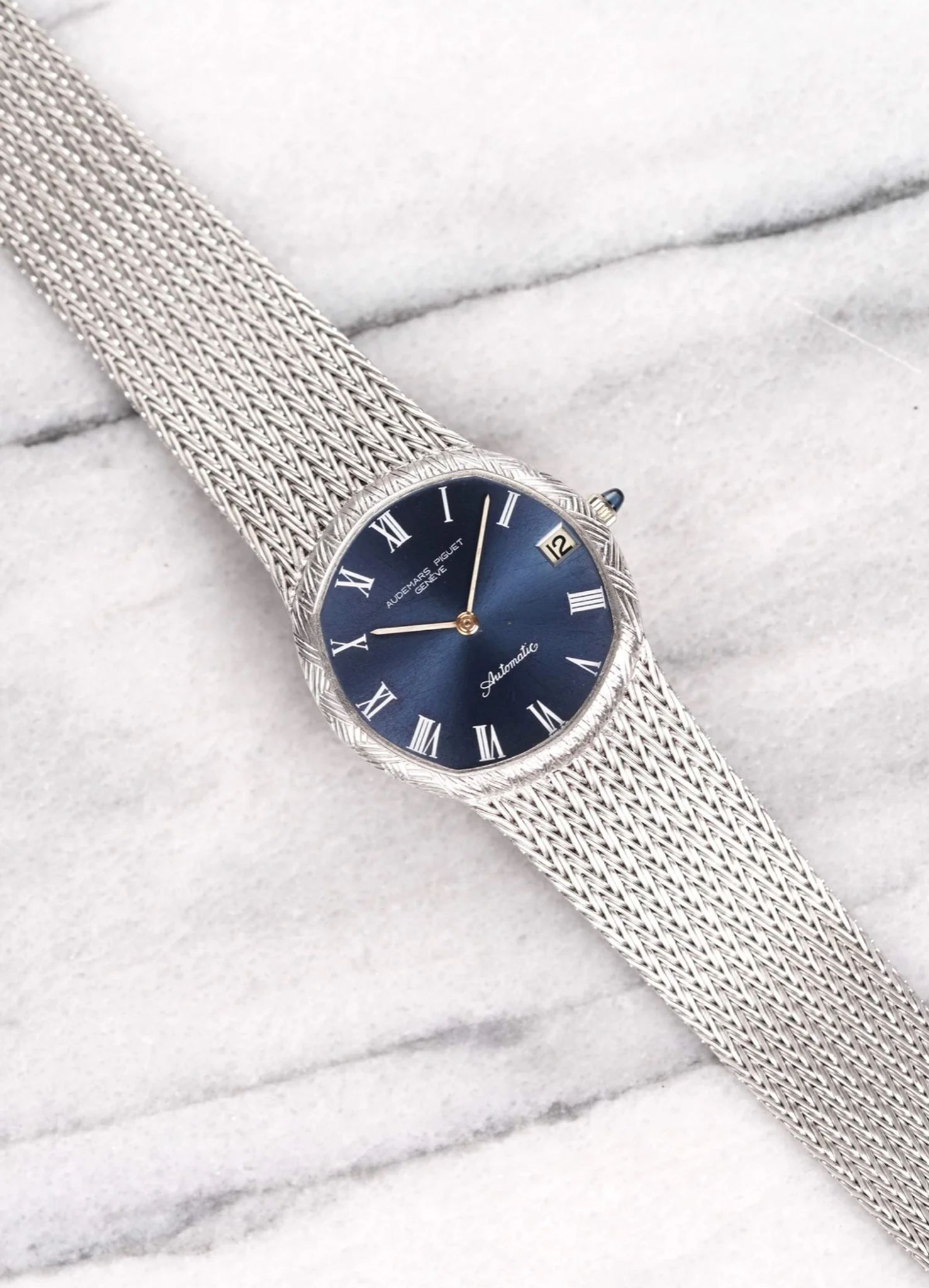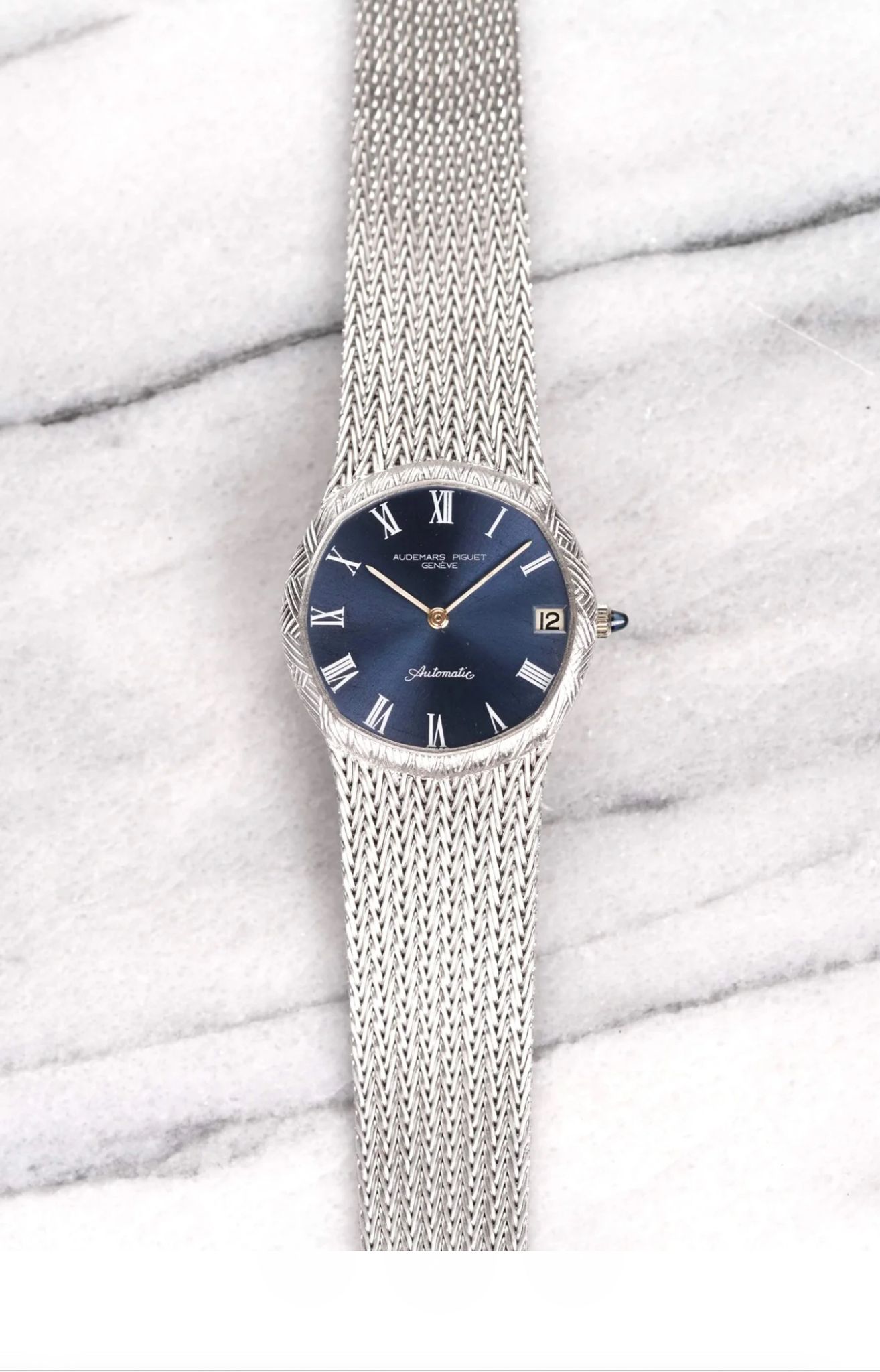Here we have a vintage Audemars Piguet reference 5388 automatic in 18k white gold with a beautiful blue roman numeral dial from the 1980s. Keeps great time and is fully functional. Measurements of the case is 30mm including the crown. Quickset date function at 3 a clock. It's on its original matching integrated 18k white gold bracelet measuring 7 inches long with its micro adjuster. 18K white gold case and cashback. Both the dial and crystal are free from any scratches. The bracelet is fully integrated with a woven finish through the case. Unusual to find this in an automatic iteration. All parts are original including the dial, crown, movement, and caseback. Both the dial and case are in great cosmetic, untouched condition.