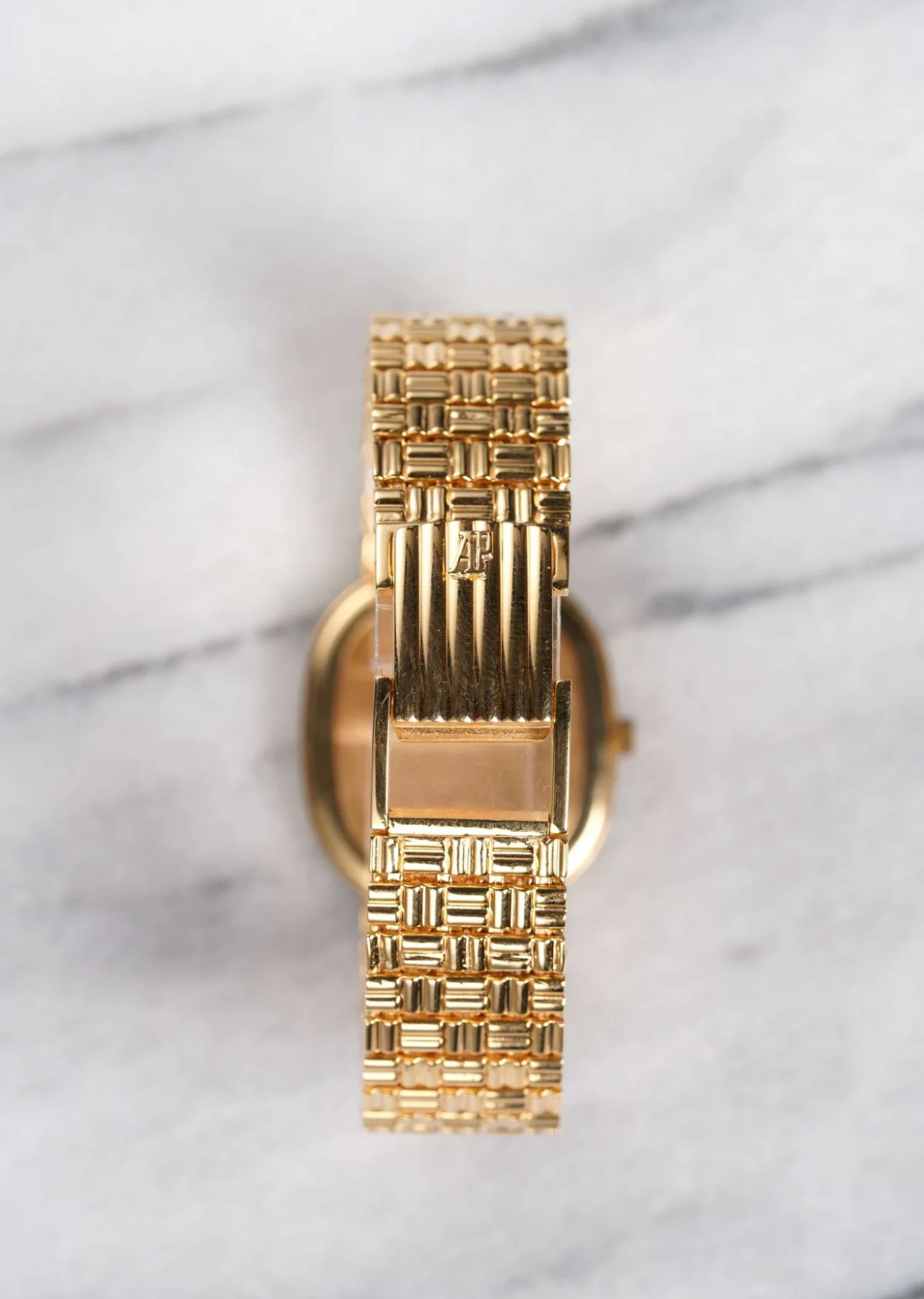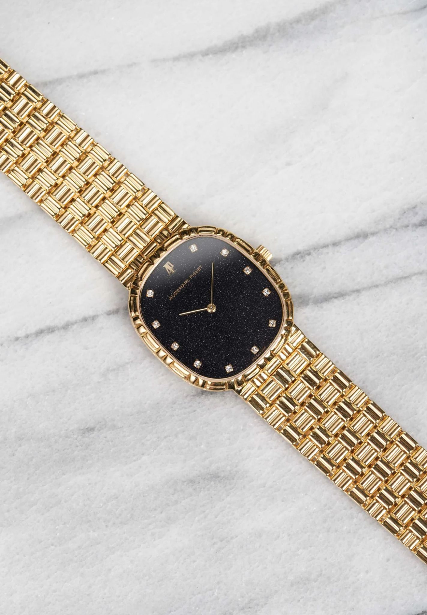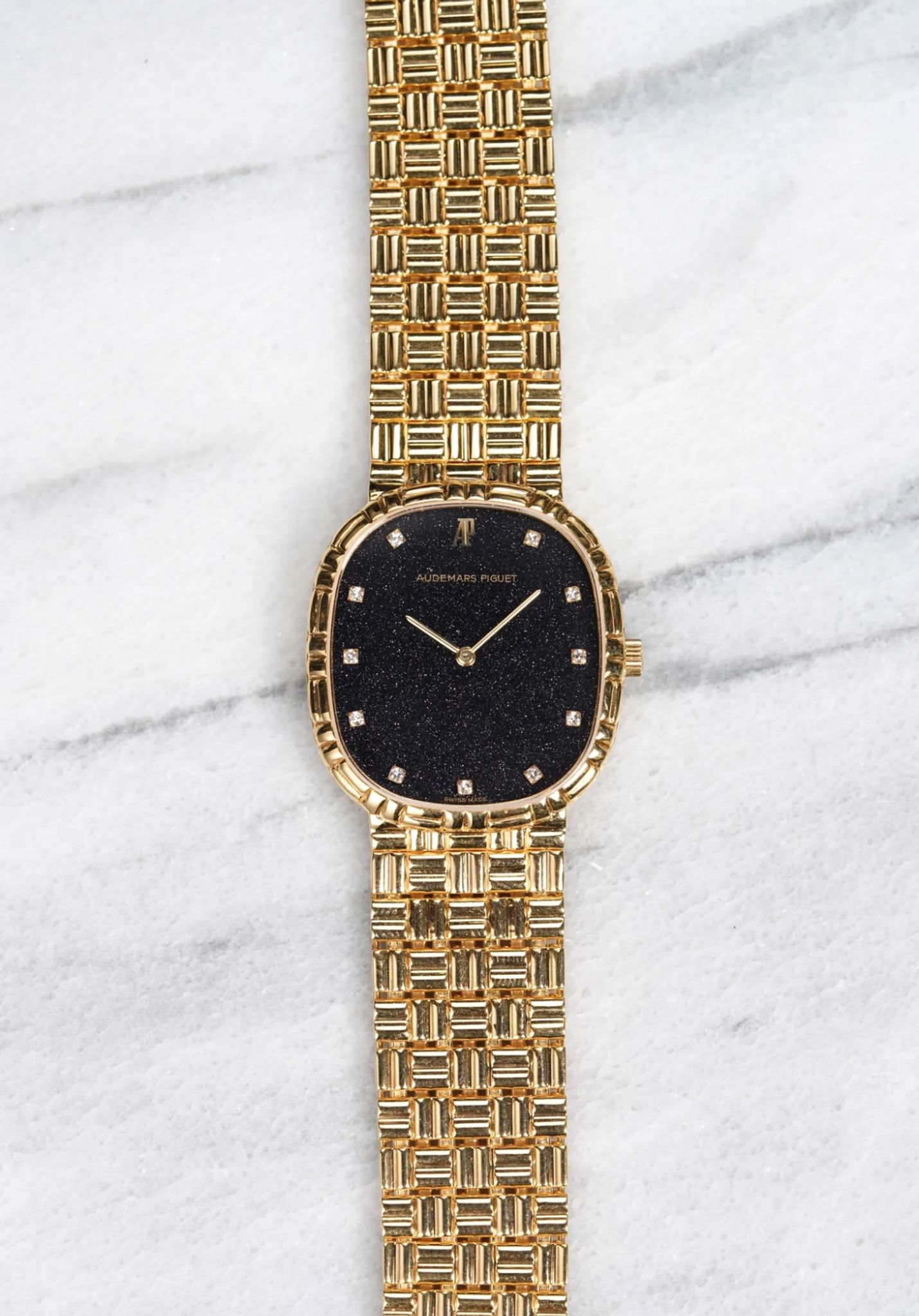 Here we have a vintage Audemars Piguet manual wind in 18k yellow gold with a factory aventurine stone diamond dial from the 1980s. Keeps great time and is fully functional. Measurements of the case is 30x30mm including the crown. It's on its original matching integrated 18k yellow gold bracelet measuring up to 7.25 inch wrist. The total weight of the watch is 91.1 grams. 18K yellow gold case and cashback. Both the dial and crystal are free from any scratches. The bracelet is fully integrated with a puzzle finish through the case. Really rare to find aventurine dials, we have never seen one in this configuration! All parts are original including the dial, crown, movement, and caseback. Both the dial and case are in great cosmetic, untouched condition.