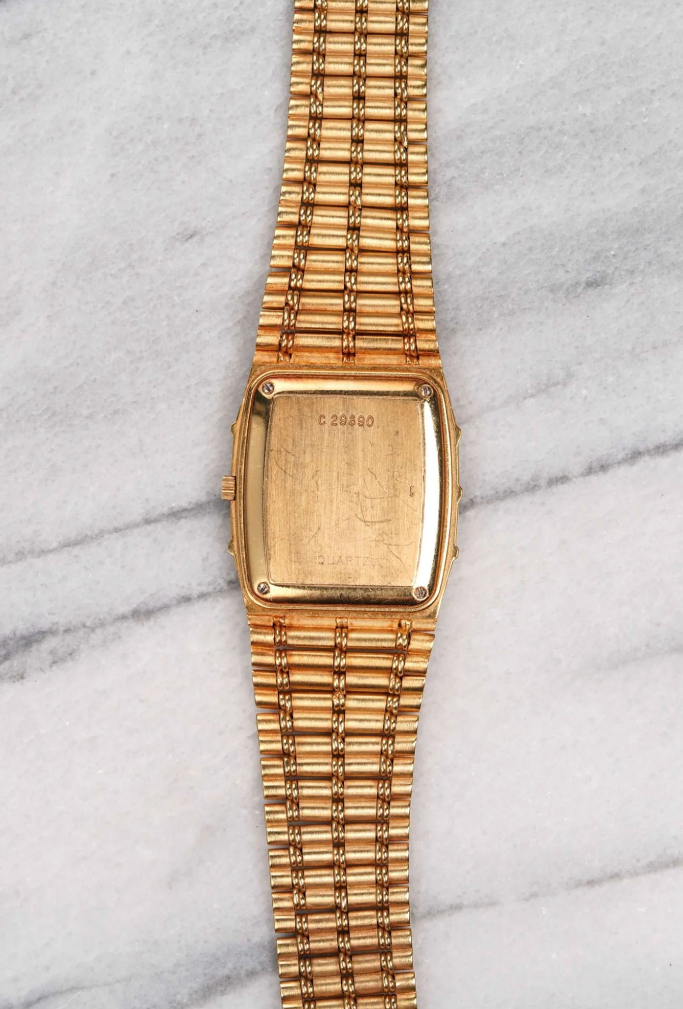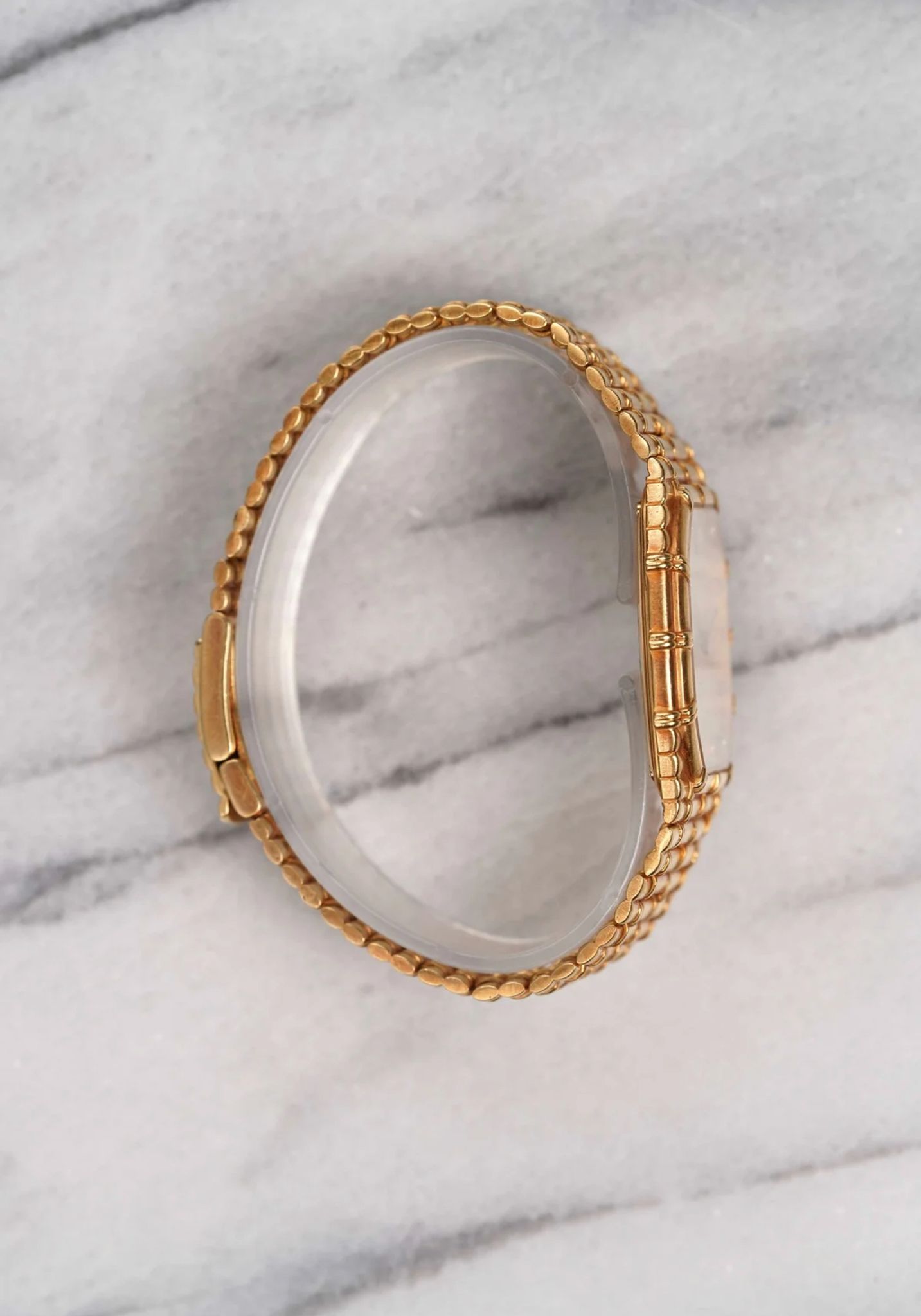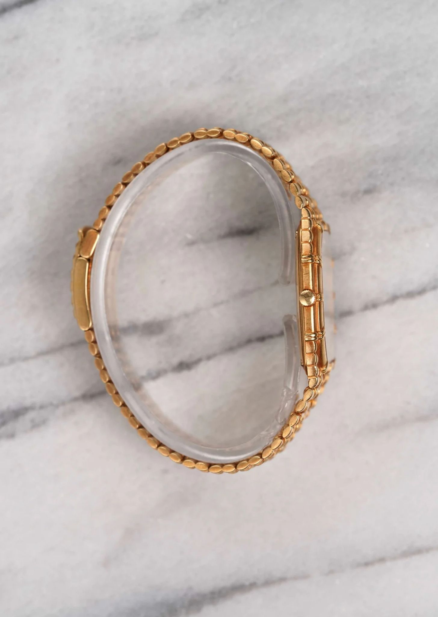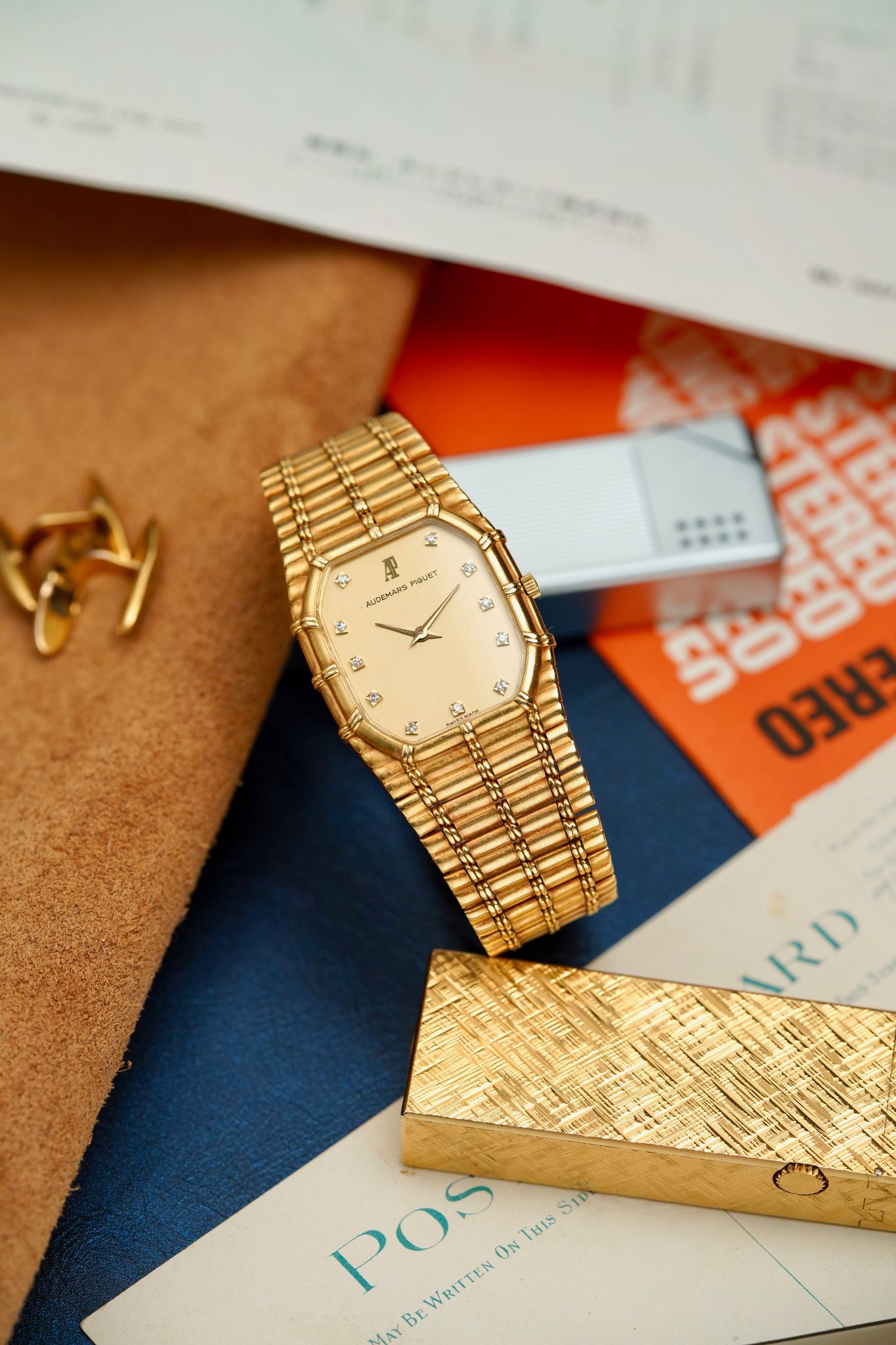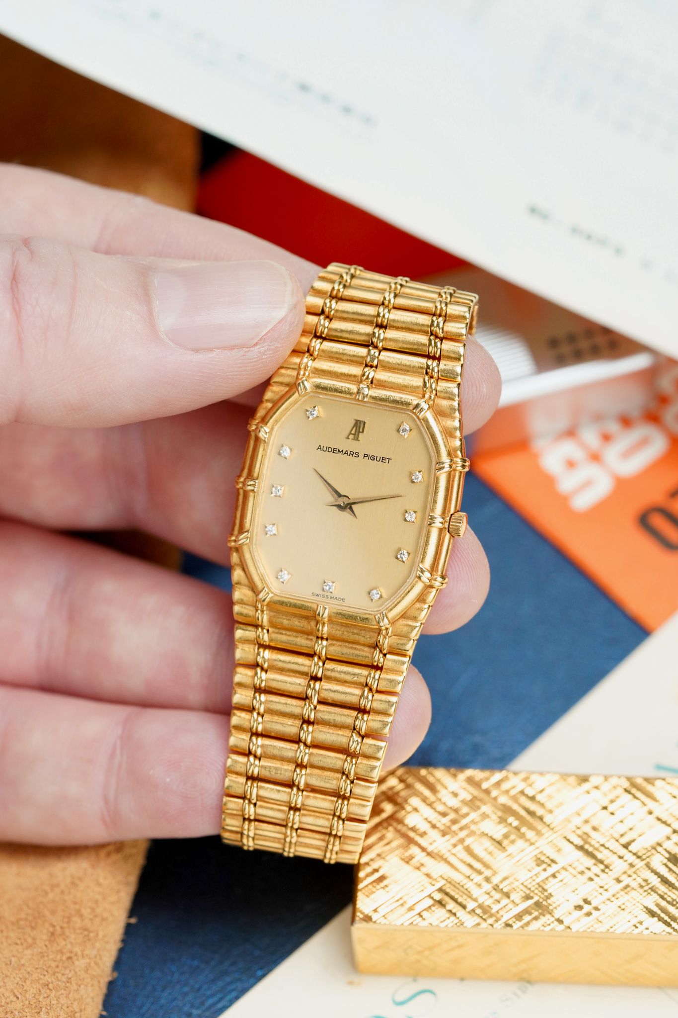 Here's a vintage Audemars Piguet “Bamboo” in 18K yellow gold with a matte champagne dial and bezel from the 1980s. Keeps great time and is fully functional. Measurements include a 28mm case size across and an integrated bracelet that fits up to a 6.5 inch wrist. It's an odd tank shape and design from a brand that is a one trick pony with the royal oak. Interesting texture/ design in the in the tapered integrated “bamboo” style bracelet. Gold Dauphine hands. Matching gold hands and hour markers. Yellow gold case and bracelet. The piece is unisex, it can be worn by both men and women. The piece is great alternative and value from other pieces offered by AP. All parts are original including the dial, case, and movement. the dial and case are in great cosmetic, untouched condition.