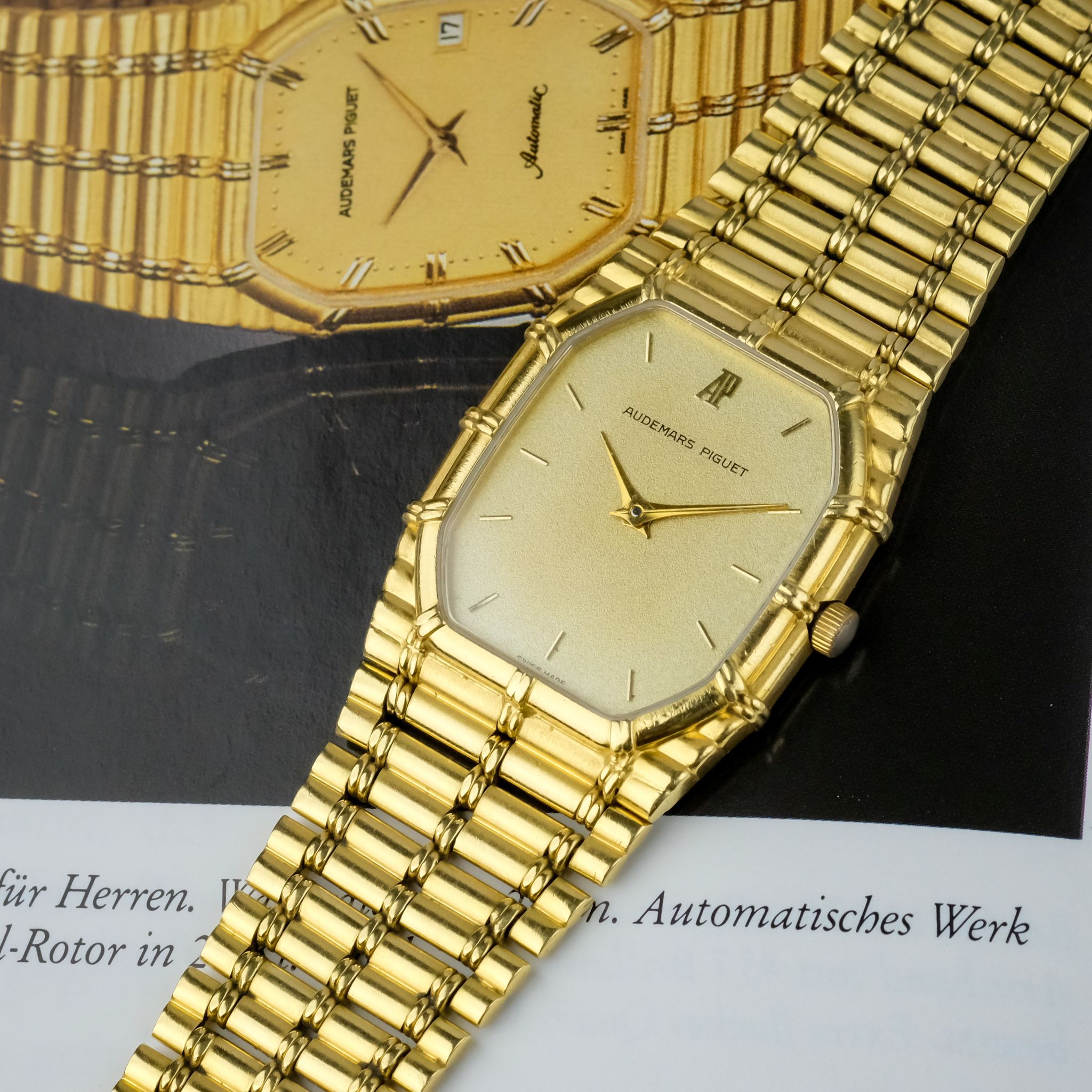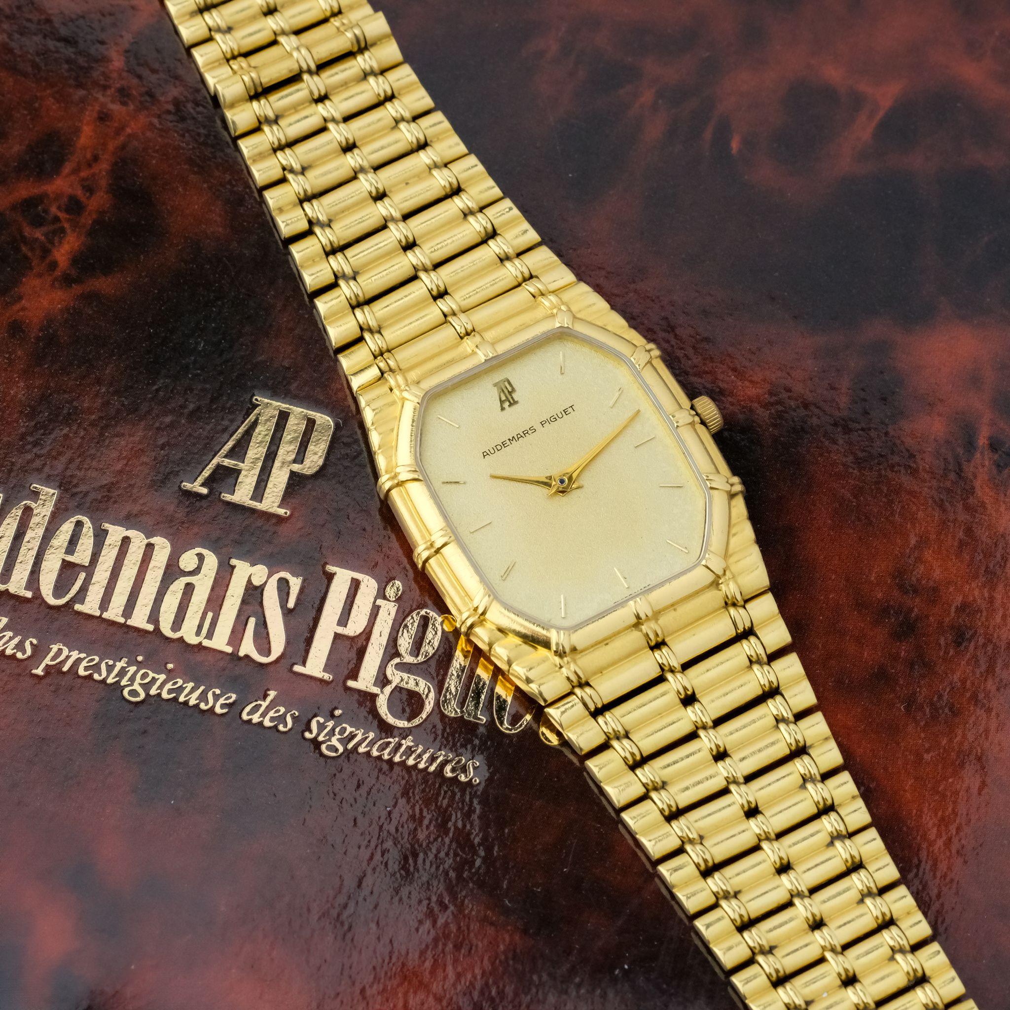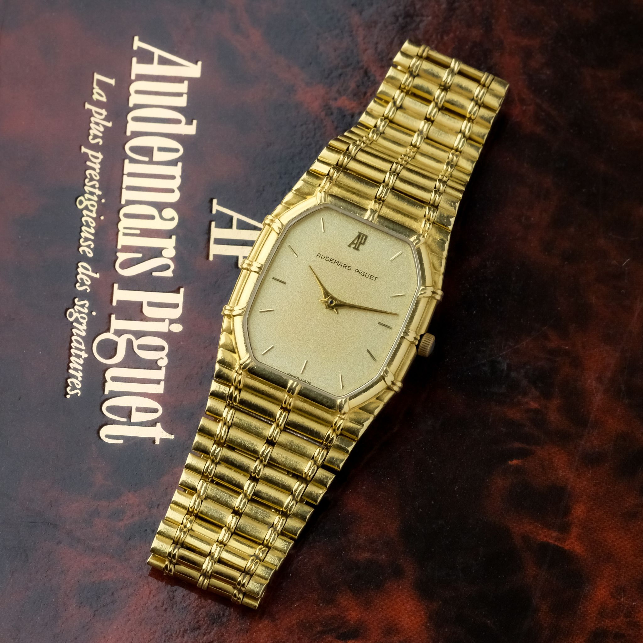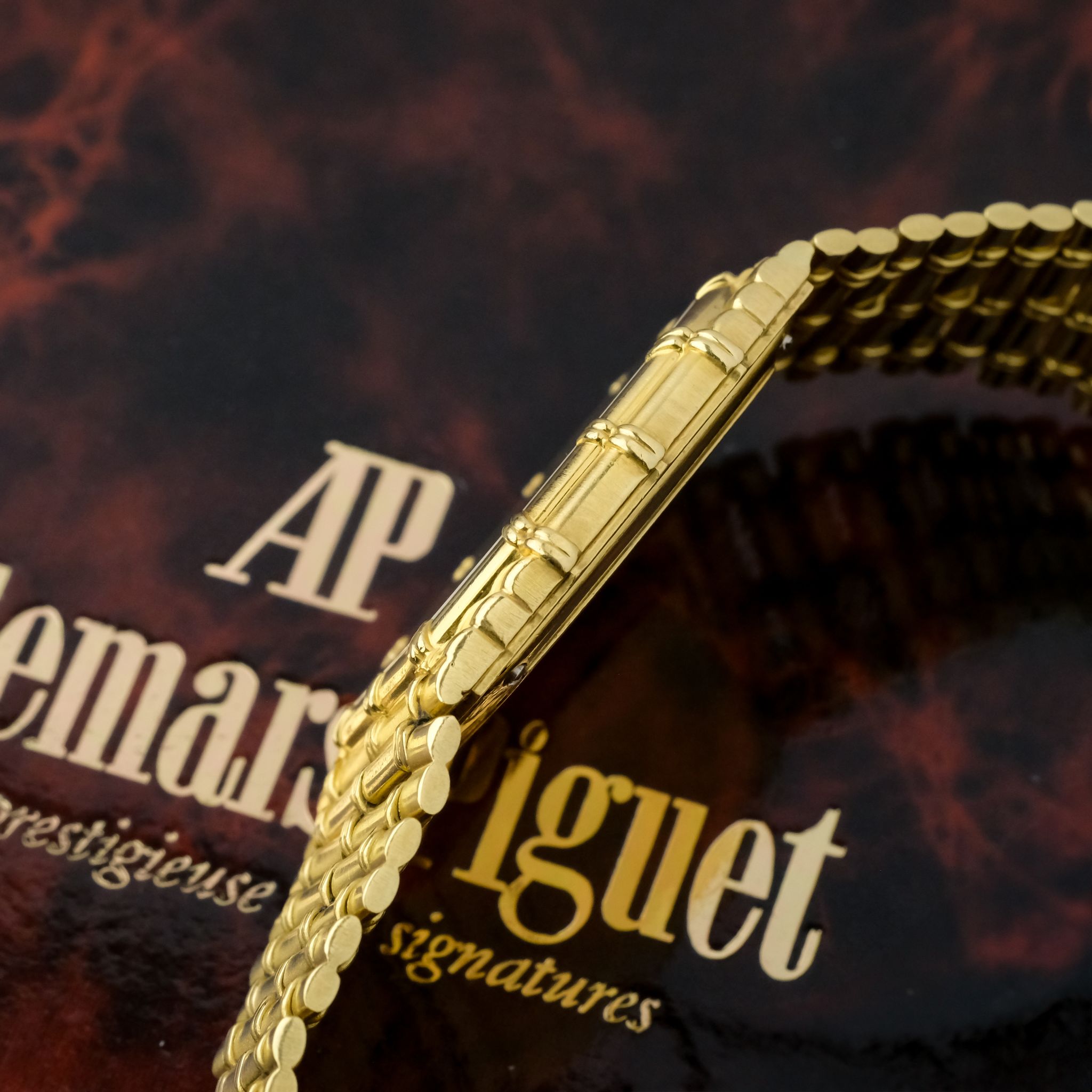 beautiful and increasingly desirable Audemars Piguet “Bamboo” with beautiful finish to the case and bracelet and a very nicely textured gold dial.. The case as well as bracelet appear to be unpolished and are very crisp, the original finishing is clearly visible and the bracelet only has very light stretch to it, it fits a wrist of approximately 18cm! the dial is in very good condition as well with light patina to it.