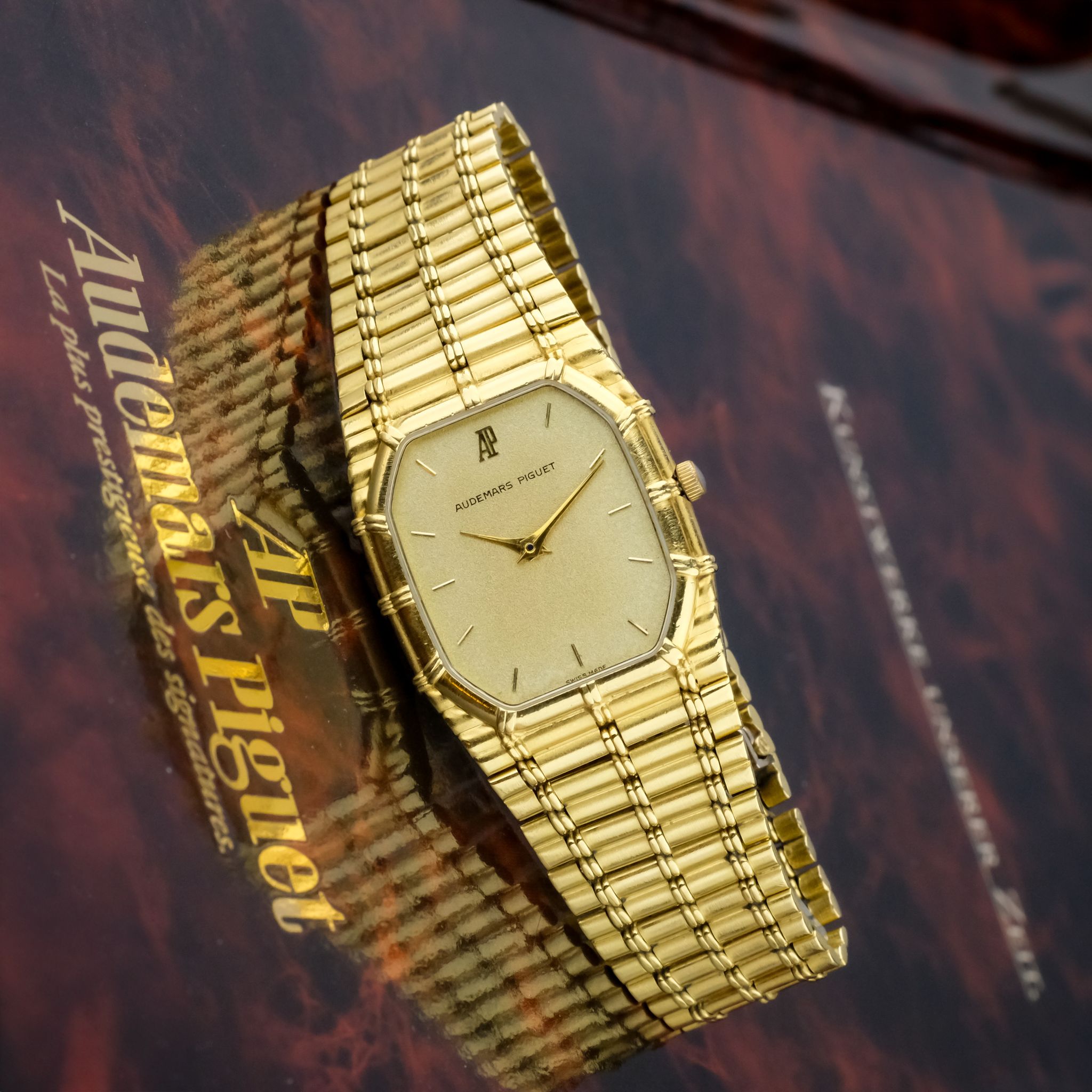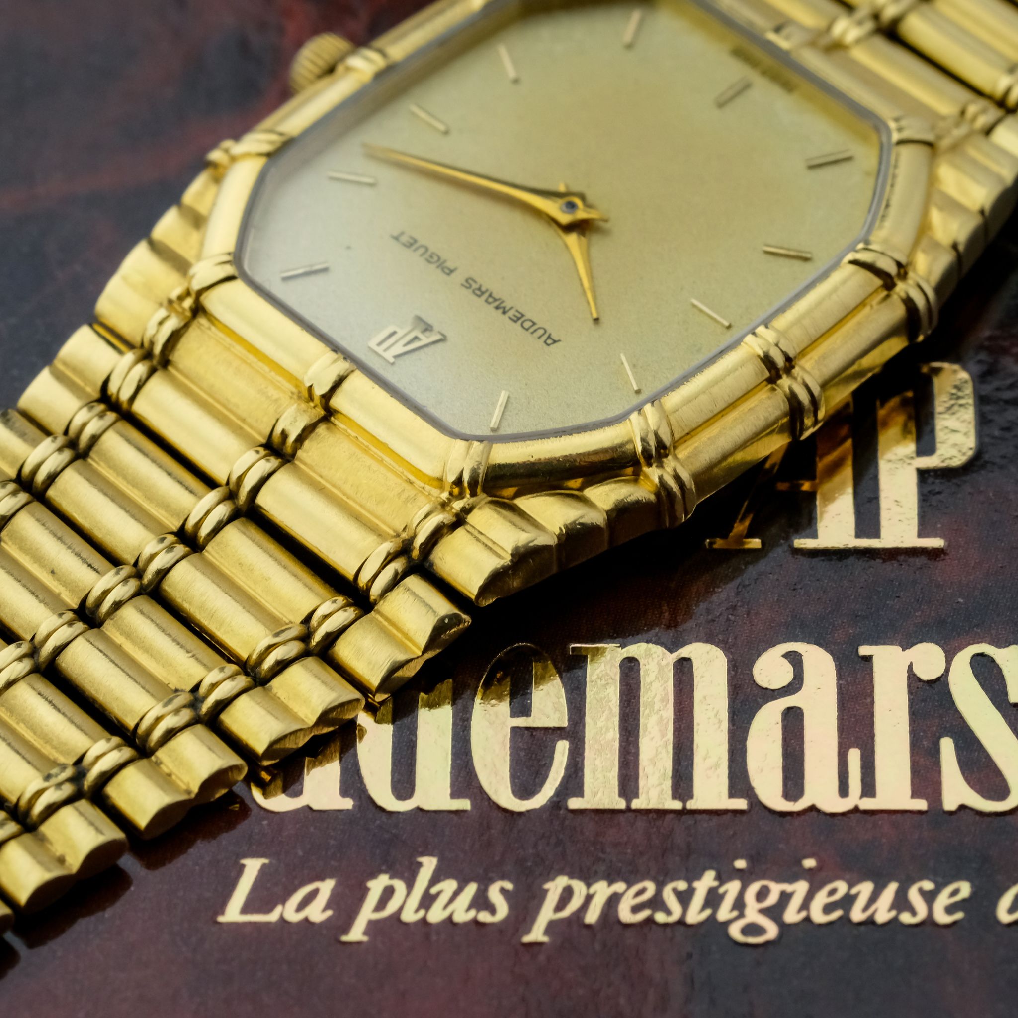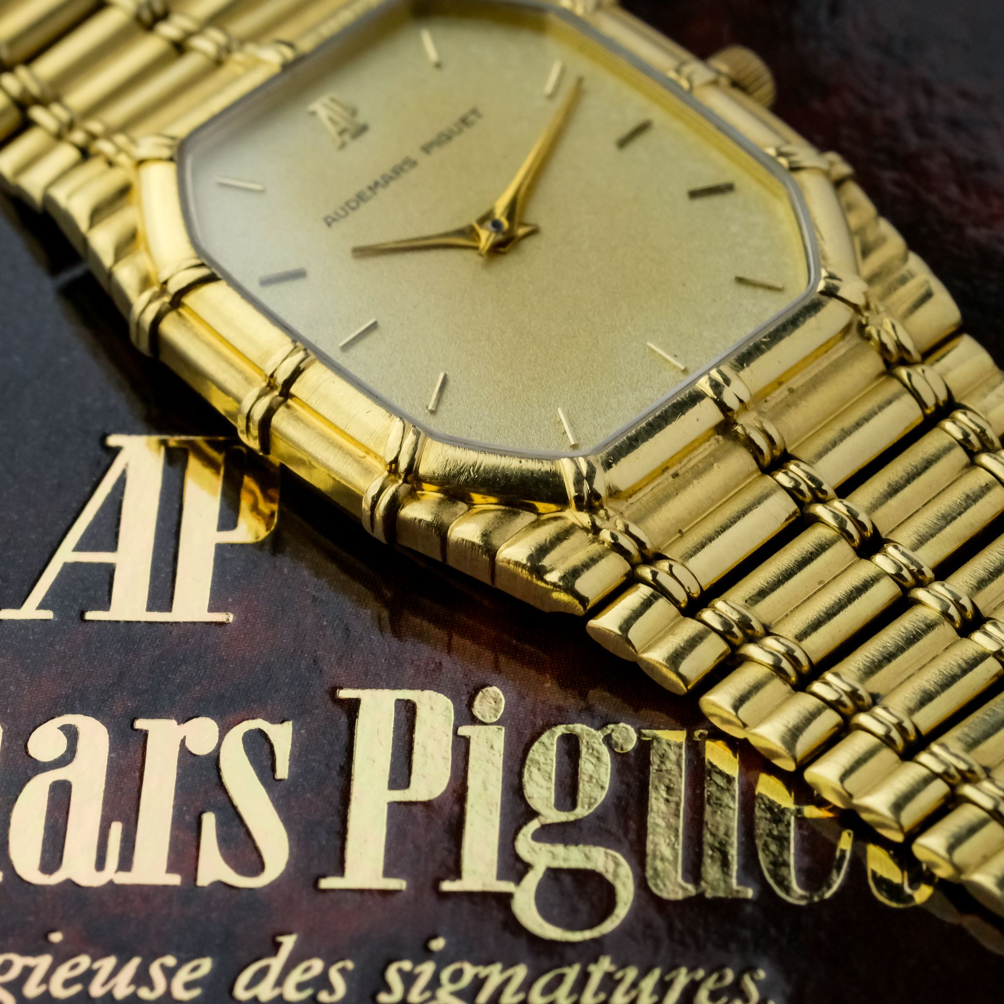 beautiful and increasingly desirable Audemars Piguet “Bamboo” with beautiful finish to the case and bracelet and a very nicely textured gold dial.. The case as well as bracelet appear to be unpolished and are very crisp, the original finishing is clearly visible and the bracelet only has very light stretch to it, it fits a wrist of approximately 18cm! the dial is in very good condition as well with light patina to it.