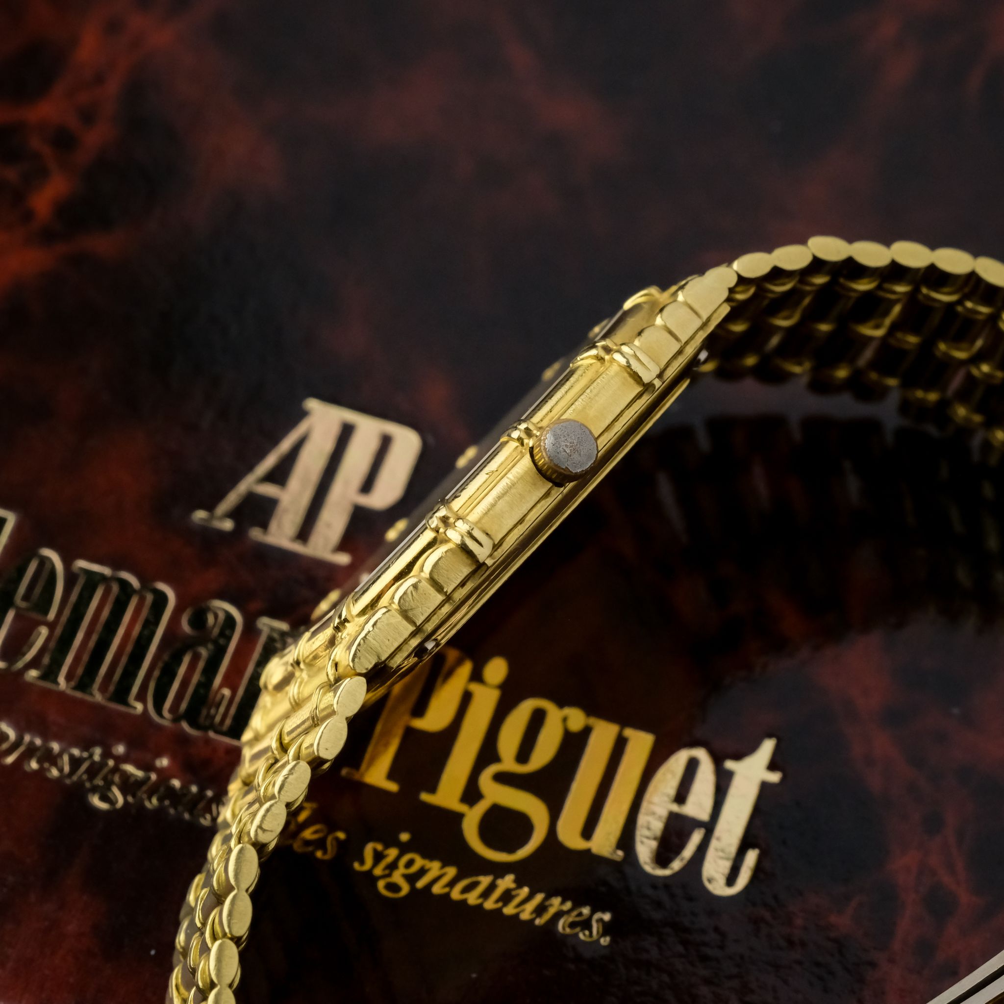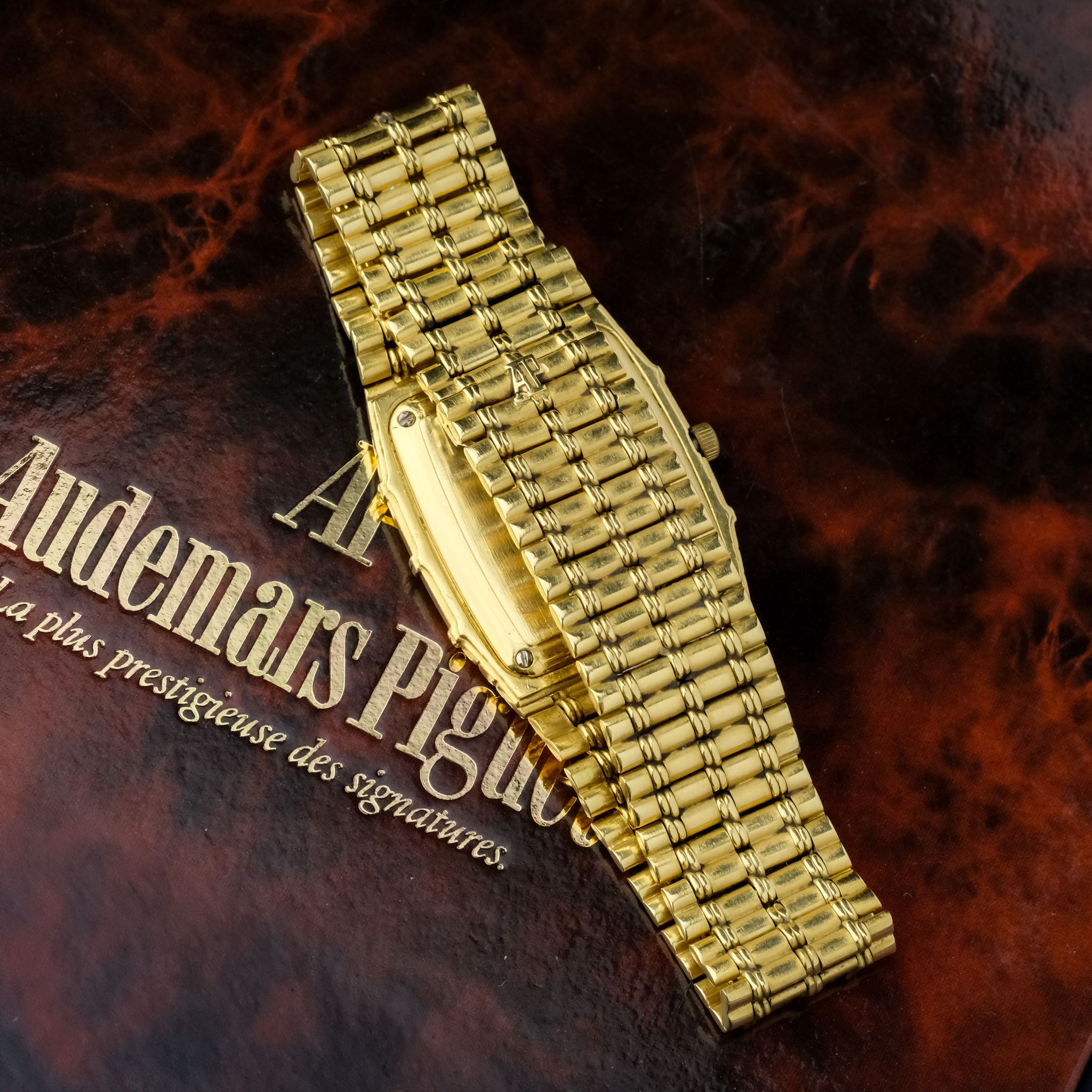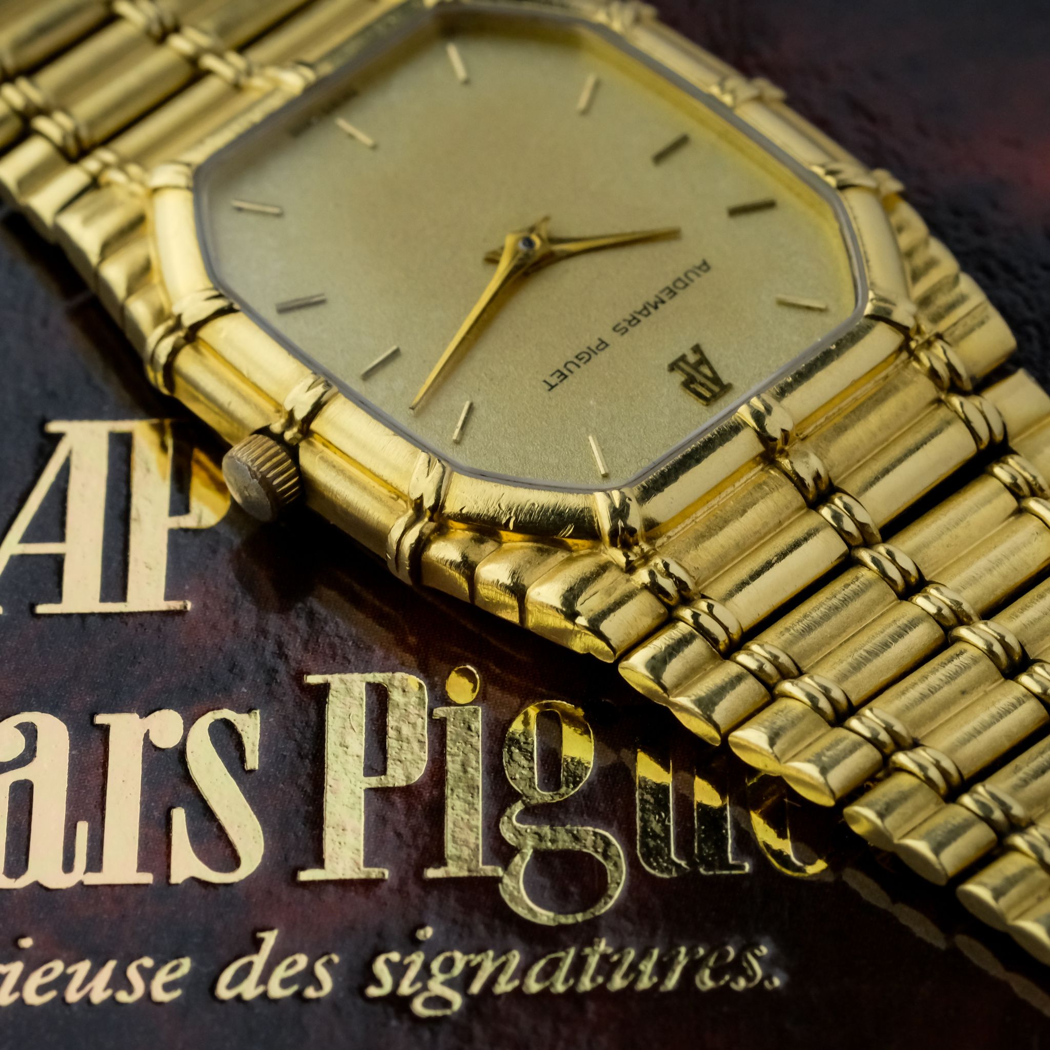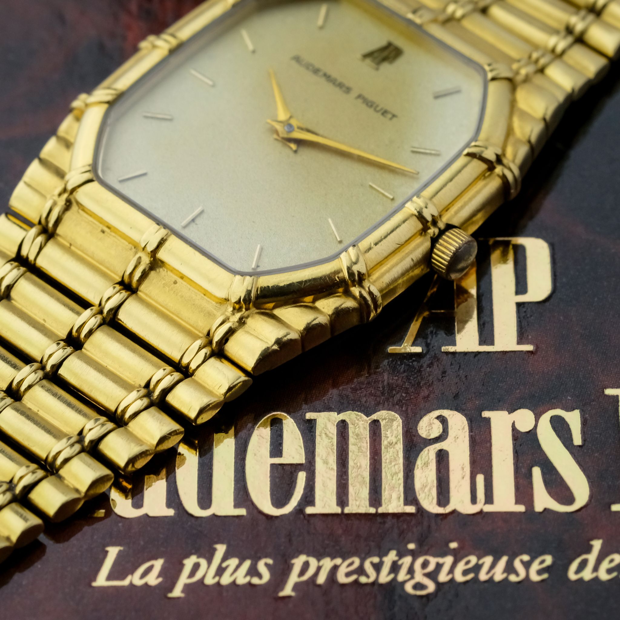 beautiful and increasingly desirable Audemars Piguet “Bamboo” with beautiful finish to the case and bracelet and a very nicely textured gold dial.. The case as well as bracelet appear to be unpolished and are very crisp, the original finishing is clearly visible and the bracelet only has very light stretch to it, it fits a wrist of approximately 18cm! the dial is in very good condition as well with light patina to it.