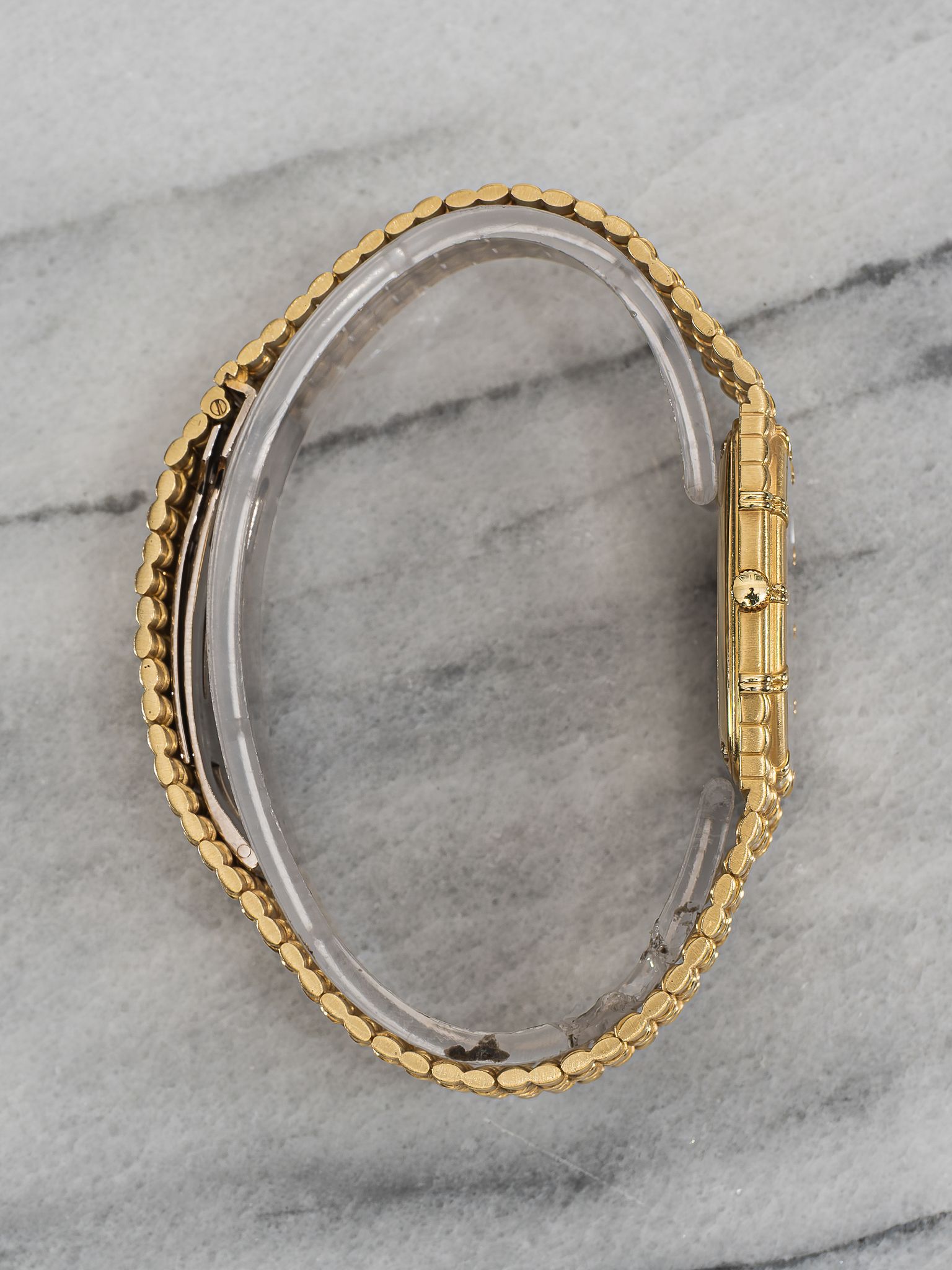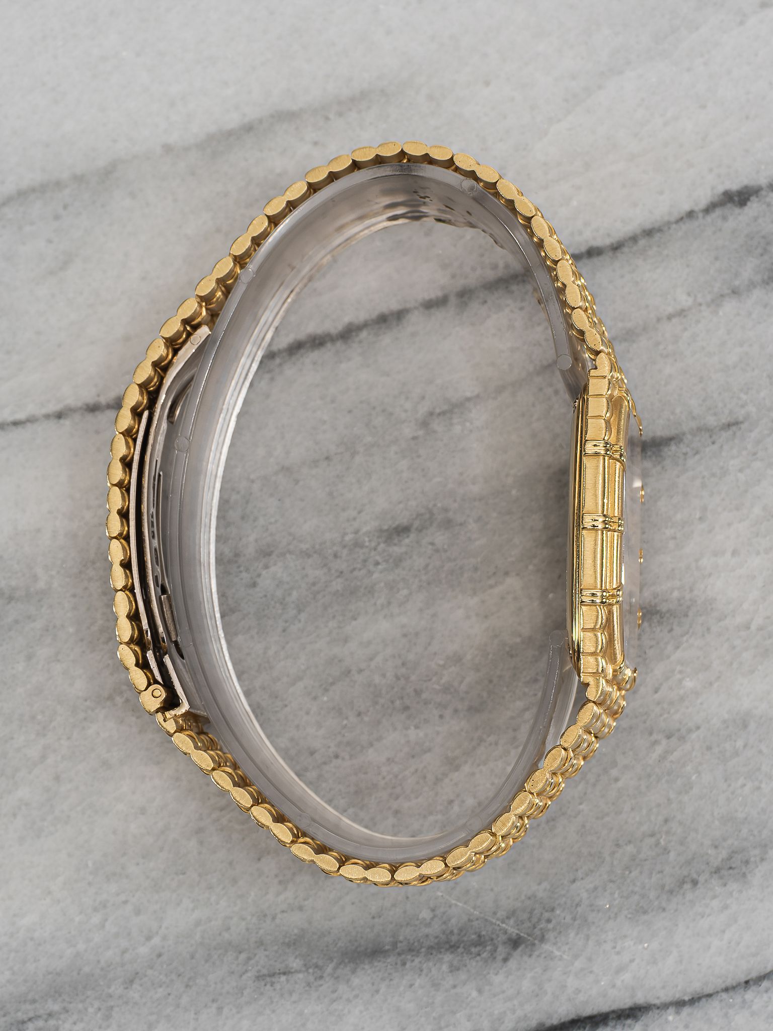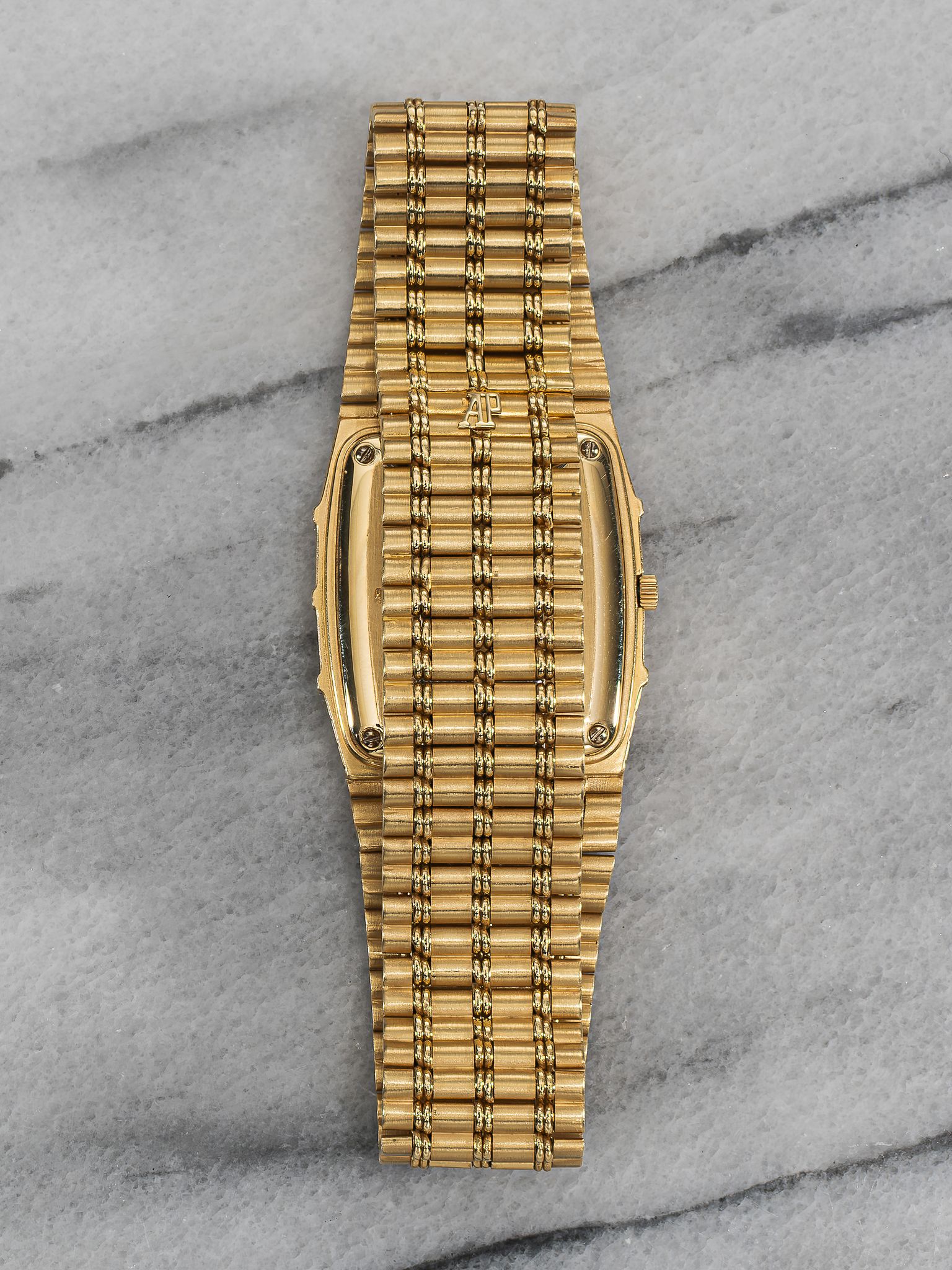 Here's a vintage Audemars Piguet Bamboo in quartz from the 1980s with a champagne diamond dial in 18K yellow gold from the 1980s. Measurements include a 28mm case size across and the bracelet its up to a 7 inch wrist (has a white gold deployant which is quite rare) All parts including the crown, dial, movement, and caseback are original.