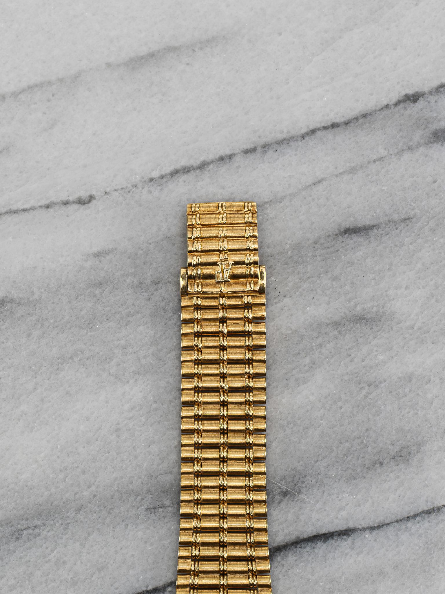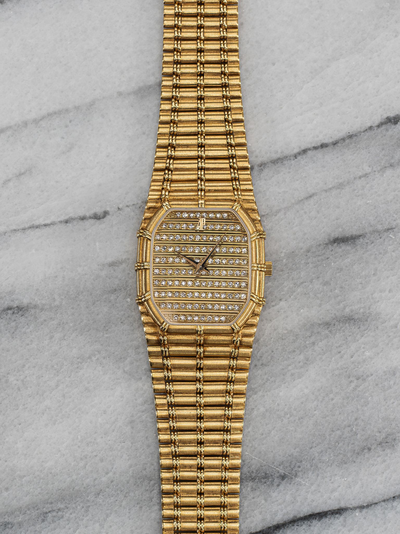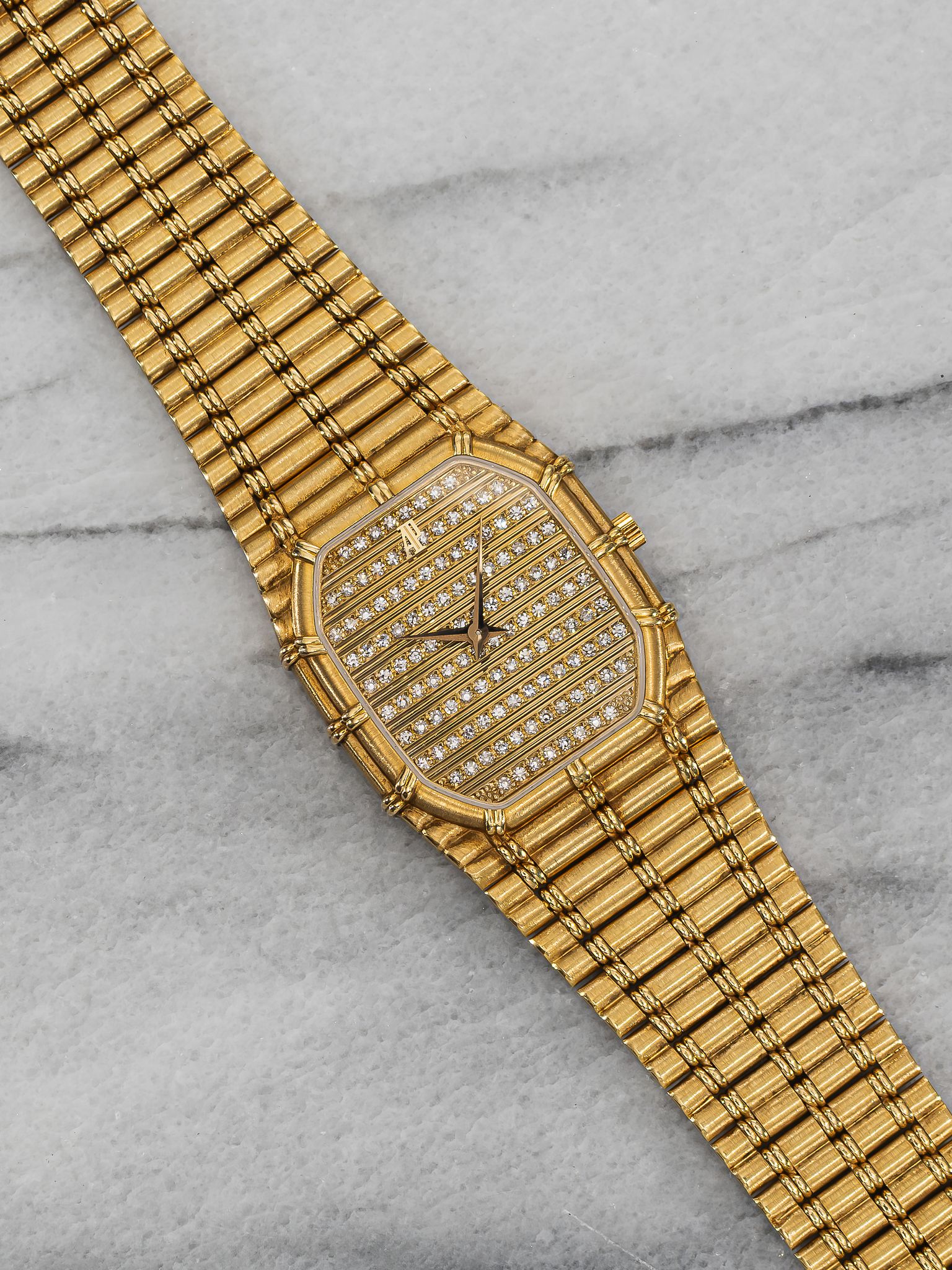 Here's a vintage Audemars Piguet Bamboo in quartz from the 1980s with a champagne diamond pave dial in 18K yellow gold from the 1980s. Measurements include a 28mm case size across and the integrated bracelet its up to a 7.25 nch wrist All parts including the crown, dial, movement, and caseback are original.