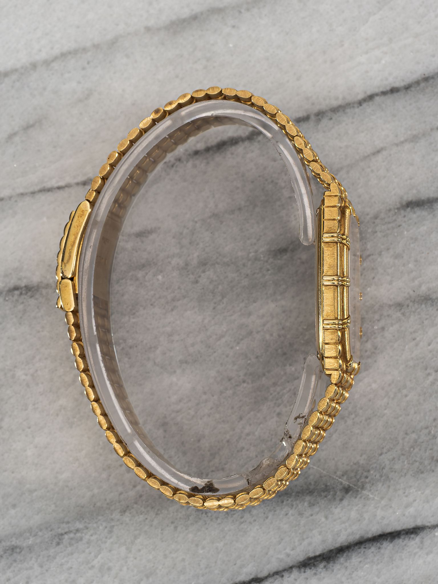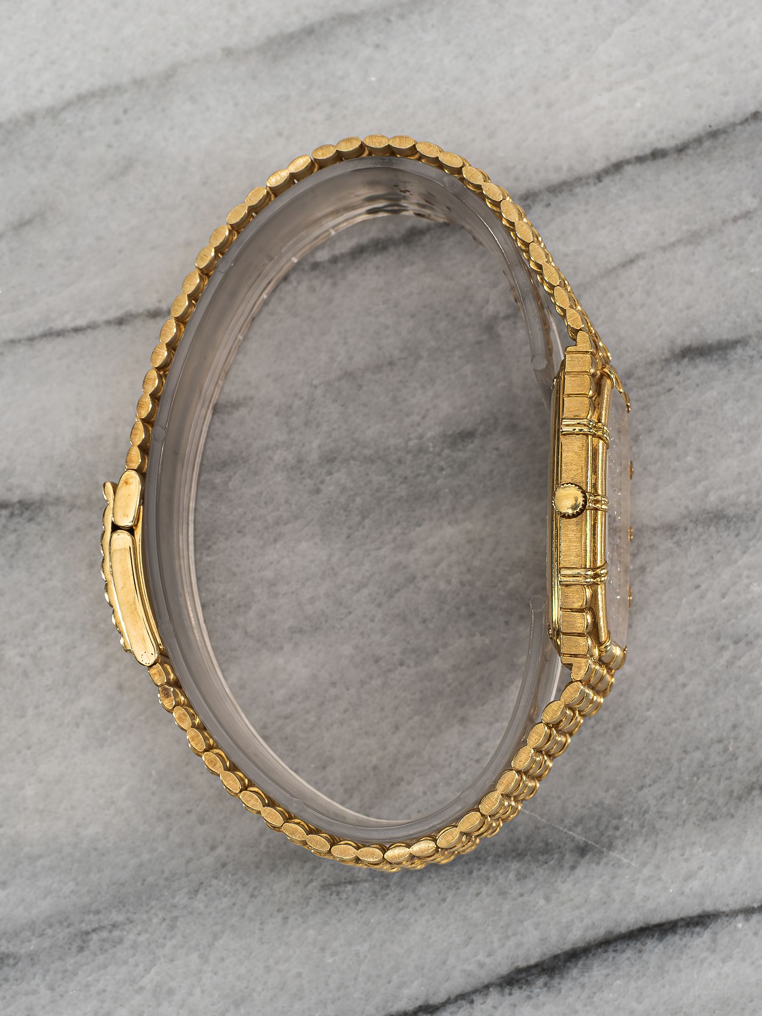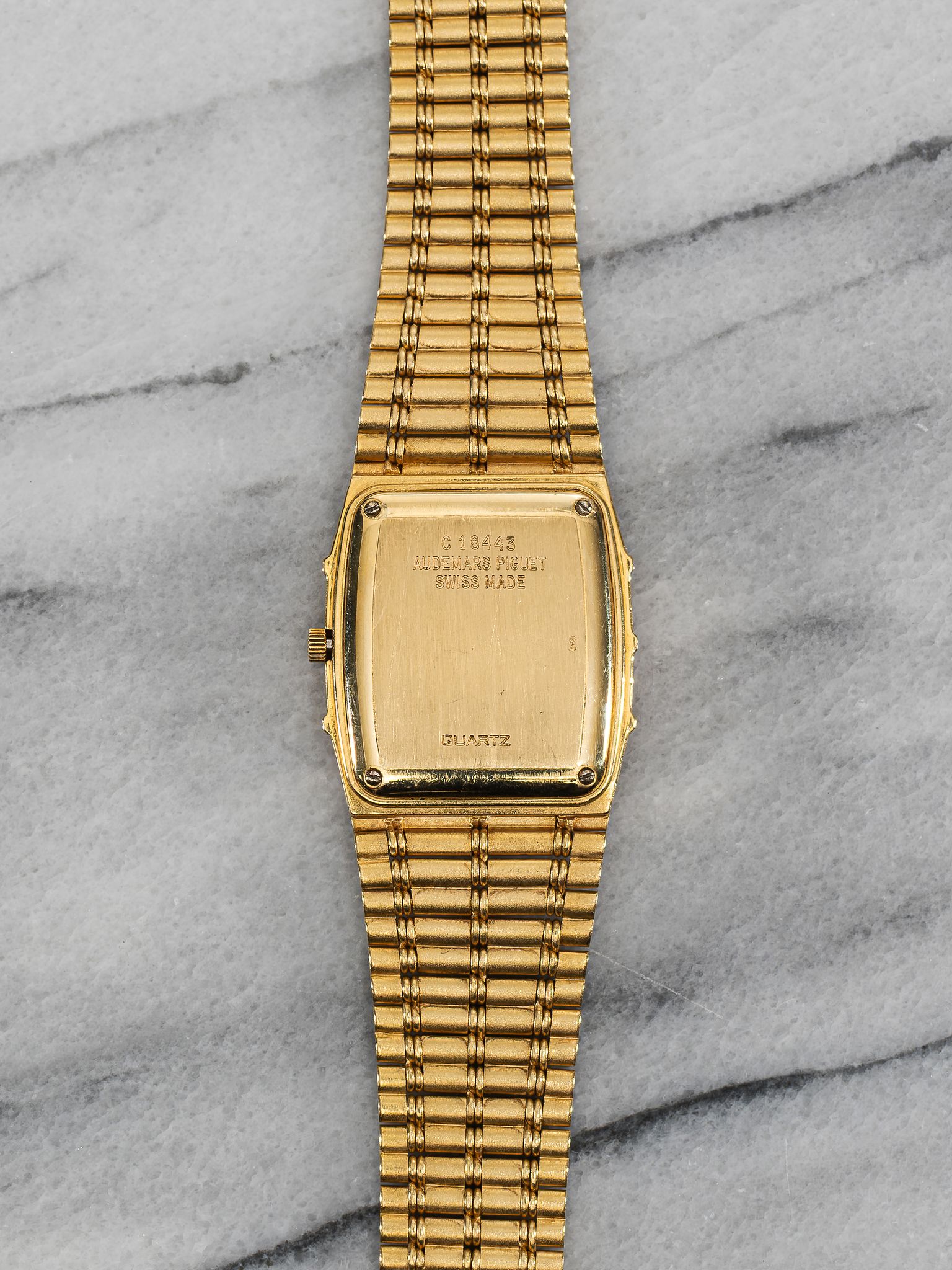 Here's a vintage Audemars Piguet Bamboo in quartz from the 1980s with a champagne diamond pave dial in 18K yellow gold from the 1980s. Measurements include a 28mm case size across and the integrated bracelet its up to a 7.25 nch wrist All parts including the crown, dial, movement, and caseback are original.