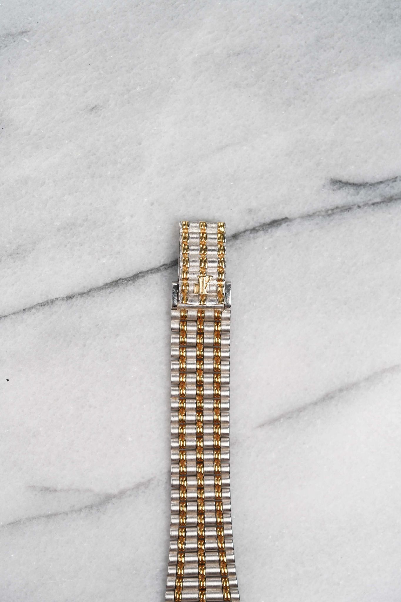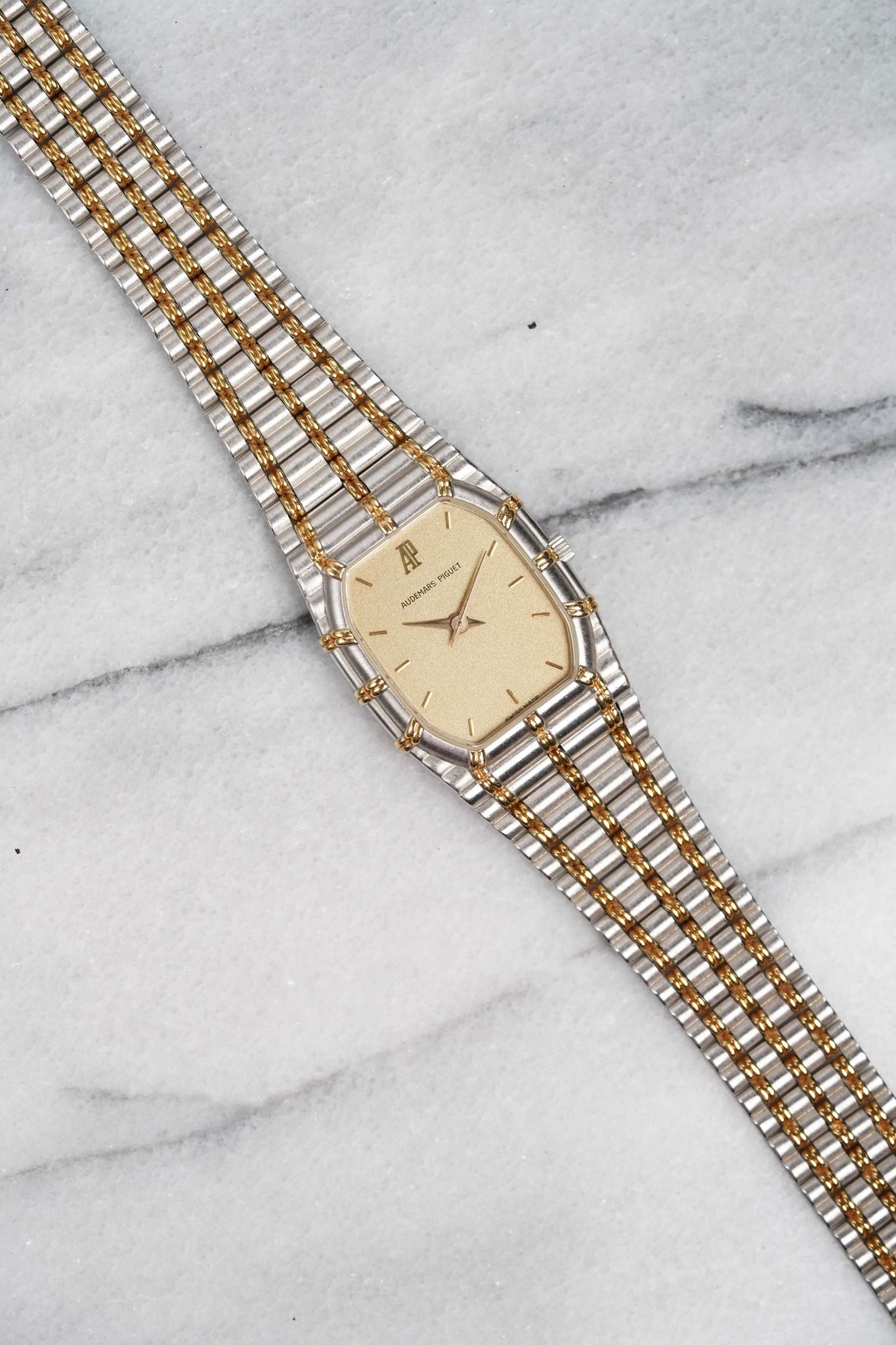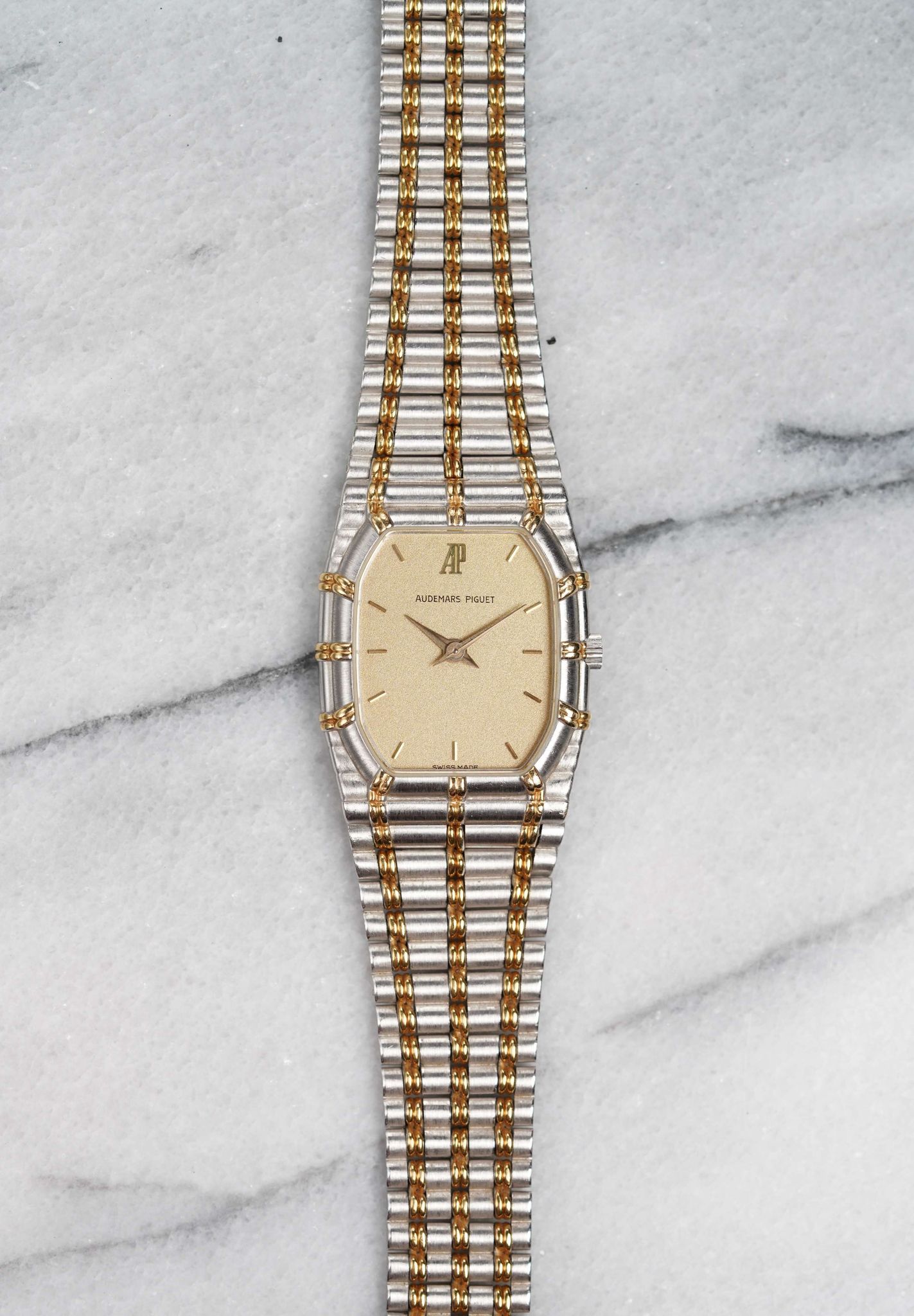 Here's a vintage Audemars Piguet ladies “Bamboo” in 18K white gold (two tone yellow gold) with a matte champagne dial and bezel from the 1980s. Keeps great time and is fully functional. Measurements include a 24mm case size across and an integrated bracelet that fits up to a 6 inch wrist. It's an odd tank shape and design from a brand that is a one trick pony with the royal oak. Interesting texture/ design in the in the tapered integrated “bamboo” style bracelet. Gold Dauphine hands. Matching gold hands and hour markers. White gold case and bracelet. The piece is great alternative and value from other pieces offered by AP. All parts are original including the dial, case, and movement. the dial and case are in great cosmetic, untouched condition.