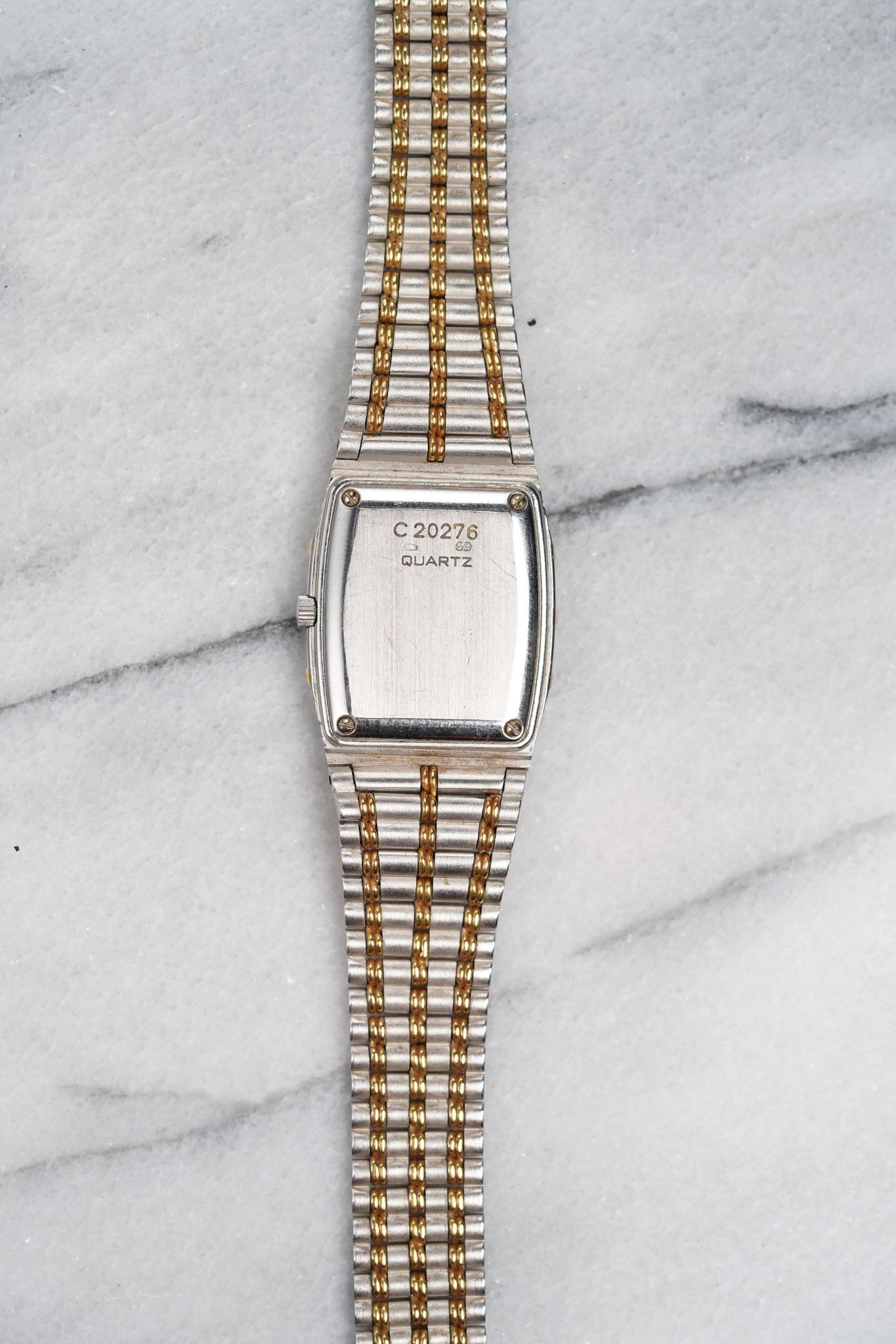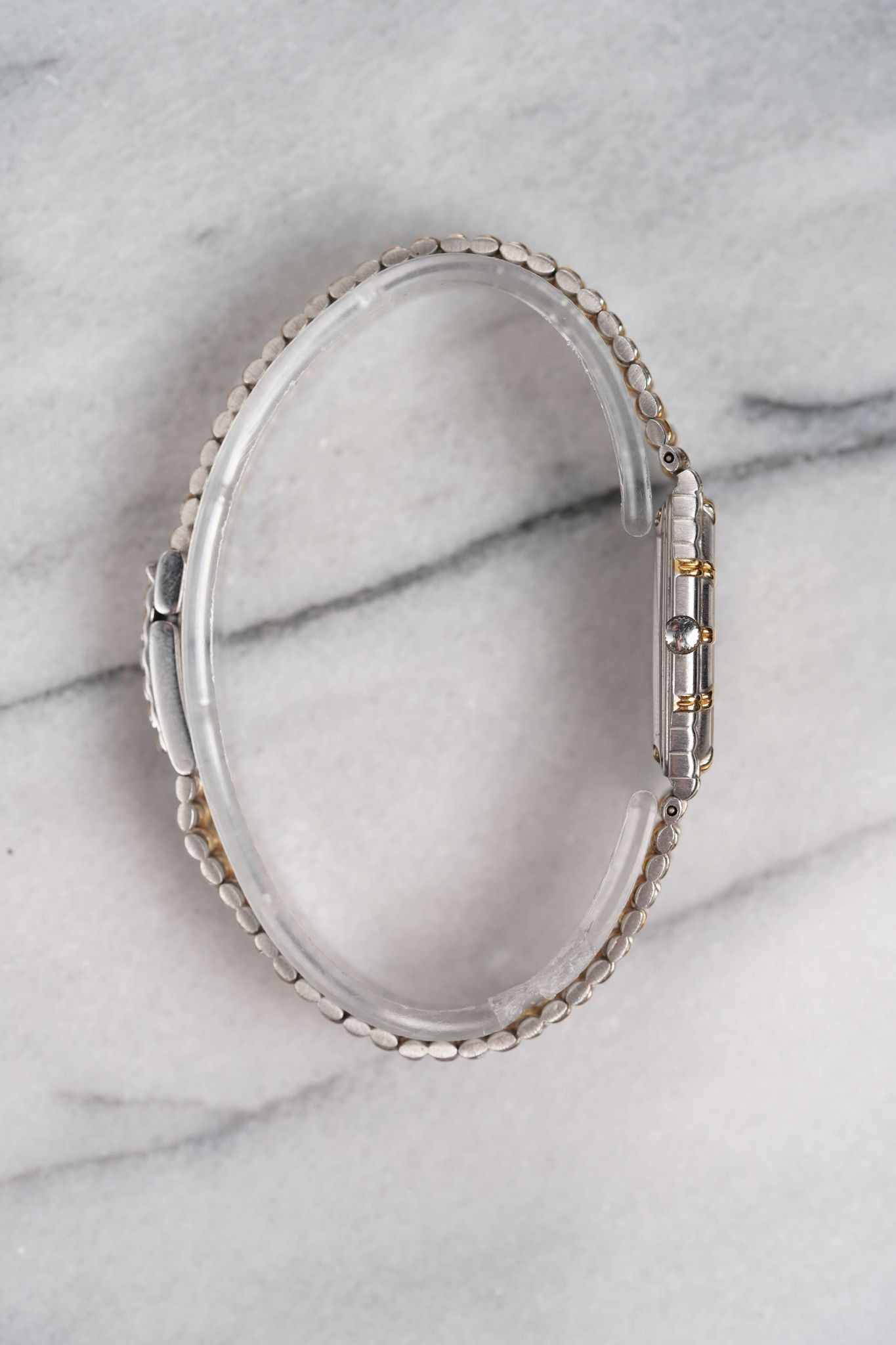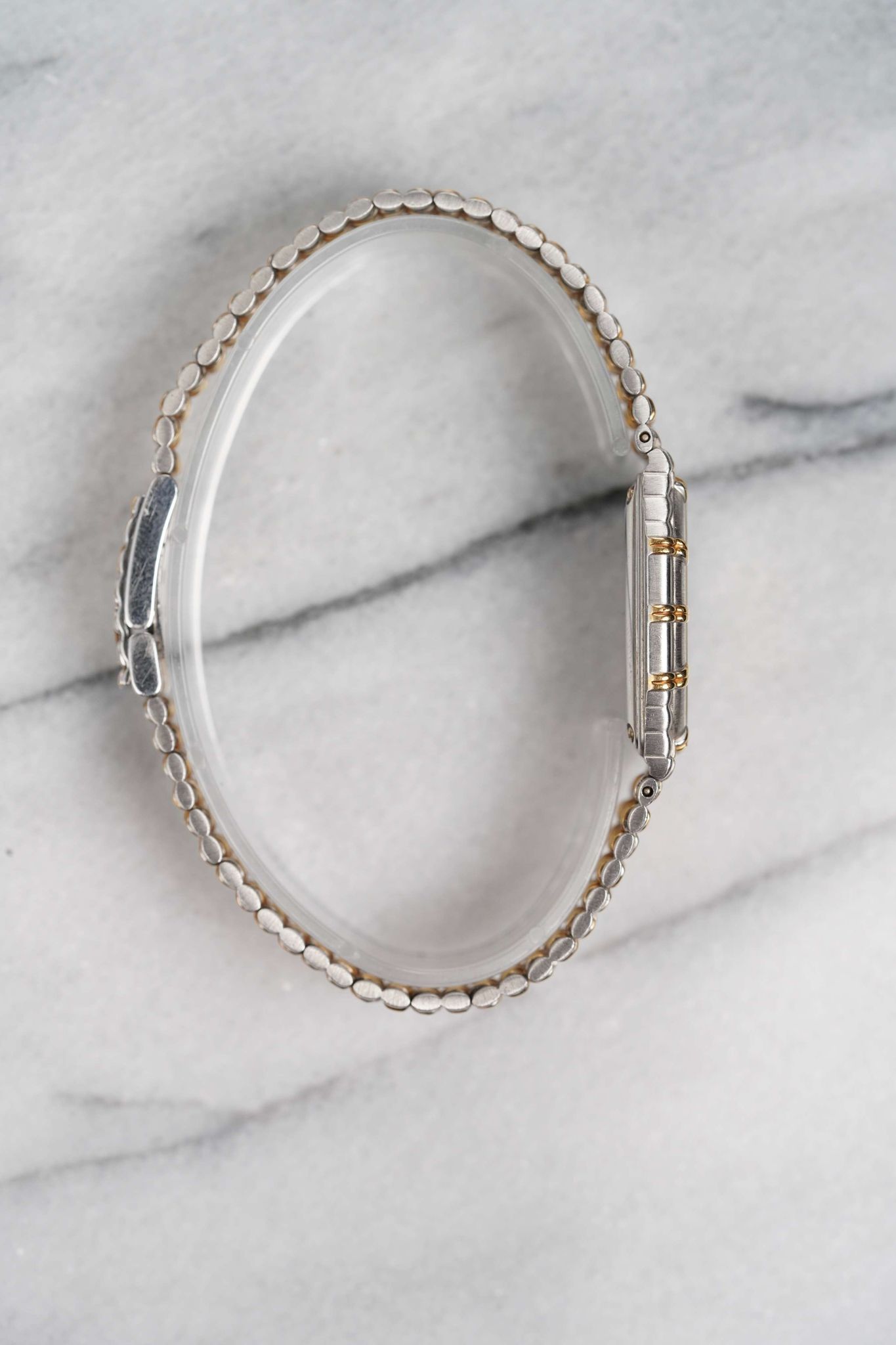Here's a vintage Audemars Piguet ladies “Bamboo” in 18K white gold (two tone yellow gold) with a matte champagne dial and bezel from the 1980s. Keeps great time and is fully functional. Measurements include a 24mm case size across and an integrated bracelet that fits up to a 6 inch wrist. It's an odd tank shape and design from a brand that is a one trick pony with the royal oak. Interesting texture/ design in the in the tapered integrated “bamboo” style bracelet. Gold Dauphine hands. Matching gold hands and hour markers. White gold case and bracelet. The piece is great alternative and value from other pieces offered by AP. All parts are original including the dial, case, and movement. the dial and case are in great cosmetic, untouched condition.