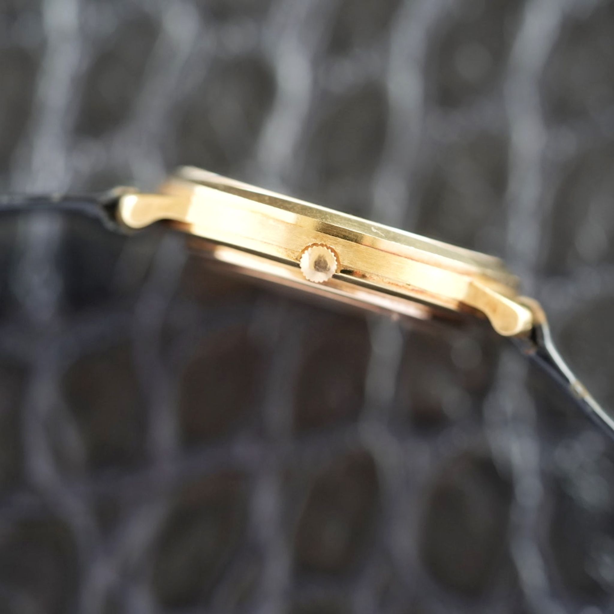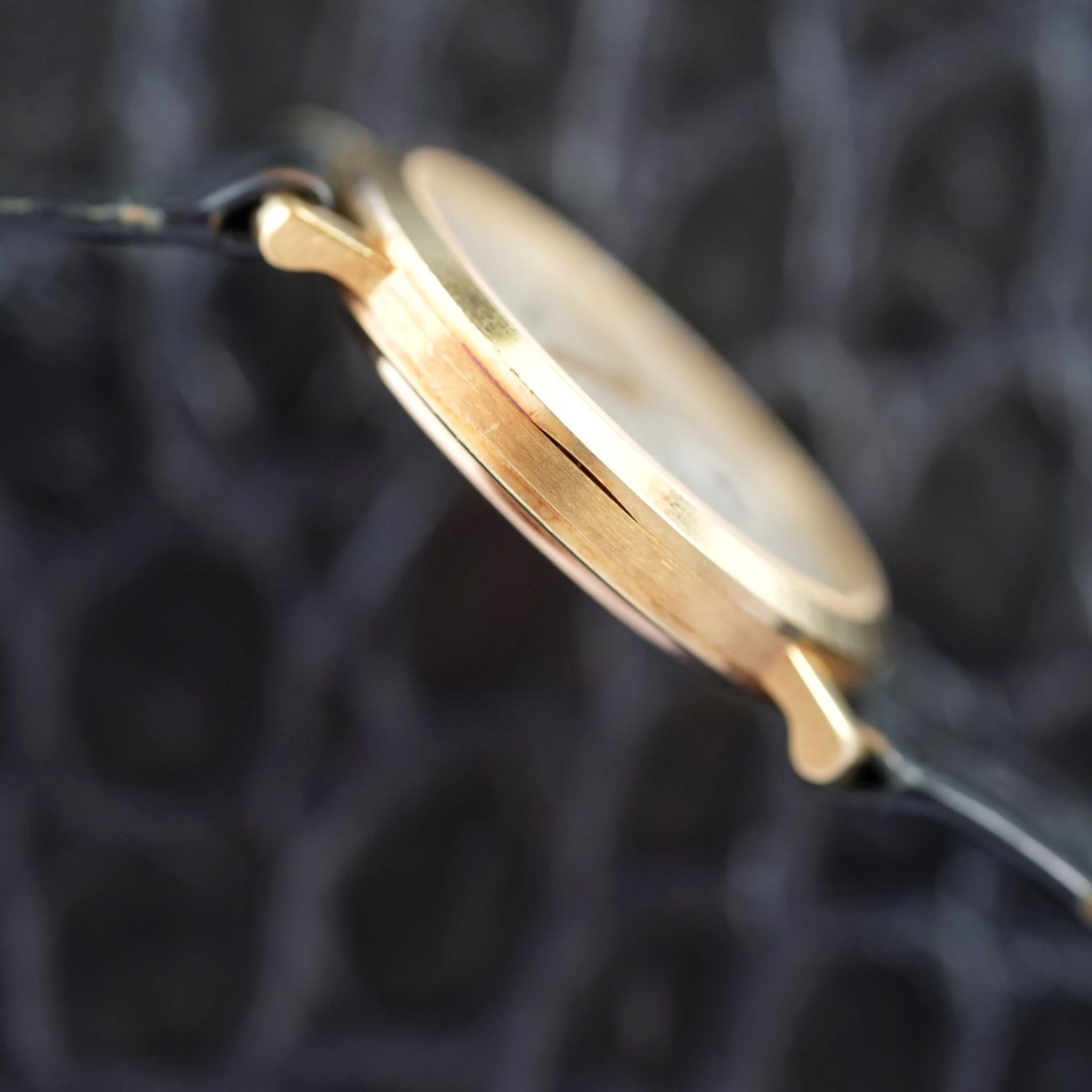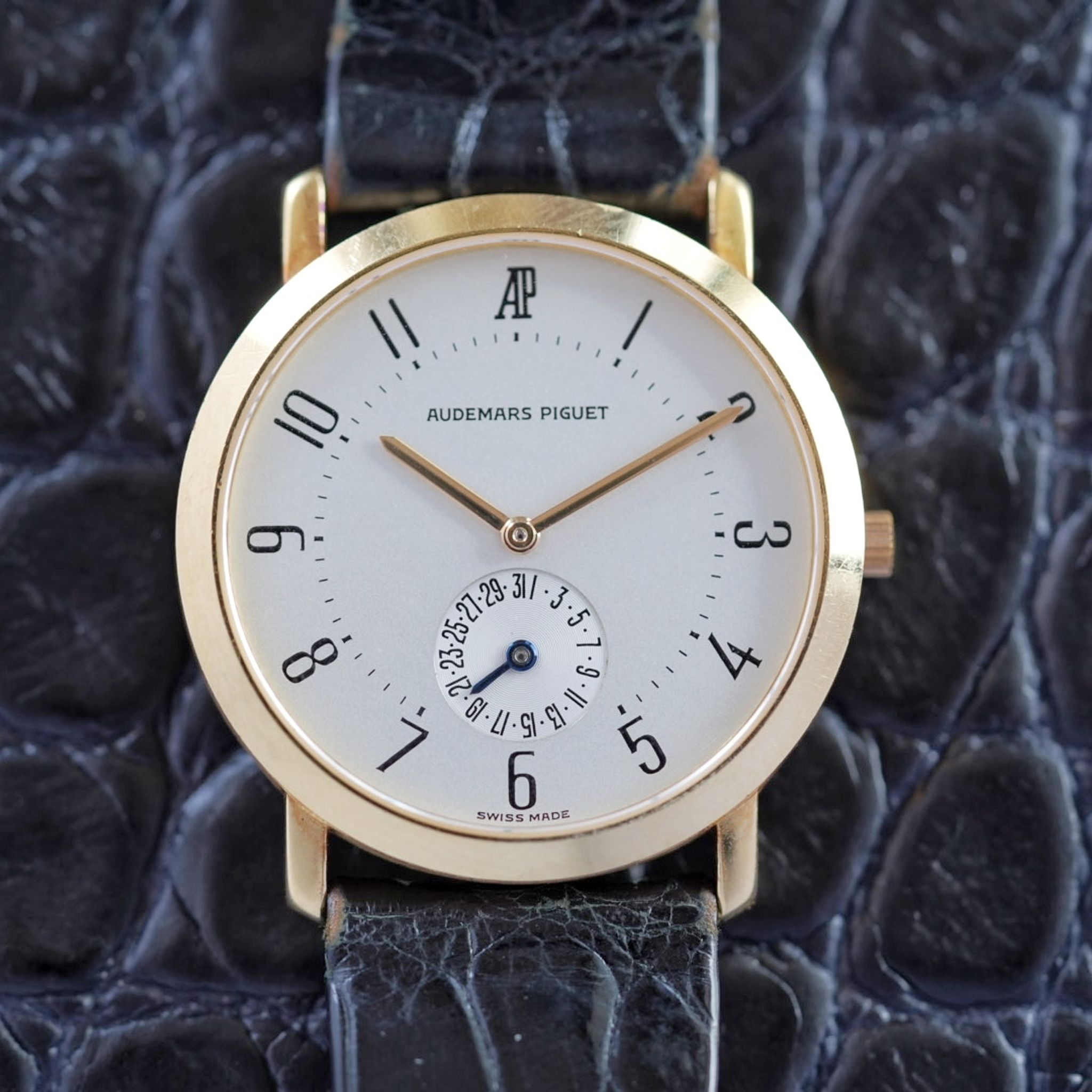 This 18k gold Audemars Piguet Calendar watch features a silvered dial with black Art Deco-styled numerals and gold hands. It’s reminiscent of a vintage Calatrava both in terms of size and elegance. However, instead of a sub secondas subdial at 6 o’clock, it features a beautifully engine-turned sub-dial showing the date in a radial format, mirroring the hour markers. At under 7mm thick and 32mm across, it’s an effortlessly graceful watch with classical proportions.