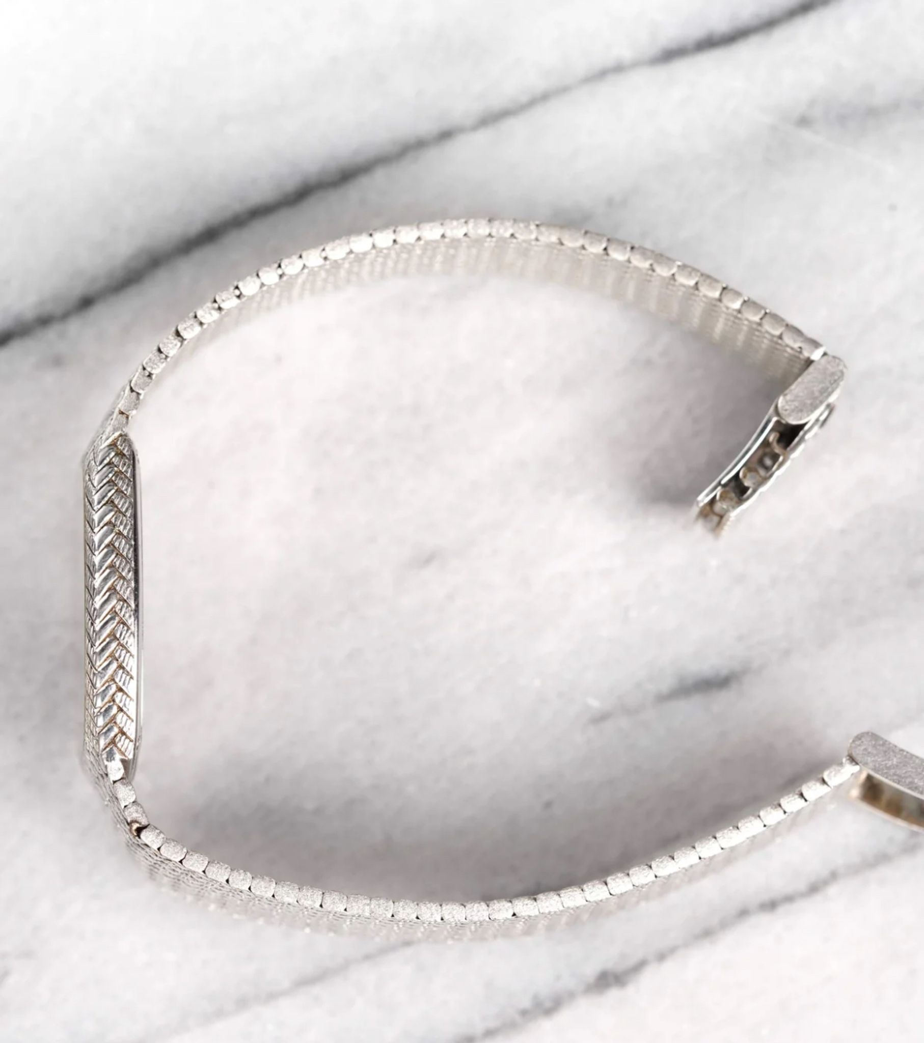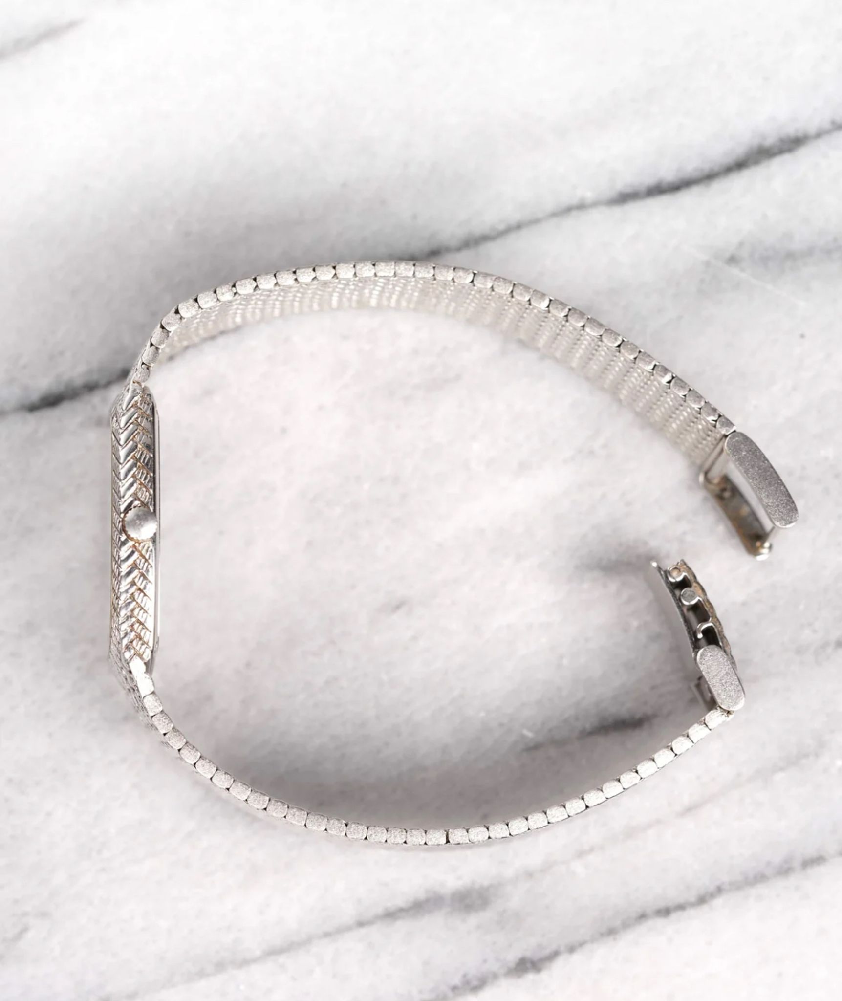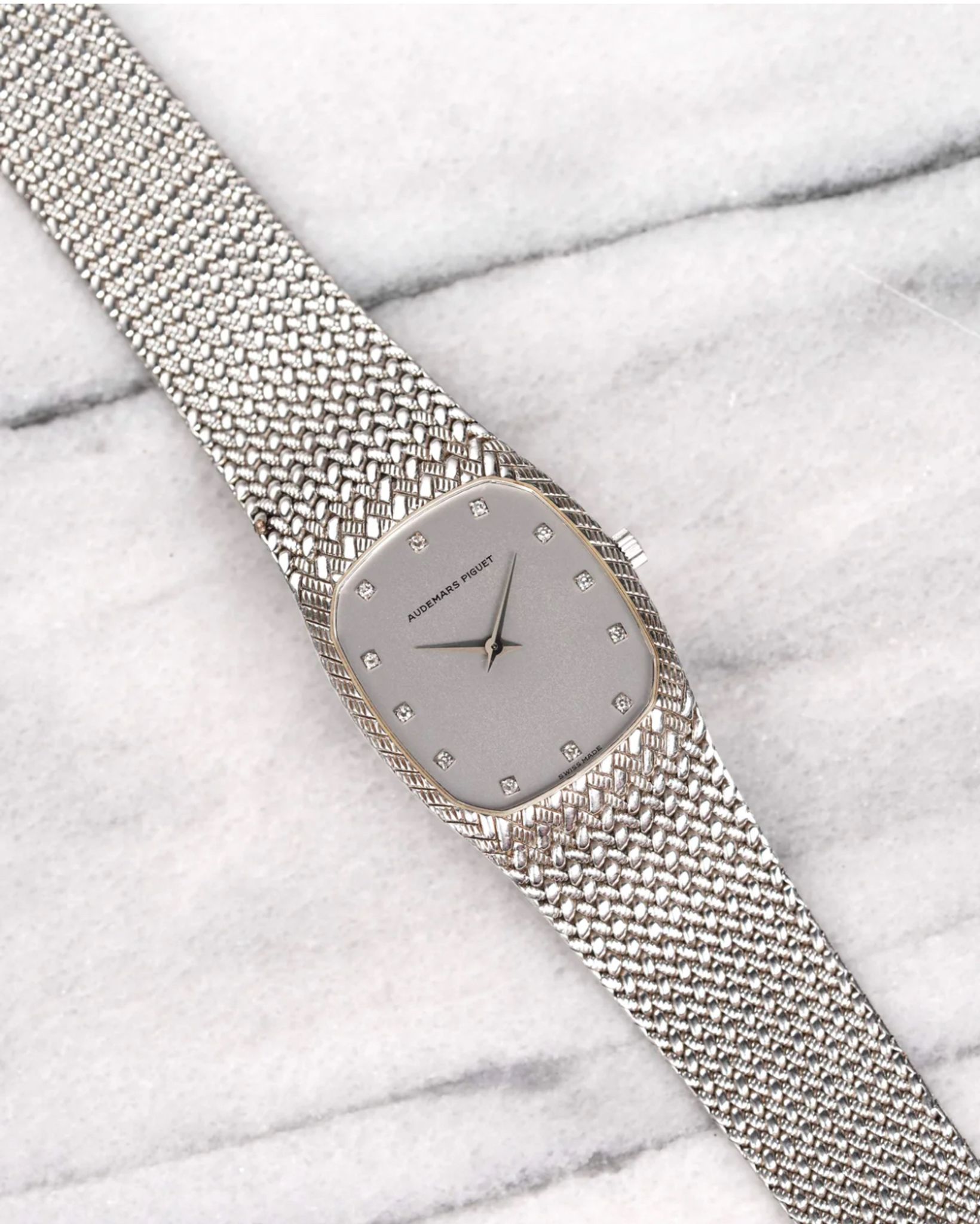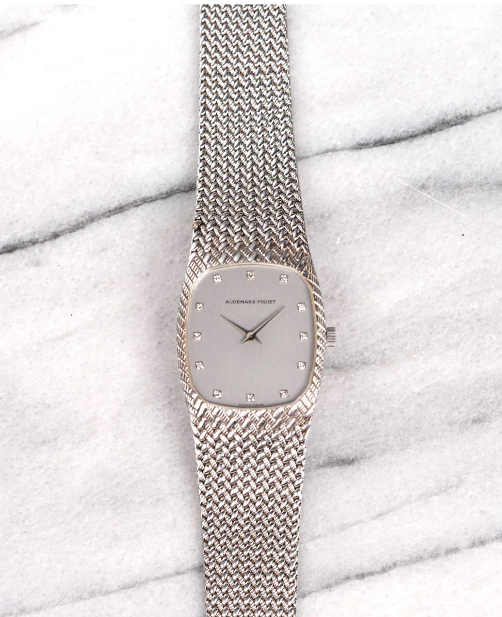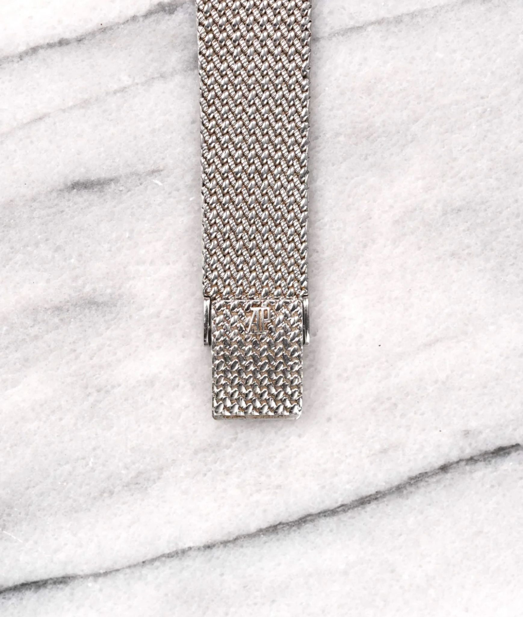 Here we have a vintage Audemars Piguet cobra manual wind in 18k white gold with a silver diamond dial with sword hands dated from the 1970s. Keeps great time and is fully functional. Measurements of the case is 28x28mm including the crown. It's on its original matching integrated 18k white gold bracelet measuring 7.25 inches. 18K white gold case and cashback. Both the dial and crystal are free from any scratches. The bracelet is woven with matching hand-etched finish and case and bracelet. All parts are original including the dial, crown, movement, and caseback. Both the dial and case are in great cosmetic, untouched condition.