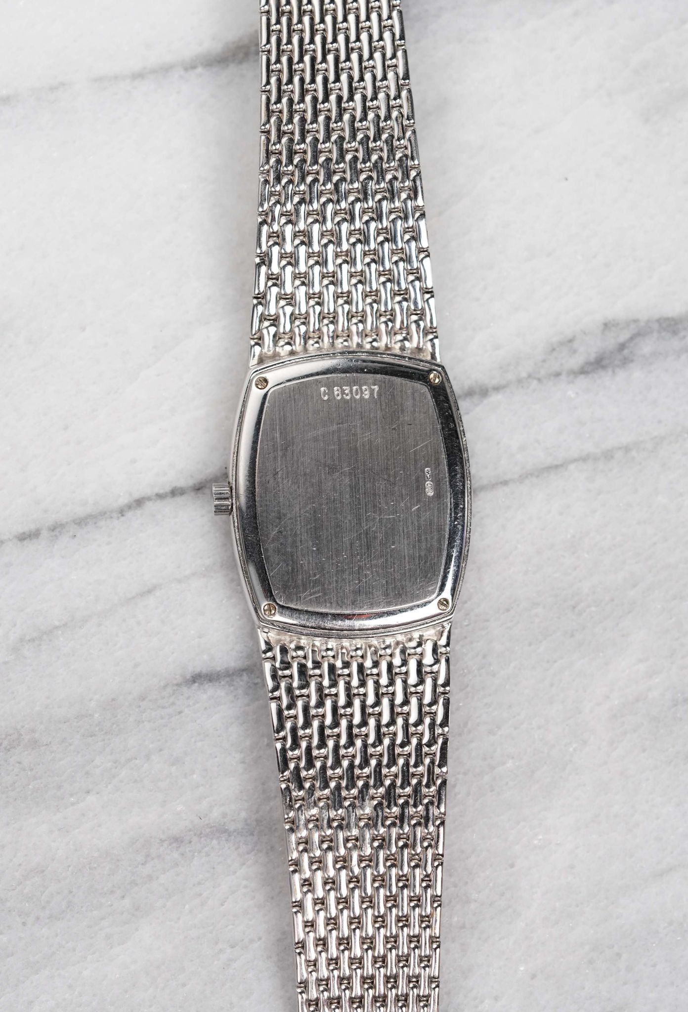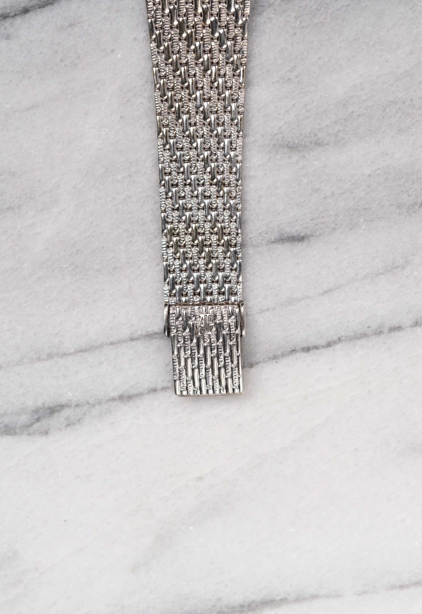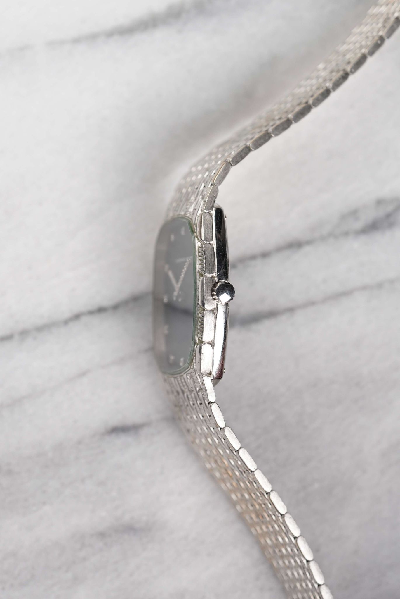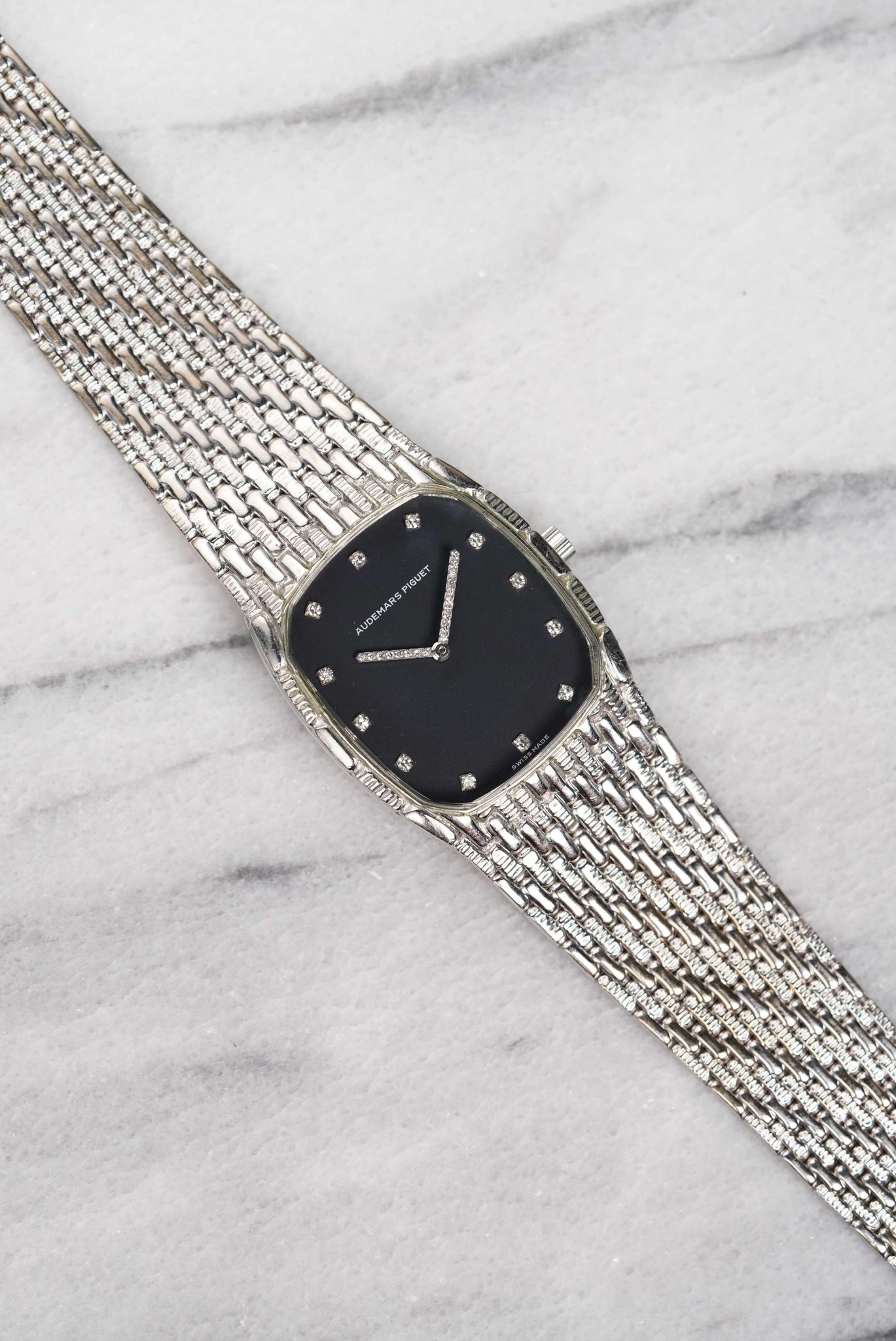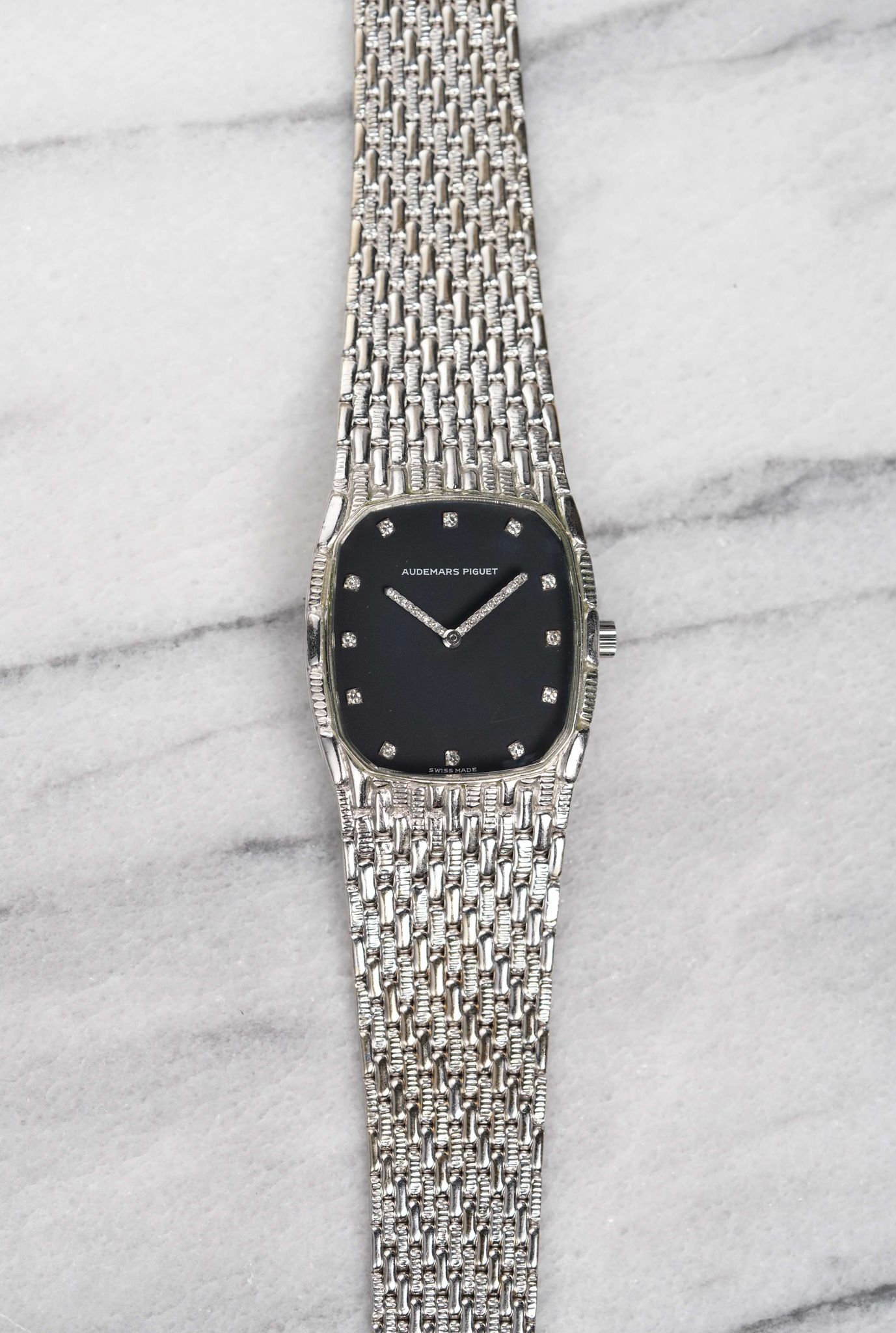 Here's a vintage Audemars Piguet Cobra manual wind in 18K white gold with a matte blue factory diamond dial from the 1970s. Keeps great time and is fully functional. Measurements include a 28mm case and fits up to a 6.75 inch wrist. It's a different design from a brand that is a one trick pony with the royal oak. There is a knot/ rope braid finishing and texture on both the bezel and bracelet. The blue dial varies from dark to a lighter blue varying on the light. White gold case and bracelet. The piece is unisex, it can be worn by both men and women. The piece is great alternative and value from other pieces offered by AP. All parts are original including the dial, case, and movement. the dial and case are in great cosmetic, untouched condition.