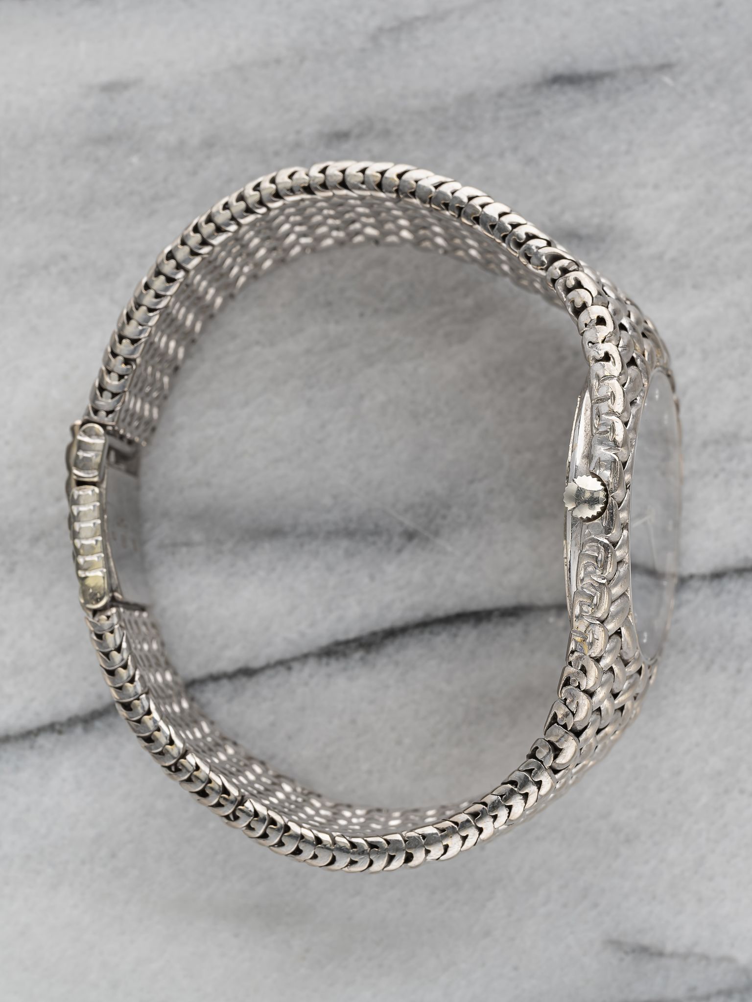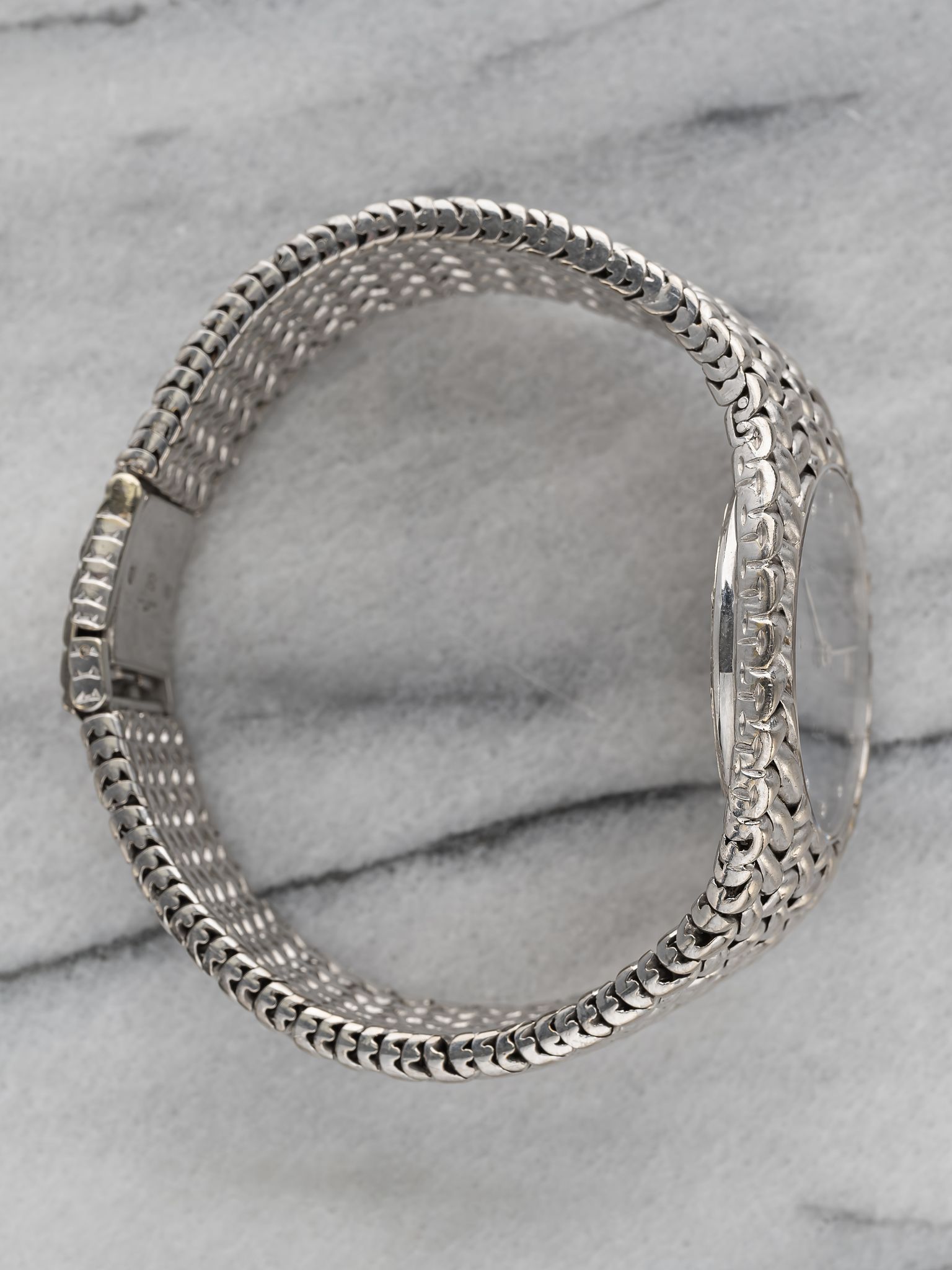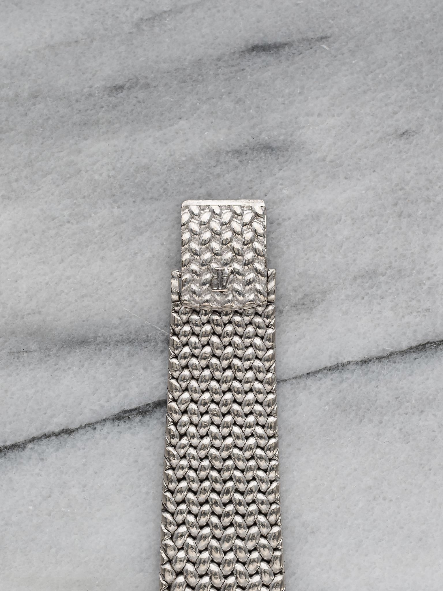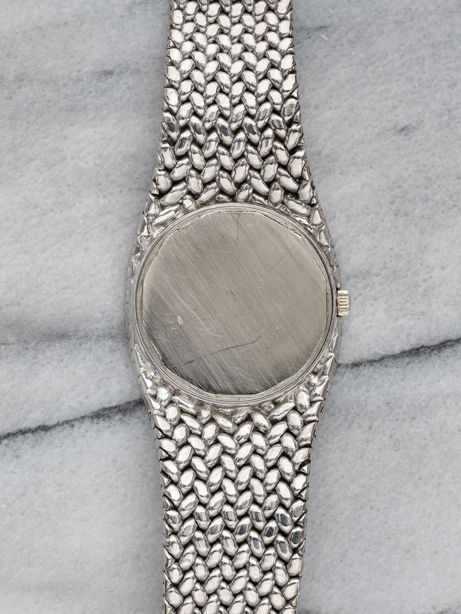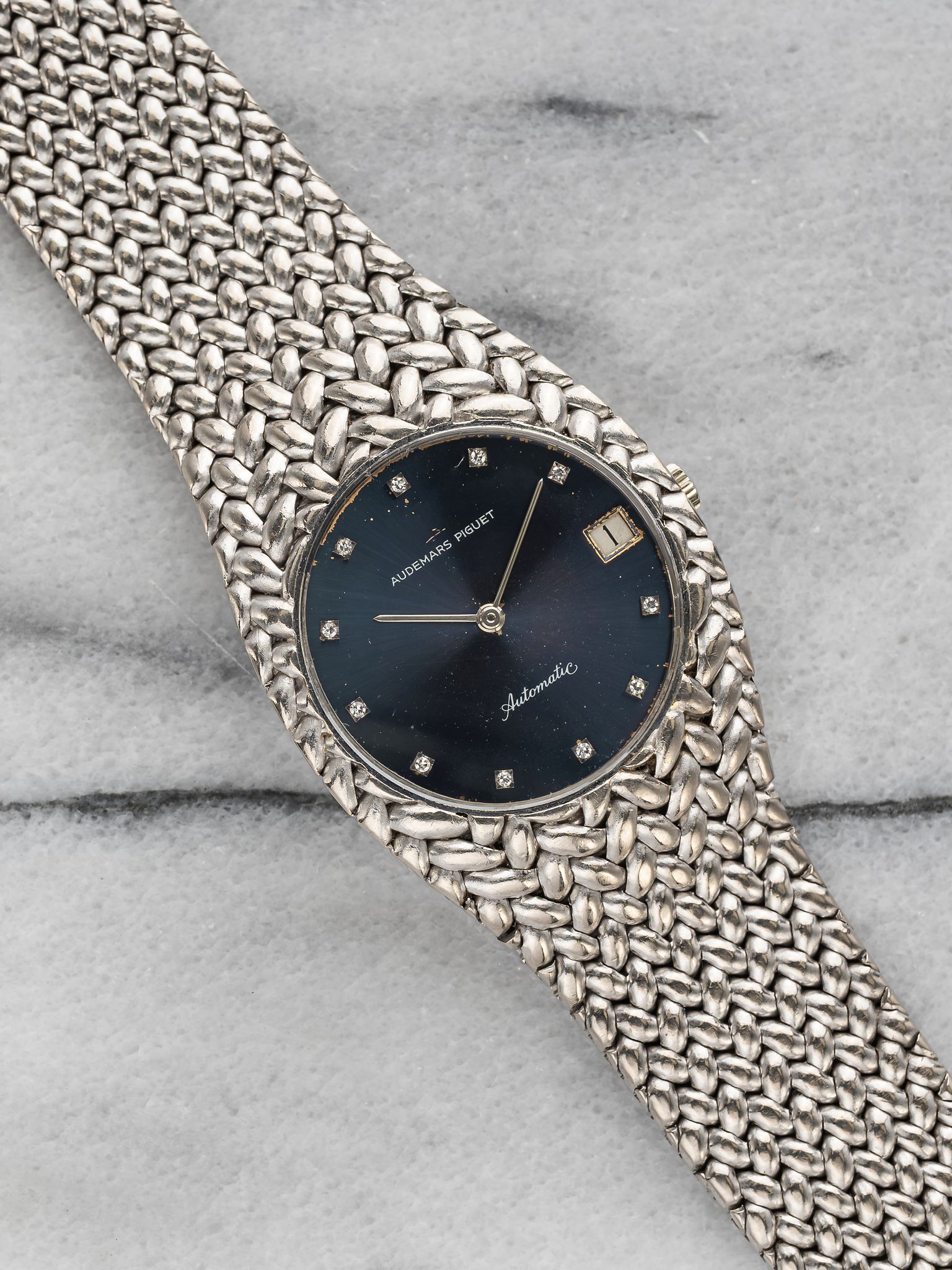 Here we have a vintage Audemars Piguet Cobra reference 5403 automatic in 18k white gold with a beautiful blue diamond dial from the 1980s (B series) Keeps great time and is fully functional. Measurements of the case is 36mm including the crown. Quickset date function at 3 o’clock. It's on its original matching integrated 18k white gold bracelet measuring 7.25 inches long with its micro adjuster. 18K white gold case and cashback. The dial has some speckling as seen in photos. The bracelet is fully integrated with a woven finish through the case. Unusual to find this in an automatic iteration. All parts are original including the dial, crown, movement, and caseback. Both the dial and case are in great cosmetic, untouched condition.