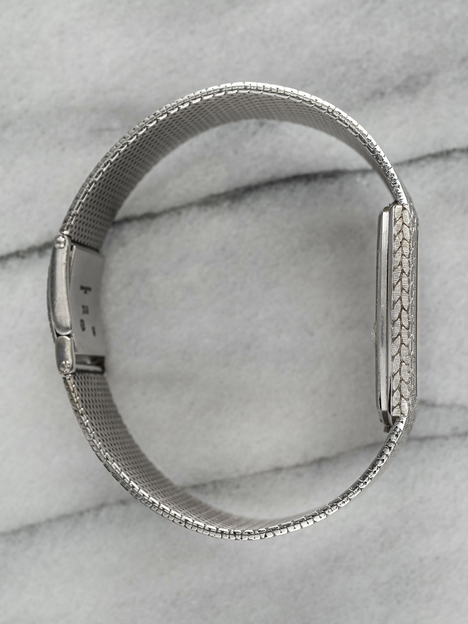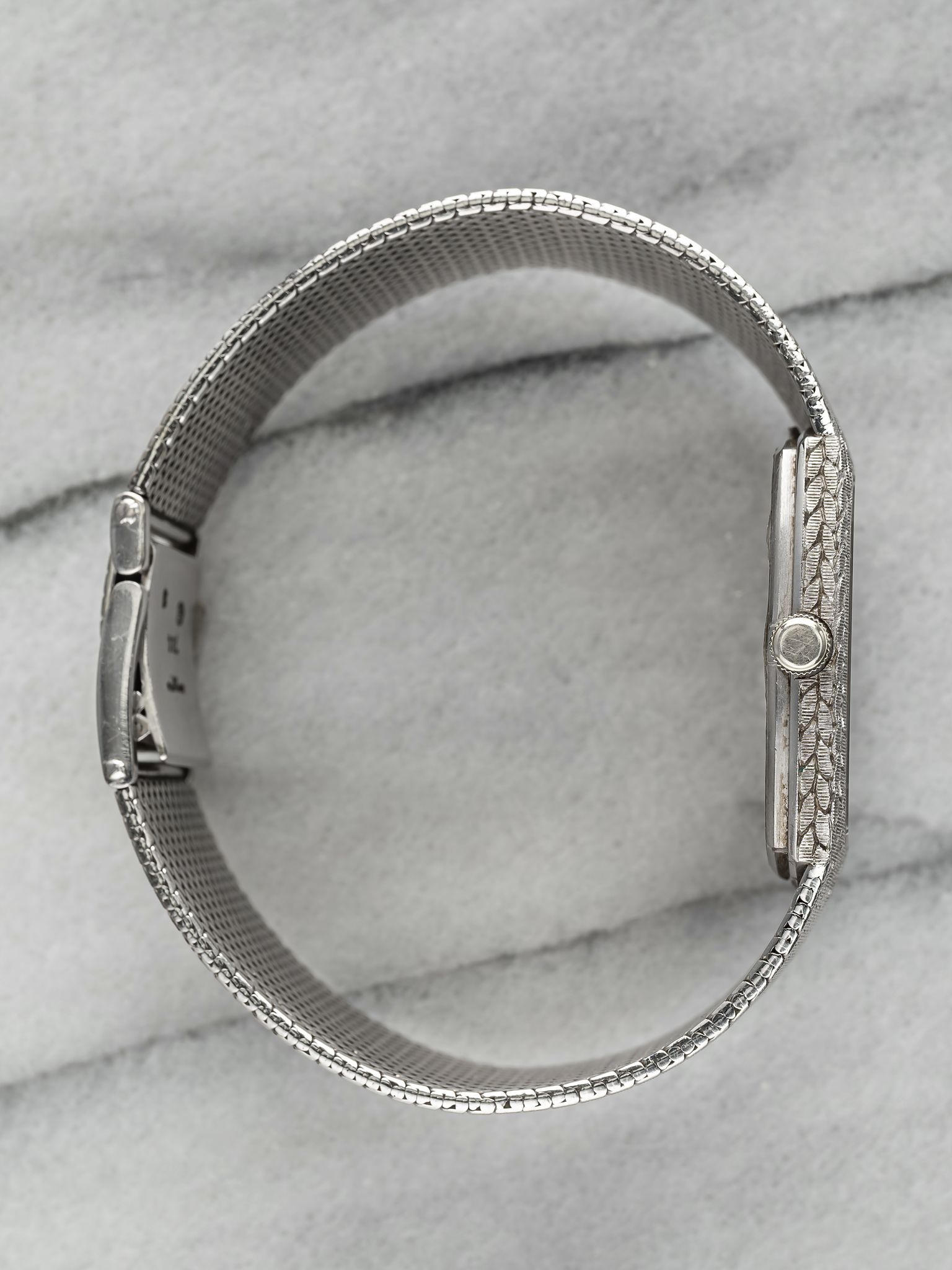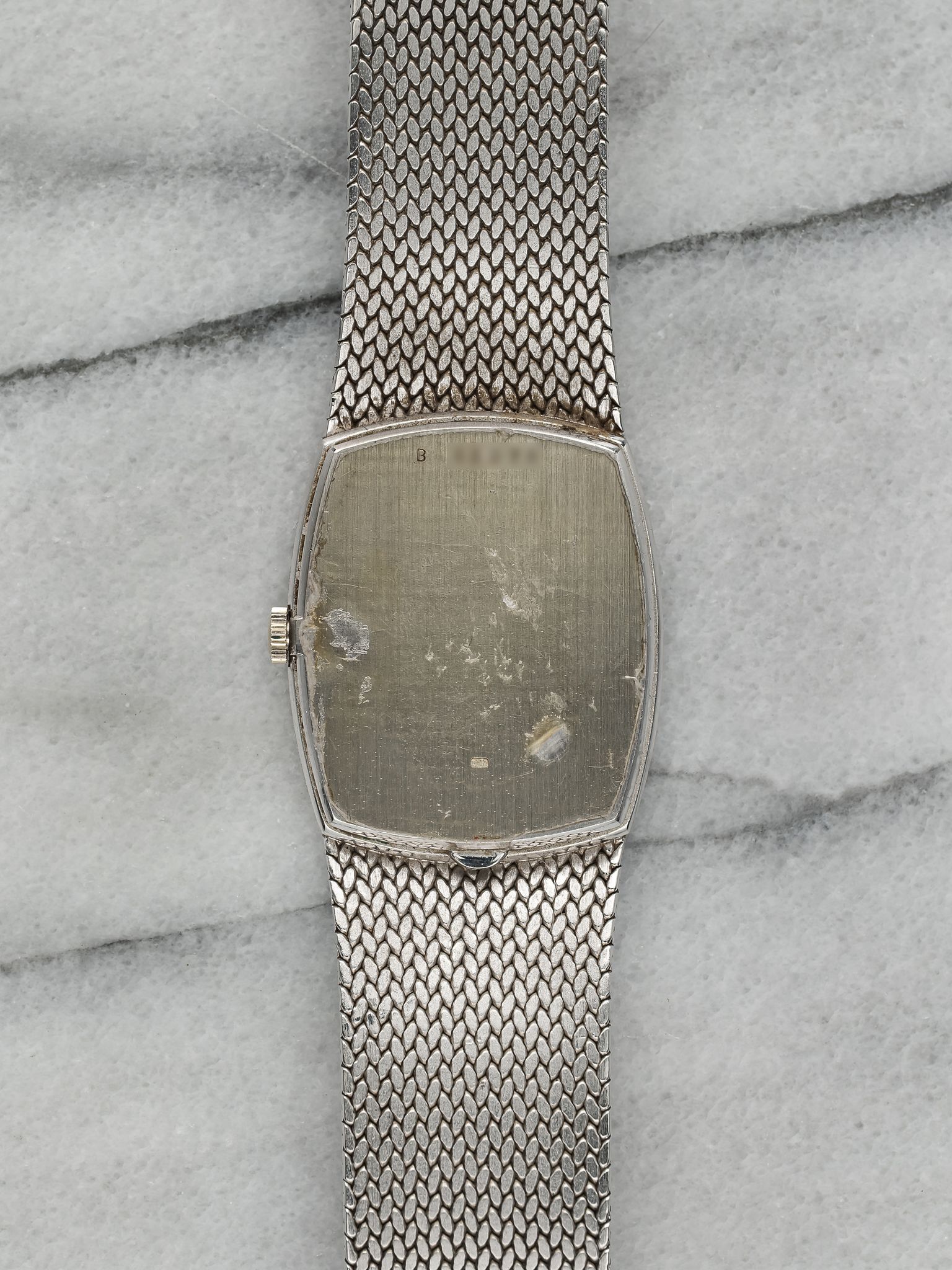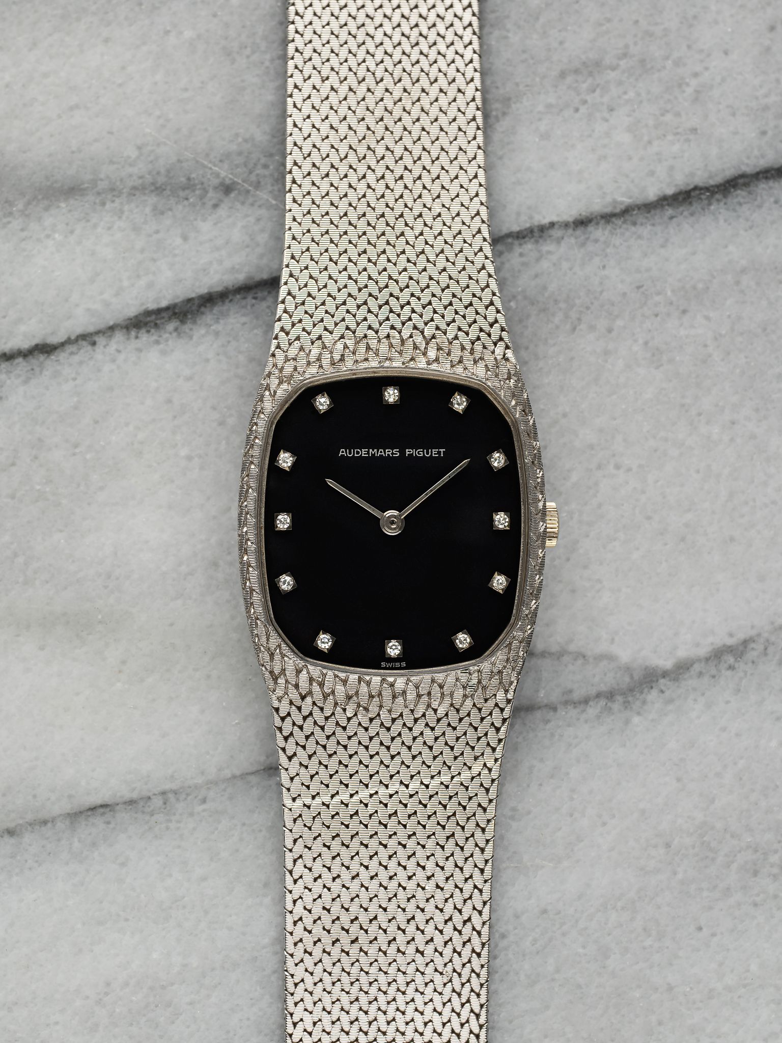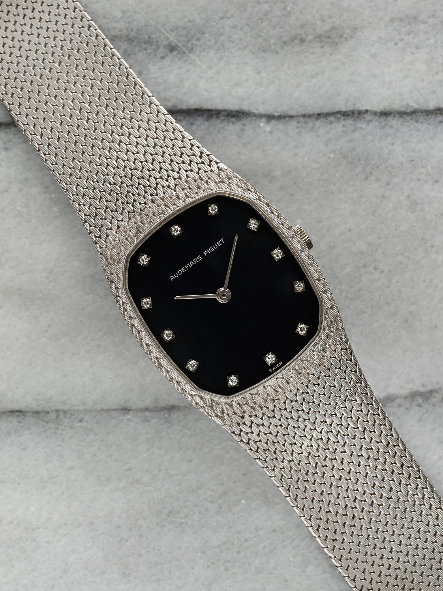 Here's a vintage Audemars Piguet Cobra manual wind in 18K white gold with a matte blue diamond dial from the 1980s. Keeps great time and is fully functional. Measurements include a 28mm case and fits up to a 7 inch wrist. It's a different design from a brand that is a one trick pony with the royal oak. There is a knot/ rope braid finishing and texture on both the bezel and bracelet. Yellow gold case and bracelet. The piece is unisex, it can be worn by both men and women. The piece is great alternative and value from other pieces offered by AP. All parts are original including the dial, case, and movement, the dial, and case are in great cosmetic, untouched condition.