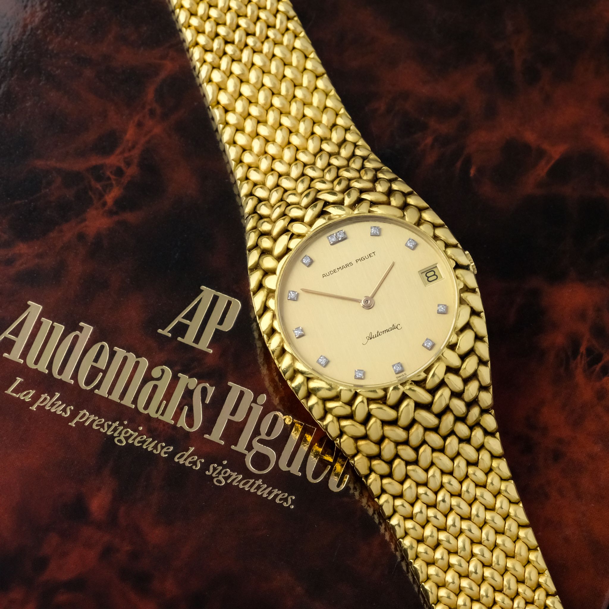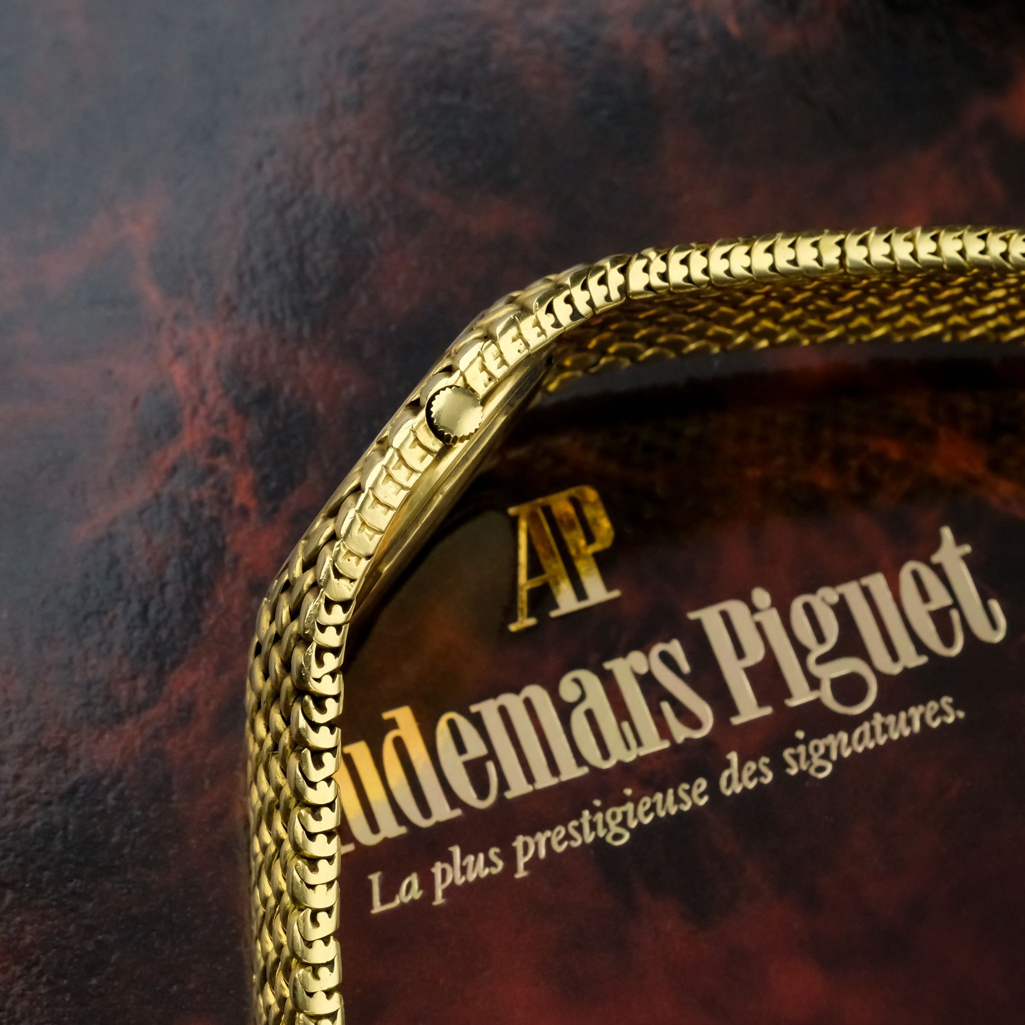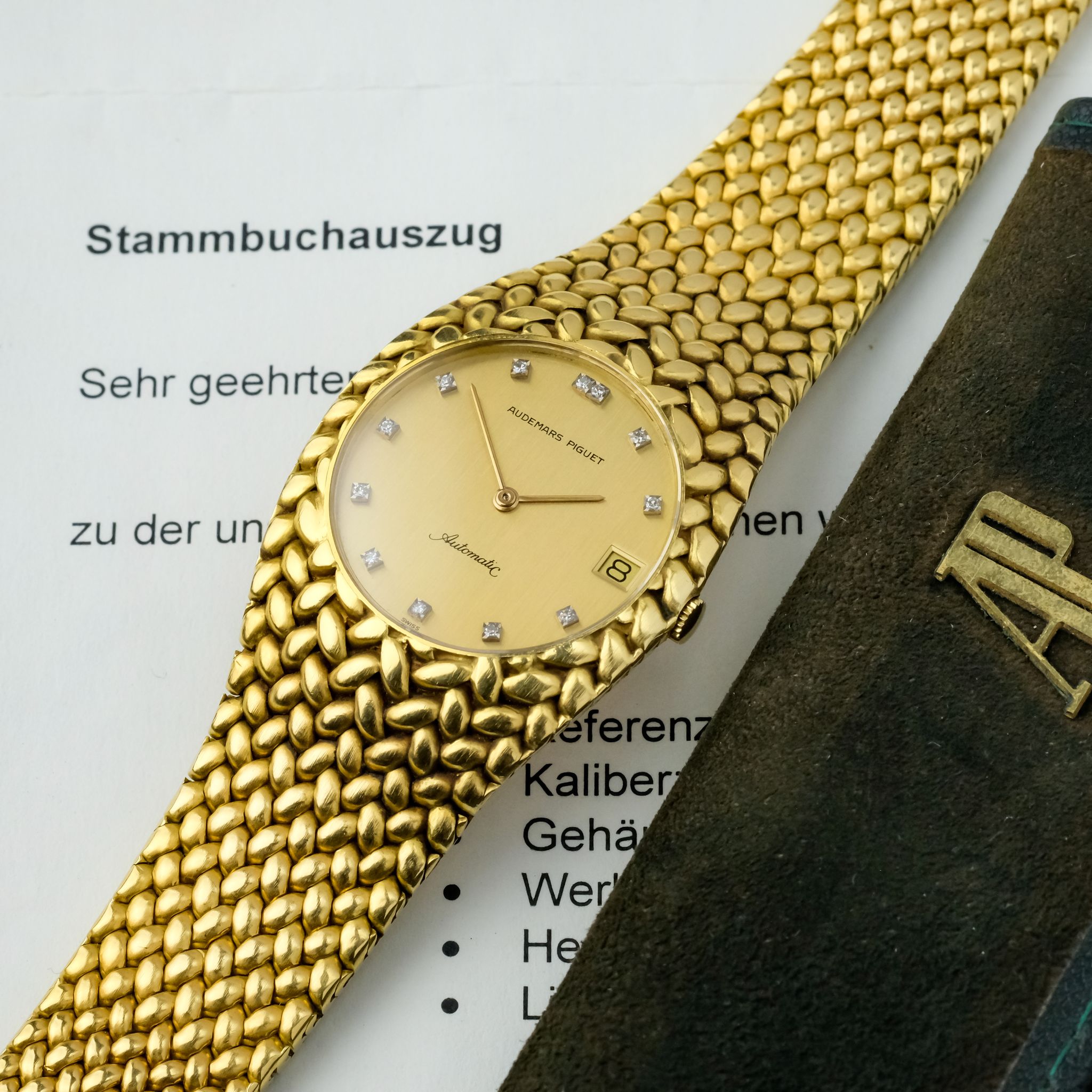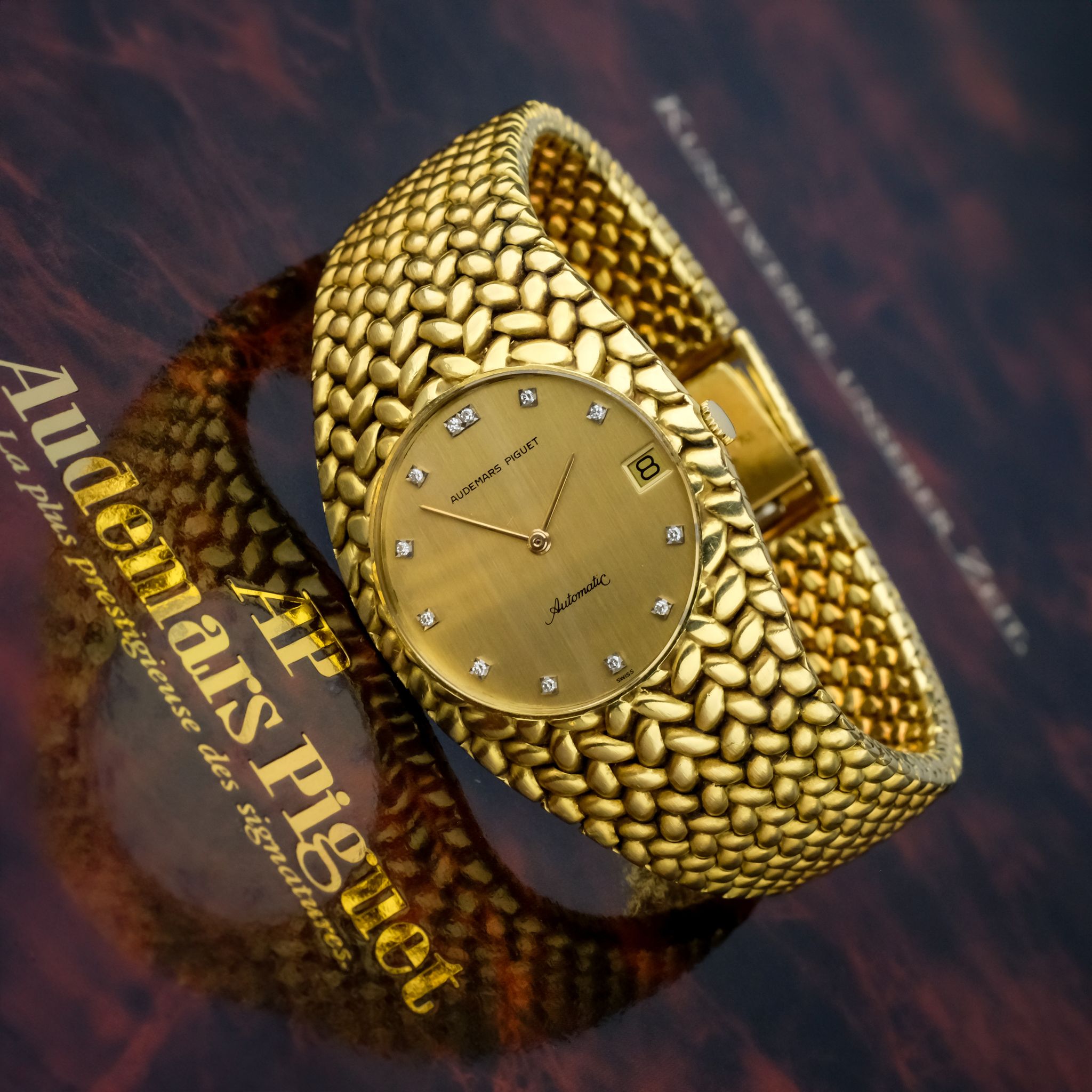 An exceptional and highly collectible piece from Audemars Piguet’s archives, the Cobra Ref. 5403 stands out as one of the maison’s most daring and innovative designs from the golden era of integrated bracelet watches. Crafted entirely in solid 18k yellow gold, the Cobra embodies avant-garde luxury with its unique flowing case and bracelet architecture, earning its name from the serpent-like aesthetic. This ultra-rare reference is elevated further by its sunburst golden dial, beautifully adorned with diamond-set indices, offering a touch of refined opulence while retaining AP’s hallmark elegance. Powered by a high-precision automatic movement, the watch blends technical excellence with striking aesthetics. Accompanied by Audemars Piguet service papers, an official extract from the archives, and its original AP leather pouch, this example represents a true grail piece for vintage AP collectors, rarely seen on the market and celebrated as a masterpiece of 1970s high horology design.